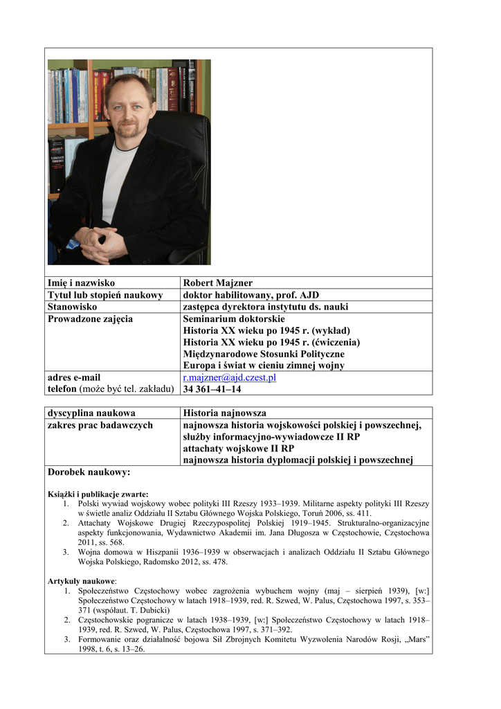 Imię i nazwisko Tytuł lub stopień naukowy Stanowisko Prowadzone zajęcia Robert Majzner doktor habilitowany, prof. AJD zastępca dyrektora instytutu ds. nauki Seminarium doktorskie Historia XX wieku po 1945 r. (wykład) Historia XX wieku po 1945 r. (ćwiczenia) Międzynarodowe Stosunki Polityczne Europa i świat w cieniu zimnej wojny [email protected] adres e-mail telefon (może być tel. zakładu) 34 361–41–14 dyscyplina naukowa zakres prac badawczych Historia najnowsza najnowsza historia wojskowości polskiej i powszechnej, służby informacyjno-wywiadowcze II RP attachaty wojskowe II RP najnowsza historia dyplomacji polskiej i powszechnej Dorobek naukowy: Książki i publikacje zwarte: 1. Polski wywiad wojskowy wobec polityki III Rzeszy 1933–1939. Militarne aspekty polityki III Rzeszy w świetle analiz Oddziału II Sztabu Głównego Wojska Polskiego, Toruń 2006, ss. 411. 2. Attachaty Wojskowe Drugiej Rzeczypospolitej Polskiej 1919–1945. Strukturalno-organizacyjne aspekty funkcjonowania, Wydawnictwo Akademii im. Jana Długosza w Częstochowie, Częstochowa 2011, ss. 568. 3. Wojna domowa w Hiszpanii 1936–1939 w obserwacjach i analizach Oddziału II Sztabu Głównego Wojska Polskiego, Radomsko 2012, ss. 478. Artykuły naukowe: 1. Społeczeństwo Częstochowy wobec zagrożenia wybuchem wojny (maj – sierpień 1939), [w:] Społeczeństwo Częstochowy w latach 1918–1939, red. R. Szwed, W. Palus, Częstochowa 1997, s. 353– 371 (współaut. T. Dubicki) 2. Częstochowskie pogranicze w latach 1938–1939, [w:] Społeczeństwo Częstochowy w latach 1918– 1939, red. R. Szwed, W. Palus, Częstochowa 1997, s. 371–392. 3. Formowanie oraz działalność bojowa Sił Zbrojnych Komitetu Wyzwolenia Narodów Rosji, „Mars” 1998, t. 6, s. 13–26. 4. Wizja „nowej Rosji” w deklaracjach programowych gen. A.A. Własowa, „Biuletyn Instytutu Filozoficzno-Historycznego WSP w Częstochowie” 1998, t. 14(5), s. 18–30. 5. Trudności aprowizacyjne Częstochowy w latach 1939–1945, „Biuletyn Instytutu FilozoficznoHistorycznego WSP w Częstochowie” 2000, t. 24(7), s. 141–164. 6. Struktura biernej obrony przeciwlotniczej Częstochowy w latach 1939–1945, „Biuletyn Instytutu Filozoficzno-Historycznego WSP w Częstochowie” 2000, t. 26(7), s. 80–97. 7. Remilitaryzacja Nadrenii w świetle dokumentów Oddziału II Sztabu Głównego Wojska Polskiego, „Biuletyn Instytutu Filozoficzno-Historycznego” 2001, nr 29(8), s.120–136. 8. Doświadczenia z wojny domowej w Hiszpanii w świetle analiz Oddziału II Sztabu Głównego WP, „Mars” 2002, t. 13, s. 111–134. 9. Attachat wojskowy przy Poselstwie/Ambasadzie RP w Berlinie w latach 1928–1939. Wytyczne organizacyjne, „Rozprawy Humanistyczne. Zeszyty Naukowe Państwowej Wyższej Szkoły Zawodowej we Włocławku”, t. I, red. J. Nałęcz-Wojtczak, Włocławek 2003, s. 169–185. 10. Geneza Anschlussu Austrii w opiniach Oddziału II Sztabu Głównego Wojska Polskiego, [w:] Niemcy – Austria – Polska w XIX i XX wieku, red. T. Dubicki, K.A. Kuczyński, Łódź 2003, s. 214–228. 11. Stanowisko władz II Rzeczypospolitej w kwestii eksportu broni do Hiszpanii, w okresie wojny domowej 1936–1939, „Teki Historyczne”, t. XXIII, red. A. Suchcitz, Londyn 2004, s. 147–173. 12. Attachés wojskowi przy Poselstwie/Ambasadzie RP w Berlinie 1928–1939, „Prace Naukowe WSP w Częstochowie. Zeszyty Historyczne”, z. VIII, red. M. Cetwiński, Częstochowa 2004, s. 87–102. 13. Wywiad morski: ruch okrętów, obserwacja portów i stoczni, [w:] Polsko-brytyjska współpraca wywiadowcza podczas II wojny światowej, t. I: Ustalenia polsko-brytyjskiej Komisji Historycznej, Warszawa 2004, (współaut. A. Pepłoński, T. Dubicki), s. 489–500. [wersja anglojęzyczna: Naval Intelligence: Movements of Ships, Surveillance of Porte and Shipyards, [w:] Intelligence Co – operation between Poland and Great Britain during World War II. The Report of the Anglo-Polish Historical Commitee, Vol.1, editors T. Dubicki, D. Nałęcz, T. Stirling, Whitehall History Publishing in assotiation with Frank Cass, London – Portland 2004, s. 490–500] 14. Wywiad lotniczy: budowa samolotów i lotnisk, wyniki bombardowań, [w:] Polsko-brytyjska współpraca wywiadowcza podczas II wojny światowej, t. I: Ustalenia polsko-brytyjskiej Komisji Historycznej, Warszawa 2004, (współaut. T. Dubicki, K. Spruch), s. 500–511. [wersja anglojęzyczna: Air Force Intelligence: the Construction of Aero planes and Airfields and the Effects of Air Raids, [w:] Intelligence Co – operation between Poland and Great Britain during World War II. The Report of the Anglo-Polish Historical Commitee, Vol.1, editors T. Dubicki, D. Nałęcz, T. Stirling, Whitehall History Publishing in assotiation with Frank Cass, London – Portland 2004, s. 501–511.] 15. Wpływ analiz Oddziału II Sztabu Głównego Wojska Polskiego na politykę zagraniczną II Rzeczypospolitej w latach 30-tych, [w:] Z dziejów Polski XIX i XX wieku. Księga jubileuszowa ofiarowana profesorowi Ryszardowi Szwedowi, red. T. Dubicki, T. Panecki, Częstochowa 2004, s. 333–354. 16. Internowanie żołnierzy Wojska Polskiego w Rumunii, [w:] Internowanie żołnierzy polskich w latach II wojny światowej, red. T. Dubicki, T. Panecki, Tarnowskie Góry 2004, s. 76–90 (współaut. T. Dubicki). 17. Prof. płk dypl. rez. Włodzimierz Marian Drzewieniecki – częstochowianin z Buffalo, „Ziemia Częstochowska”, t. XXXII, red. M. Antoniewicz, Częstochowa 2005, s. 169–189 (współaut. H. Popczyk) 18. Instrukcje ogólne dla attachés wojskowych II Rzeczypospolitej, „Zeszyty Historyczne” (Paryż) 2006, z. 157, s. 25–61. 19. Polityczne analizy wojny domowej w Hiszpanii w materiałach Oddziału II Sztabu Głównego Wojska Polskiego, „Prace Naukowe AJD w Częstochowie. Zeszyty Historyczne”, z. IX, red. M. Cetwiński, Częstochowa 2006, s. 229–242. 20. Częstochowa w przededniu wybuchu drugiej wojny światowej