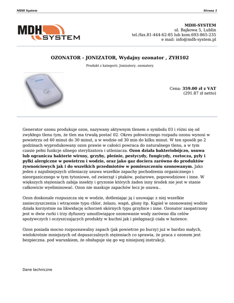 MDH System Strona 1 MDH-SYSTEM ul. Bajkowa 5, Lublin tel./fax.81-444-62-85 lub kom.693-865-235 e mail: [email protected] OZONATOR - JONIZATOR, Wydajny ozonator , ZYH102 Produkt z kategorii: Jonizatory, ozonatory Cena: 359.00 zł z VAT (291.87 zł netto) Generator ozonu produkuje ozon, nazywany aktywnym tlenem o symbolu 03 i różni się od zwykłego tlenu tym, że tlen ma trwałą postać 02. Okres połowicznego rozpadu ozonu wynosi w powietrzu od 40 minut do 30 minut, a w wodzie od 30 min do kilku minut. W ten sposób po 2 godzinach wyprodukowany ozon prawie w całości powraca do naturalnego tlenu, a w tym czasie pełni funkcje silnego sterylizatora i utleniacza. Ozon działa bakteriobójczo, usuwa lub ogranicza bakterie wirusy, grzyby, pleśnie, pestycydy, fungicydy, roztocza, pyły i pyłki alergiczne w powietrzu i wodzie, oraz jako gaz dociera zarówno do produktów żywnościowych jak i do wszelkich przedmiotów w pomieszczeniu ozonowanym. Jako jeden z najsilniejszych utleniaczy usuwa wszelkie zapachy pochodzenia organicznego i nieorganicznego w tym tytoniowe, od zwierząt i ptaków, pożarowe, popowodziowe i inne. W większych stężeniach zabija insekty i gryzonie których żaden inny środek nie jest w stanie całkowicie wyeliminować. Ozon nie maskuje zapachów lecz je usuwa.. Ozon doskonale rozpuszcza się w wodzie, dotleniając ją i usuwając z niej wszelkie zanieczyszczenia i wtrącenie typu chlor, żelazo, wapń, glony itp. Kąpiel w ozonowanej wodzie działa korzystnie na likwidację schorzeń skórnych typu grzybice i inne. Ozonator zaopatrzony jest w dwie rurki i trzy dyfuzory umożliwiające ozonowanie wody zarówno dla celów spożywczych i oczyszczających produkty w kuchni jak i pielęgnacji ciała w łazience. Ozon posiada mocno rozpoznawalny zapach (jak powietrze po burzy) już w bardzo małych, wielokrotnie mniejszych od dopuszczalnych stężeniach co sprawia, że praca z ozonem jest bezpieczna. pod warunkiem, że obsługuje się go wg niniejszej instrukcji. Dane techniczne MDH System Ozonator typ ZYH102 1.Napięcie zasilania 220-240 V/50Hz 2.Znamionowa moc pobierania < 20W 3.Znamionowa wydajność ozonu 400 mg/h 4.Wydajność pompy 3,5 l/min 5.Poziom hałasu < 35dB 6.Żywotność >4000 godz. 7.Waga brutto 1200 g (z wężami silikonowymi i dyfuzorami) 8.Obsługiwane powierzchnie 10÷40 m² 9.Wymiary 30x20x11cm (ZY-H102), 26x19x6cm (ZY-H106) 10.Programowany czas pracy 1÷30 min (ZY-H102), 5÷80 min skok 5 min (ZY-H106) Strona 2 MDH System Strona 3 11. Zalecany maksymalny czas pracy 30 min. 12.Rodzaj pracy S2-30 min (do 30 min- z przerwą min. 1 godz.) 13.Środowisko pracy: wewnątrz dobrze wentylowanych pomieszczeń bez gazów powodujących korozję Charakterystyka - Praktyczne zastosowania Oddziaływanie ozonu : - Poprzez silne utlenianie działa bakteriobójczo, wirusobójczo i grzybobójczo - Poprzez natlenianie poprawia metabolizm i odżywianie tkanek - Aktywizuje system odpornościowy - Usuwa organiczne i nieorganiczne zapachy z pomieszczeń Ozon nie maskuje zapachów lecz je usuwa! Nawet niewielkie stężenia ozonu zmniejszają lub usuwają: - Odór papierosowy oraz inne zapachy organiczne i nieorganiczne - Grzyby tworzące pleśnie np. na ścianach, zapachy stęchlizny, choroby skóry, jamy ustnej. Eliminując również zarodniki grzybów skutki działania są długotrwałe. - Roztocza - powodujące alergie ataki astmy, wyczerpanie organizmu - Drobno ustroje powodujące zakażenia bakteryjne, stany zapalne, choroby bakteryjne, gnicie żywności itp. - Pestycydy, fungicydy, azotany, oraz pleśnie i grzyby z warzyw i owoców - Hormony, anaboliki i inne zanieczyszczenia w mięsie, drobiu, owocach morza MDH System Strona 4 Oddziaływanie jonów ujemnych: - wytrącają alergeny, pyłki kwiatowe, roślinne i roztocza - jonizują ujemnie prozdrowotnie powietrze - wytrącają kurze, pyły i pyłki z pomieszczeń domowych, biurowych, handlowych itp. - wytrącają pyłki i alergeny od ptaków i zwierząt domowych Ozon 03 jest gazem nietrwałym. Okres połowicznego rozpadu nie przekracza 40 min. w czystym powietrzu i przy temperaturze 20ºC, a w zanieczyszczonym wynosi praktycznie około 30 min. Dla wody okres połowicznego rozpadu ozonu wynosi od 30 min przy temperaturze 20ºC do kilku min. przy 50ºC. Praktycznie po ok. 2 godz. ozon przechodzi całkowicie w normalny tlen O2. Dlatego generatory ozonu o wydajności do 500 mg 03/godz są bezpieczne w stosowaniu. Dopuszczalne maksymalne stężenie ozonu ( MCW) dla 8 godz./ dobę i 40 godz/tydzień wynosi 200μg/m³ (0,2 μg /m³) lub w wartościach względnych 0,1ppm (100ppb). Zalecany poziom docelowy to 120μg/m³(0,12μg/m³) lub 0,06 ppm. Ozon jest jednym z najskuteczniejszym środków dezynfekujących. Działanie bakteriobójcze wykazuje już w stężeniu około 13μg/dcm³ . Działanie bakteriobójcze ozonu jest 50 razy skuteczniejsze i 3 tysiące razy szybsze niż chlor. Praktyczne zastosowania: 1. Usuwanie bakterii, wirusów, pleśni, grzybów, fungicydów, pestycydów i azotanów z owoców i warzyw w celu ich oczyszczenia i przedłużenia świeżości i trwałości. Warzywa i owoce – maksymalny ładunek do 10 kg włożyć do plastikowego lub szklanego naczynia i zalać wodą do całkowitego zanurzenia. Umieścić w wodzie rurkę z dyfuzorem ozonatora. Włączyć ozonator na 10 min. Po zakończeniu ozonowania owoce lub warzywa pozostawić w wodzie do 10 min. poczym odlać wodę z naczynia. Warzywa i owoce mogą podlegać dalszej obróbce spożywczej. Owoce i warzywa można również ozonować zwłaszcza owoce miękkie maliny, truskawki w powietrzu umieszczając je luzem w pojemniczkach w foliowych woreczkach strunowych wprowadzając rurkę dyfuzora do torebki i zamykając ją. Czas ozonowania 10 min. Przed spożyciem odczekać 20 min. 2. Odkażanie i odświeżanie mięsa, drobiu, jaj w celu usunięcia zanieczyszczeń metalicznych, mikroorganizmów, hormonów, antybiotyków itp. Ładunek do 5 kg umieścić w nac