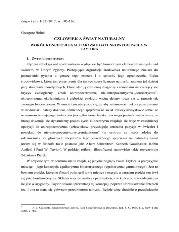 Logos i etos 1(32) 2012, ss. 105-126. Grzegorz Hołub CZŁOWIEK A ŚWIAT NATURALNY WOKÓŁ KONCEPCJI EGALITARYZMU GATUNKOWEGO PAULA W. TAYLORA 1. Zwrot biocentryczny Etyczna refleksja nad środowiskiem wydaje się być koniecznym elementem namysłu nad światem, w którym żyjemy. Postępująca degradacja środowiska naturalnego zmusza do postawienia pytania o genezę tego procesu i o sposoby jego ograniczenia. Etyka środowiskowa, która jest przestrzenią dla takiego specyficznego namysłu, zawiera już dzisiaj parę stanowisk teoretycznych, które oferują odmienną diagnozę i remedium na szerzący się kryzys ekologiczny. Obok antropocentryzmu, nie-antropocentryzmu-„sentientyzmu”, ekocentryzmu, ekofeminizmu i głębokiej ekologii, ważne debaty toczą się w ramach tak zwanego biocentryzmu. W nurcie tym utrzymuje się, że aby zahamować niekorzystne zmiany w środowisku należy dokonać odmiennego spojrzenia na świat. Należy uzmysłowić sobie, że w centrum istniejącego świata nie jest tylko istota ludzka, ale wagę posiada każda istota, w której dokonuje się dynamiczny proces życia. Biocentryzm znajduje się więc w zasadniczej opozycji do antropocentryzmu (człowiekowi przysługuje centralna pozycja w świecie) i poniekąd do nie-antropocentryzmu-„sentientyzmu” (w centrum są istoty zdolne do odczuwania). Za głównych inicjatorów tego poszerzonego spojrzenia na naturalny świat uważa się w filozofii takie postacie jak: Albert Schweitzer, Kenneth Goodpaster, Robin Attfield i Paul W. Taylor1. W polskiej refleksji filozoficznej stanowisko takie reprezentuje Zdzisława Piątek. W artykule tym, w centrum analiz znajdą się jedynie poglądy Paula Taylora, a precyzyjnie mówiąc – jego koncepcja egalitaryzmu biocentrycznego (egalitaryzmu gatunkowego). Jest to bowiem projekt, któremu filozof poświęcił wiele miejsca i energii, a zarazem projekt ten jawi się jako kontrowersyjny. Skłania więc do analizy i przemyśleń, a w końcu do stwierdzenia, na ile jest wiarygodny. Taylor dokonał prezentacji tej koncepcji poprzez sformułowanie czterech tez. I one to staną się głównym przedmiotem namysłu. Będzie więc chodziło o prześledzenie 1 J. B. Callicott, Environmental Ethics, [w:] Encyclopedia of Bioethics, red. S. G. Post, t. 2, New York 2003, s. 760. 2 ich znaczenia, zależności pomiędzy nimi, i dokonanie krytycznego spojrzenia na nie, wraz z przedstawieniem pozytywnej propozycji rozwiązania wyłaniających się z nich dylematów. Na wstępie należy jeszcze wyraźnie określić profil etyczny namysłu Paula Taylora. Prezentowana przez niego refleksja sprawia, że przekroczone zostają ramy etyki tradycyjnej, odnoszącej się zasadniczo do jednostek ludzkich i relacji międzyludzkich, w obrębie wspólnoty Homo sapiens. Ten zwrot wynika z tego, że amerykański myśliciel dostrzega konieczność objęcia refleksją etyczną także świat pozaludzki. Wymóg ten sygnalizowany jest już w podanej przez Taylora definicji etyki środowiskowej, którą określił jako refleksję nad „moralną relacją zachodzącą pomiędzy ludźmi, a naturalnym światem”2. Przez to można powiedzieć, że filozof ten zainicjował nowy typ namysłu etycznego, gdzie moralna doniosłość wynika z innego rozumienia zjawiska życia. Jest to typ etyki dla bio-wspólnoty, gdzie człowiek jest tylko jednym z gatunków i gdzie zasadniczo akcent położony jest na fenomenie życia całego naturalnego świata (wild life). 2. Tezy egalitaryzmu gatunkowego W swojej książce zatytułowanej „Szacunek dla natury. Teoria etyki środowiskowej” („Respect for Nature. A Theory of Environmental Ethics”), Paul Taylor formułuje cztery zasadnicze tezy, dotyczące statusu istot żywych i relacji, jakie je łączą. Tezy te brzmią następująco: (1) Ludzie są członkami ziemskiej wspólnoty życia w tym samym znaczeniu i na tych samych warunkach, jak inne żyjące istoty. (2) Gatunek ludzki, wraz z innymi gatunkami, jest integralnym składnikiem systemu wzajemnej zależności. Przeżycie każdej istoty – jak również jej szanse na pomyślne bądź niepomyślne życie – jest określone nie tylko przez fizyczne warunki jej środowiska, ale także przez jej relacje z innymi żyjącymi istotami. (3) Wszystkie organizmy są teleologicznymi centrami życia, w tym znaczeniu, że każdy jest niepowtarzalną jednostką, dążącą do własnego dobra, w swoisty sposób. (4) Z natury ludzie nie są wyższymi stworzeniami od innych żyjących istot3. Taylor wypracował dla tych twierdzeń odpowiednie znaczenia. Konieczne jest więc szczegółowe przyjrzenie się intencjom autora. Konieczne jest prześledzenie zasadniczych aspektów, jakie filozof ten dostrzegł i rozwinął w ramach tych tez, które określił również 2 P. W. Taylor, Respect for Nature. A Theory of Environmental Ethics, Princeton 1986, s. 3. Tamże, s. 99-100. Wcześniej autor sformułował te tezy w artykule: The Ethics of Respect for Nature, „Environmental Ethics”, t. 3, 1981, s. 197-218. 3 3 mianem przekonań (beliefs). Ważne jest również zaznaczenie w tym miejscu istotnego założenia, przyjmowanego przez Taylora. Otóż myśliciel ten analizuje status istot i zachodzących pomiędzy nimi relacji, biorąc zasadniczo pod uwagę to, co je łączy. W odniesieniu do istot ludzkich jest przekonany, że jesteśmy członkami gatunku biologicznego i to określa podstawową cechę naszego istnienia. Stąd choć uznaje istniejące różnice pomiędzy człowiekiem a resztą przyrody, to jednak nie jest nimi zainteresowany; odsuwa je poniekąd na bok4. 2.1. Człowiek obywatelem ziemskiej wspólnoty życia W ramach pierwszej tezy, Taylor wyszczególnia pięć różnych aspektów. Pierwszy z nich wskazuje na biologiczne i fizyczne wymogi istnienia i przetrwania, które człowiek dzieli z innymi istotami naturalnego świata. Wszystkie istoty, które zamieszkują naszą planetę są uzależnione w swoim trwaniu od relacji ze 
