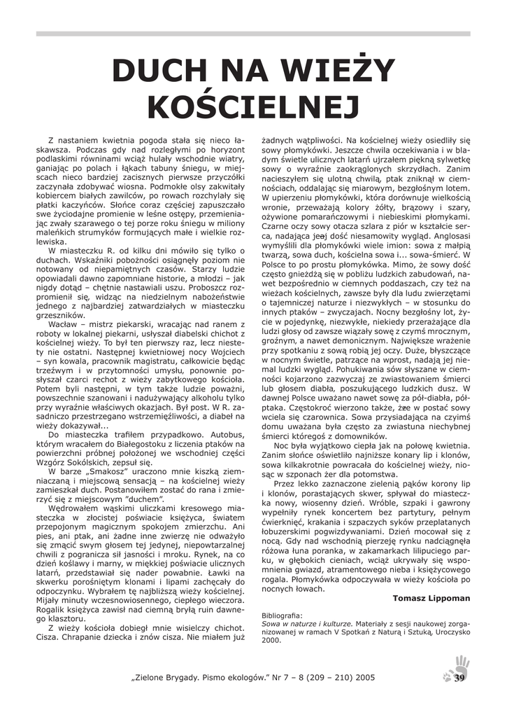 DUCH NA WIEŻY KOŚCIELNEJ Z nastaniem kwietnia pogoda stała się nieco łaskawsza. Podczas gdy nad rozległymi po horyzont podlaskimi równinami wciąż hulały wschodnie wiatry, ganiając po polach i łąkach tabuny śniegu, w miejscach nieco bardziej zacisznych pierwsze przyczółki zaczynała zdobywać wiosna. Podmokłe olsy zakwitały kobiercem białych zawilców, po rowach rozchylały się płatki kaczyńców. Słońce coraz częściej zapuszczało swe życiodajne promienie w leśne ostępy‚ przemieniając zwały szarawego o tej porze roku śniegu w miliony maleńkich strumyków formujących małe i wielkie rozlewiska. W miasteczku R. od kilku dni mówiło się tylko o duchach. Wskaźniki pobożności osiągnęły poziom nie notowany od niepamiętnych czasów. Starzy ludzie opowiadali dawno zapomniane historie, a młodzi – jak nigdy dotąd – chętnie nastawiali uszu. Proboszcz rozpromienił się‚ widząc na niedzielnym nabożeństwie jednego z najbardziej zatwardziałych w miasteczku grzeszników. Wacław – mistrz piekarski, wracając nad ranem z roboty w lokalnej piekarni, usłyszał diabelski chichot z kościelnej wieży. To był ten pierwszy raz, lecz niestety nie ostatni. Następnej kwietniowej nocy Wojciech – syn kowala, pracownik magistratu, całkowicie będąc trzeźwym i w przytomności umysłu‚ ponownie posłyszał czarci rechot z wieży zabytkowego kościoła. Potem byli następni, w tym także ludzie poważni, powszechnie szanowani i nadużywający alkoholu tylko przy wyraźnie właściwych okazjach. Był post. W R. zasadniczo przestrzegano wstrzemięźliwości, a diabeł na wieży dokazywał... Do miasteczka trafiłem przypadkowo. Autobus, którym wracałem do Białegostoku z liczenia ptaków na powierzchni próbnej położonej we wschodniej części Wzgórz Sokólskich‚ zepsuł się. W barze „Smakosz” uraczono mnie kiszką ziemniaczaną i miejscową sensacją – na kościelnej wieży zamieszkał duch. Postanowiłem zostać do rana i zmierzyć się z miejscowym ”duchem”. Wędrowałem wąskimi uliczkami kresowego miasteczka w złocistej poświacie księżyca, światem przepojonym magicznym spokojem zmierzchu. Ani pies, ani ptak, ani żadne inne zwierzę nie odważyło się zmącić swym głosem tej jedynej, niepowtarzalnej chwili z pogranicza sił jasności i mroku. Rynek, na co dzień koślawy i marny, w miękkiej poświacie ulicznych latarń‚ przedstawiał się nader powabnie. Ławki na skwerku porośniętym klonami i lipami zachęcały do odpoczynku. Wybrałem tę najbliższą wieży kościelnej. Mijały minuty wczesnowiosennego, ciepłego wieczora. Rogalik księżyca zawisł nad ciemną bryłą ruin dawnego klasztoru. Z wieży kościoła dobiegł mnie wisielczy chichot. Cisza. Chrapanie dziecka i znów cisza. Nie miałem już żadnych wątpliwości. Na kościelnej wieży osiedliły się sowy płomykówki. Jeszcze chwila oczekiwania i w bladym świetle ulicznych latarń ujrzałem piękną sylwetkę sowy o wyraźnie zaokrąglonych skrzydłach. Zanim nacieszyłem się ulotną chwilą‚ ptak zniknął w ciemnościach‚ oddalając się miarowym, bezgłośnym lotem. W upierzeniu płomykówki, która dorównuje wielkością wronie, przeważają kolory żółty, brązowy i szary, ożywione pomarańczowymi i niebieskimi płomykami. Czarne oczy sowy otacza szlara z piór w kształcie serca‚ nadająca jeaj dość niesamowity wygląd. Anglosasi wymyślili dla płomykówki wiele imion: sowa z małpią twarzą, sowa duch, kościelna sowa i... sowa-śmierć. W Polsce to po prostu płomykówka. Mimo, że sowy dość często gnieżdżą się w pobliżu ludzkich zabudowań, nawet bezpośrednio w ciemnych poddaszach, czy też na wieżach kościelnych, zawsze były dla ludu zwierzętami o tajemniczej naturze i niezwykłych – w stosunku do innych ptaków – zwyczajach. Nocny bezgłośny lot, życie w pojedynkę, niezwykłe, niekiedy przerażające dla ludzi głosy od zawsze wiązały sowę z czymś mrocznym, groźnym‚ a nawet demonicznym. Największe wrażenie przy spotkaniu z sową robią jej oczy. Duże, błyszczące w nocnym świetle, patrzące na wprost, nadają jej niemal ludzki wygląd. Pohukiwania sów słyszane w ciemności kojarzono zazwyczaj ze zwiastowaniem śmierci lub głosem diabła‚ poszukującego ludzkich dusz. W dawnej Polsce uważano nawet sowę za pół-diabła, półptaka. Częstokroć wierzono także, żze w postać sowy wciela się czarownica. Sowa przysiadająca na czyimś domu uważana była często za zwiastuna niechybnej śmierci któregoś z domowników. Noc była wyjątkowo ciepła jak na połowę kwietnia. Zanim słońce oświetliło najniższe konary lip i klonów, sowa kilkakrotnie powracała do kościelnej wieży‚ niosąc w szponach żer dla potomstwa. Przez lekko zaznaczone zielenią pąków korony lip i klonów, porastających skwer, spływał do miasteczka nowy, wiosenny dzień. Wróble, szpaki i gawrony wypełniły rynek koncertem bez partytury, pełnym ćwierknięć, krakania i szpaczych syków przeplatanych łobuzerskimi pogwizdywaniami. Dzień mocował się z nocą. Gdy nad wschodnią pierzeję rynku nadciągnęła różowa łuna poranka, w zakamarkach lilipuciego parku, w głębokich cieniach, wciąż ukrywały się wspomnienia gwiazd, atramentowego nieba i księżycowego rogala. Płomykówka odpoczywała w wieży kościoła po nocnych łowach. Tomasz Lippoman Bibliografia: Sowa w naturze i kulturze. Materiały z sesji naukowej zorganizowanej w ramach V Spotkań z Naturą i Sztuką‚ Uroczysko 2000. „Zielone Brygady. Pismo ekologów.” Nr 7 – 8 (209 – 210) 2005 39