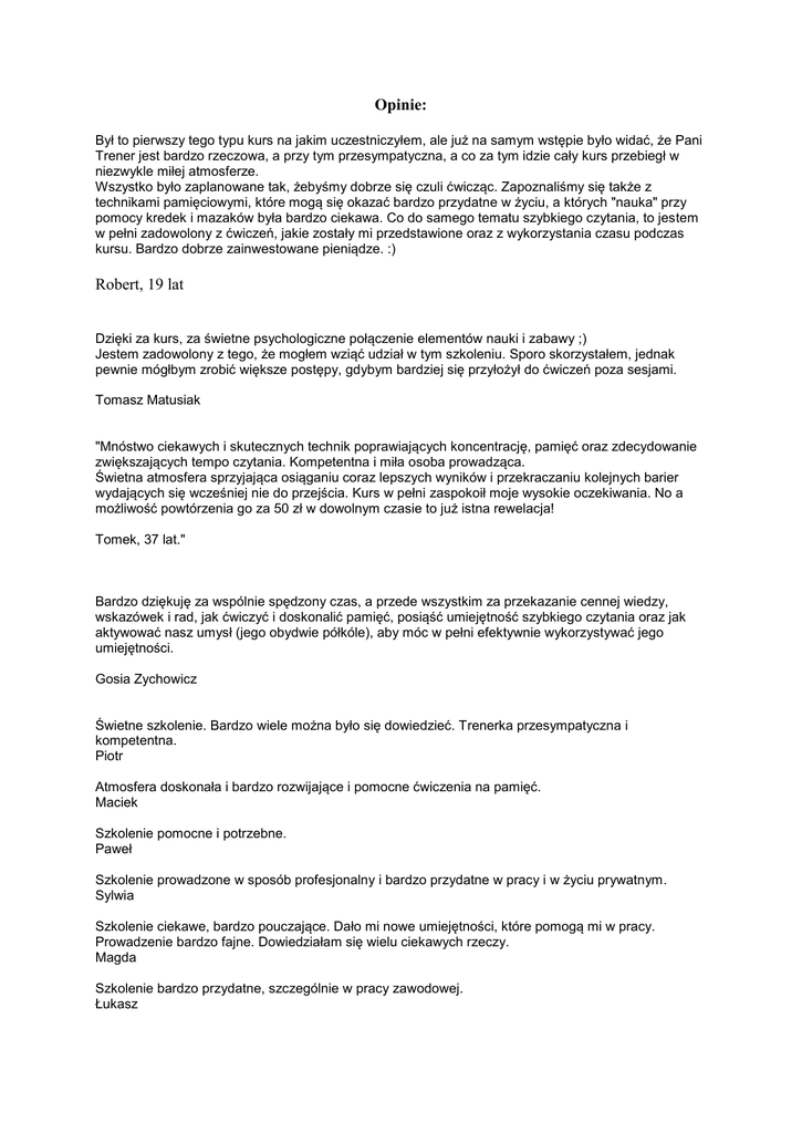 Opinie: Był to pierwszy tego typu kurs na jakim uczestniczyłem, ale już na samym wstępie było widać, że Pani Trener jest bardzo rzeczowa, a przy tym przesympatyczna, a co za tym idzie cały kurs przebiegł w niezwykle miłej atmosferze. Wszystko było zaplanowane tak, żebyśmy dobrze się czuli ćwicząc. Zapoznaliśmy się także z technikami pamięciowymi, które mogą się okazać bardzo przydatne w życiu, a których "nauka" przy pomocy kredek i mazaków była bardzo ciekawa. Co do samego tematu szybkiego czytania, to jestem w pełni zadowolony z ćwiczeń, jakie zostały mi przedstawione oraz z wykorzystania czasu podczas kursu. Bardzo dobrze zainwestowane pieniądze. :) Robert, 19 lat Dzięki za kurs, za świetne psychologiczne połączenie elementów nauki i zabawy ;) Jestem zadowolony z tego, że mogłem wziąć udział w tym szkoleniu. Sporo skorzystałem, jednak pewnie mógłbym zrobić większe postępy, gdybym bardziej się przyłożył do ćwiczeń poza sesjami. Tomasz Matusiak "Mnóstwo ciekawych i skutecznych technik poprawiających koncentrację, pamięć oraz zdecydowanie zwiększających tempo czytania. Kompetentna i miła osoba prowadząca. Świetna atmosfera sprzyjająca osiąganiu coraz lepszych wyników i przekraczaniu kolejnych barier wydających się wcześniej nie do przejścia. Kurs w pełni zaspokoił moje wysokie oczekiwania. No a możliwość powtórzenia go za 50 zł w dowolnym czasie to już istna rewelacja! Tomek, 37 lat." Bardzo dziękuję za wspólnie spędzony czas, a przede wszystkim za przekazanie cennej wiedzy, wskazówek i rad, jak ćwiczyć i doskonalić pamięć, posiąść umiejętność szybkiego czytania oraz jak aktywować nasz umysł (jego obydwie półkóle), aby móc w pełni efektywnie wykorzystywać jego umiejętności. Gosia Zychowicz Świetne szkolenie. Bardzo wiele można było się dowiedzieć. Trenerka przesympatyczna i kompetentna. Piotr Atmosfera doskonała i bardzo rozwijające i pomocne ćwiczenia na pamięć. Maciek Szkolenie pomocne i potrzebne. Paweł Szkolenie prowadzone w sposób profesjonalny i bardzo przydatne w pracy i w życiu prywatnym. Sylwia Szkolenie ciekawe, bardzo pouczające. Dało mi nowe umiejętności, które pomogą mi w pracy. Prowadzenie bardzo fajne. Dowiedziałam się wielu ciekawych rzeczy. Magda Szkolenie bardzo przydatne, szczególnie w pracy zawodowej. Łukasz Trenerka jest osobą sympatyczną, miłą i życzliwą. Jest otwarta na nowe propozycje i posiada dużą wiedzę merytoryczną. Piotr Bardzo interesujące szkolenie z wieloma ciekawymi praktycznymi ćwiczeniami. Polecam ćwiczenie z zapamiętywania łańcuszkowego. Paweł Niesamowicie przydatne i budujące szkolenie. Urszula Super szkolenie. Spełniło moje wszystkie oczekiwania. Gosia Szkolenie profesjonalne i przydatne. Grzegorz Zupełnie nowa dla mnie technika prowadzenia szkolenia. Zaskakująca i bardzo ciekawa. Na pewno jest to szkolenie pozostawiające dobre i niezapomniane wrażenie. Sylwia Ciekawa forma i profesjonalne podejście trenera, umiejętne zaangażowanie uczestników. Aktywność Ania Bardzo dynamiczny styl prowadzenia zajęć, szybki sposób na nabycie umiejętności znacznie ułatwiających pracę. Agnieszka Bardzo fajne i pomocne szkolenie, dzięki niemu mogę teraz czytać szybciej i z przyjemnością oraz nauczyłem się szybko zapamiętywać. Sebastian Bardzo pożyteczne szkolenie. Chętnie polecę innym. Paweł Szkolenie bardzo dobrze zorganizowane, mocne zaangażowanie uczestników przez trenera. Ryszard Pozytywnie-kreatywnie;-) Klaudiusz Szkolenie w pełni spełniło moje oczekiwania – poprawiło to moje zdolności zrozumienia tekstu czytanego. Szkolenie prowadzone w miłej atmosferze pozwalającej na skupienie. Justyna Przydatne szkolenie, na pewno polecę znajomym. Artur Praktyczne informacje, przydatna wiedza, ciekawy i dynamiczny sposób prowadzenia. Marta Przydatne, interesujące. Jestem zadowolony. Wiktor Godne polecenia, szczególnie w zakresie technik pamięciowych. Merytorycznie, miło i sympatycznie. Janusz Bardzo interesujące. Umiejętności nabyte bardzo pożyteczne. Marcin Szkolenie bardzo ciekawe, uczące bardzo świeżego podejścia do czytania oraz zapamiętywania. Miła atmosfera, profesjonalna prowadząca oraz bardzo smaczne „domowej roboty” ciasteczka;-) Piotr Szkolenie przebiegało bardzo ciekawie. Na każdej lekcji było widać wyraźne efekty! Nauczyciel tłumaczył wszystko w sposób jasny. Eliza To szkolenie bardzo dużo daje i jest przydatne na całe życie. Ola Dzięki temu szkoleniu nauczyłem się szybciej czytać i mieć lepsze zrozumienie. Mam nadzieję, że nie będę już miał problemów ze sprawdzianami z treści lektury. Mateusz, 12 lat. To szkolenie bardzo pomaga w nauce lub w pracy, pomaga też w rozrywce ponieważ można więcej przeczytać w krótszym czasie. Michał, 10 lat Szkolenie bardzo miło zorganizowane. Dzięki niemu mogę o wiele szybciej czytać, łatwiej zapamiętywać. Ines, 12 lat Szkolenie jest świetne, bardzo pomaga, ćwiczenia są konkretne. Piotr Szkolenie świetnie poprowadzone, bardzo dobrze zorganizowane. Trenerka bardzo otwarta, sympatyczna, łatwo nawiązywała kontakt z wszystkimi uczestnikami. Świetnie potrafiła zmotywować do pracy tych mniej zmotywowanych i nie wierzących we własne siły czy skuteczność ćwiczeń. Helena Szkolenie bardzo przydatne. Przyznam szczerze, że podchodziłem do niego bardzo sceptycznie na początku i nie dowierzałem, że można tak szybko czytać. Cieszę się, że zdecydowałem się na nie. Do zobaczenia na kolejnym szkoleniu! Sławek Kurs był bardzo przydatny, zajęcia odbywały się w przemiłej atmosferze. Pomimo dość trudnej grupy zawodowej, jaką są nauczyciele Pani Alicja potrafiła w pełni nad nami zapanować. Lidia, nauczycielka Szkolenie bardzo mi się podobało i mam nadzieję, że wykorzystam zdobyte tutaj umiejętności w domu i w pracy. Szkolenie było bardzo profesjonalnie poprowadzone.