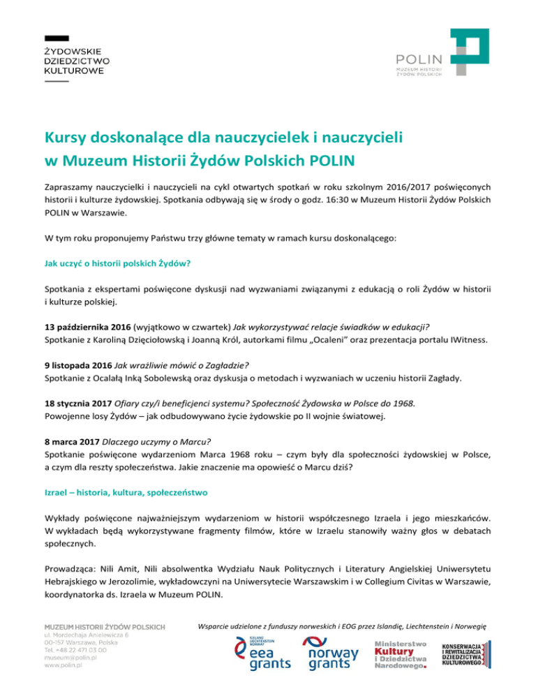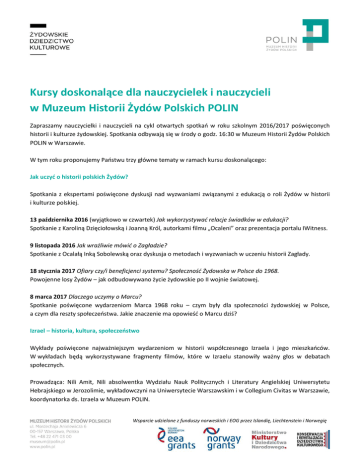 Kursy doskonalące dla nauczycielek i nauczycieli w Muzeum Historii Żydów Polskich POLIN Zapraszamy nauczycielki i nauczycieli na cykl otwartych spotkań w roku szkolnym 2016/2017 poświęconych historii i kulturze żydowskiej. Spotkania odbywają się w środy o godz. 16:30 w Muzeum Historii Żydów Polskich POLIN w Warszawie. W tym roku proponujemy Państwu trzy główne tematy w ramach kursu doskonalącego: Jak uczyć o historii polskich Żydów? Spotkania z ekspertami poświęcone dyskusji nad wyzwaniami związanymi z edukacją o roli Żydów w historii i kulturze polskiej. 13 października 2016 (wyjątkowo w czwartek) Jak wykorzystywać relacje świadków w edukacji? Spotkanie z Karoliną Dzięciołowską i Joanną Król, autorkami filmu „Ocaleni” oraz prezentacja portalu IWitness. 9 listopada 2016 Jak wrażliwie mówić o Zagładzie? Spotkanie z Ocalałą Inką Sobolewską oraz dyskusja o metodach i wyzwaniach w uczeniu historii Zagłady. 18 stycznia 2017 Ofiary czy/i beneficjenci systemu? Społeczność Żydowska w Polsce do 1968. Powojenne losy Żydów – jak odbudowywano życie żydowskie po II wojnie światowej. 8 marca 2017 Dlaczego uczymy o Marcu? Spotkanie poświęcone wydarzeniom Marca 1968 roku – czym były dla społeczności żydowskiej w Polsce, a czym dla reszty społeczeństwa. Jakie znaczenie ma opowieść o Marcu dziś? Izrael – historia, kultura, społeczeństwo Wykłady poświęcone najważniejszym wydarzeniom w historii współczesnego Izraela i jego mieszkańców. W wykładach będą wykorzystywane fragmenty filmów, które w Izraelu stanowiły ważny głos w debatach społecznych. Prowadząca: Nili Amit, Nili absolwentka Wydziału Nauk Politycznych i Literatury Angielskiej Uniwersytetu Hebrajskiego w Jerozolimie, wykładowczyni na Uniwersytecie Warszawskim i w Collegium Civitas w Warszawie, koordynatorka ds. Izraela w Muzeum POLIN. Wsparcie udzielone z funduszy norweskich i EOG przez Islandię, Liechtenstein i Norwegię 26 października 2016 23 listopada 2016 7 grudnia 2016 15 marca 2017 29 marca 2017 26 marca 2017 Początki Syjonizmu i współczesnego osadnictwa żydowskiego w Erec Izrael Sabra- nowe pokolenie Odrodzenie Języka Hebrajskiego Rola Biblii w Izraelu Wojna Sześciodniowa i Wojna Yom Kippur Izrael i Szoa 1000 lat historii Żydów w Polsce Zwiedzanie wystawy stałej Muzeum POLIN. Każde spotkanie to pogłębiony wykład historyczny w przestrzeni kolejnych galerii, który umożliwi szczegółowe poznanie losów polskich Żydów w poszczególnych epokach. 19 października 2016 2 listopada 2016 30 listopada 2016 14 grudnia 2016 4 stycznia 2016 1 lutego 2016 22 marca 2016 Spacer ścieżką „Życie” – cykl życia w tradycji żydowskiej Średniowiecze – oprowadzanie po galerii Pierwsze Spotkania Nowożytność – oprowadzanie po galeriach Paradisus Judaeorum i Miasteczko XIX wiek – oprowadzanie po galerii Wyzwania nowoczesności Międzywojnie – oprowadzanie po galerii Ulica II wojna światowa – oprowadzanie galerii Zagłada Powojnie – oprowadzanie galerii Powojnie Udział w spotkaniach jest bezpłatny, ale obowiązuje internetowa rezerwacja miejsc. Więcej informacji: http://www.polin.pl/pl/wydarzenie/cykl-otwartych-spotkan-dla-nauczycieli-20162017 Przyjdź z klasą do Muzeum Historii Żydów Polskich POLIN! Przygotowaliśmy specjalny pakiet informacji o historii i kulturze Żydów polskich. Mogą z niego skorzystać nauczyciele, którzy planują wizytę w naszym muzeum. >>materiały są do pobrania tutaj Warsztaty edukacyjne dla dzieci i młodzieży szkolnej przedstawiają 1000-letnią historię Żydów polskich jako integralną część historii Polski. Uczą tolerancji, otwartości na świat i akceptacji różnorodności kulturowej. Zostały przygotowane przez specjalistów, którzy dopasowali je do podstawy programowej różnych przedmiotów nauczania. Zachęcamy do rezerwacji! >>więcej informacji i szczegóły organizacyjne dotyczące warsztatów Wsparcie udzielone z funduszy norweskich i EOG przez Islandię, Liechtenstein i Norwegię Dzięki udziałowi w programie „Muzeum za złotówkę” dzieci powyżej 7 roku życia oraz ucząca się młodzież do 26 roku życia mogą obejrzeć wystawę stałą Muzeum POLIN, kupując bilet w cenie 1 złoty. Zachęcamy do zapoznania się ze szczegółami i do rezerwacji terminów. >>oprowadzanie po wystawie stałej Spotkania ze świadkami historii. Ideą programu jest poznawanie historii poprzez rozmowę. Uczennice i uczniowie gimnazjów i szkół ponadgimnazjalnych regularnie spotykają się ze świadkami historii ze Stowarzyszenia „Dzieci Holocaustu" oraz Towarzystwa Sprawiedliwych wśród Narodów Świata. >>harmonogram spotkań i szczegóły organizacyjne Wsparcie udzielone z funduszy norweskich i EOG przez Islandię, Liechtenstein i Norwegię