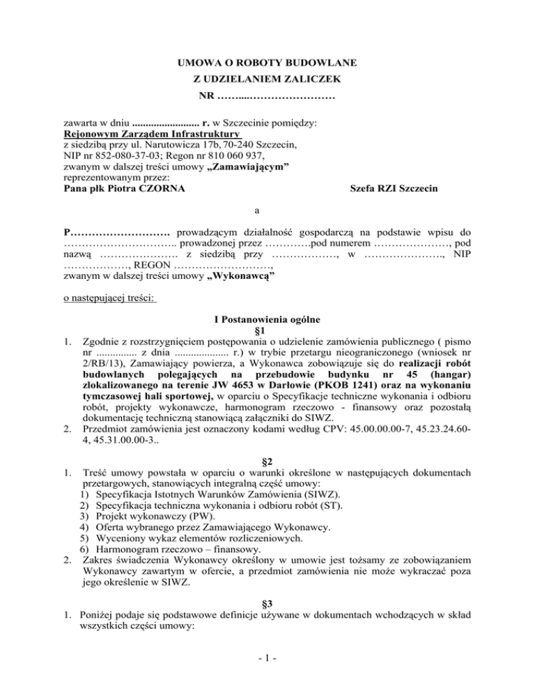 UMOWA O ROBOTY BUDOWLANE Z UDZIELANIEM ZALICZEK NR ……....…………………… zawarta w dniu ......................... r. w Szczecinie pomiędzy: Rejonowym Zarządem Infrastruktury z siedzibą przy ul. Narutowicza 17b, 70-240 Szczecin, NIP nr 852-080-37-03; Regon nr 810 060 937, zwanym w dalszej treści umowy „Zamawiającym” reprezentowanym przez: Pana płk Piotra CZORNA Szefa RZI Szczecin a P………………………. prowadzącym działalność gospodarczą na podstawie wpisu do ………………………….. prowadzonej przez ………….pod numerem …………………, pod nazwą …………………. z siedzibą przy ………………, w …………………., NIP ………………, REGON ………………………, zwanym w dalszej treści umowy „Wykonawcą” o następującej treści: 1. 2. I Postanowienia ogólne §1 Zgodnie z rozstrzygnięciem postępowania o udzielenie zamówienia publicznego ( pismo nr ............... z dnia .................... r.) w trybie przetargu nieograniczonego (wniosek nr 2/RB/13), Zamawiający powierza, a Wykonawca zobowiązuje się do realizacji robót budowlanych polegających na przebudowie budynku nr 45 (hangar) zlokalizowanego na terenie JW 4653 w Darłowie (PKOB 1241) oraz na wykonaniu tymczasowej hali sportowej, w oparciu o Specyfikacje techniczne wykonania i odbioru robót, projekty wykonawcze, harmonogram rzeczowo - finansowy oraz pozostałą dokumentację techniczną stanowiącą załączniki do SIWZ. Przedmiot zamówienia jest oznaczony kodami według CPV: 45.00.00.00-7, 45.23.24.604, 45.31.00.00-3.. §2 Treść umowy powstała w oparciu o warunki określone w następujących dokumentach przetargowych, stanowiących integralną część umowy: 1) Specyfikacja Istotnych Warunków Zamówienia (SIWZ). 2) Specyfikacja techniczna wykonania i odbioru robót (ST). 3) Projekt wykonawczy (PW). 4) Oferta wybranego przez Zamawiającego Wykonawcy. 5) Wyceniony wykaz elementów rozliczeniowych. 6) Harmonogram rzeczowo – finansowy. 2. Zakres świadczenia Wykonawcy określony w umowie jest tożsamy ze zobowiązaniem Wykonawcy zawartym w ofercie, a przedmiot zamówienia nie może wykraczać poza jego określenie w SIWZ. 1. §3 1. Poniżej podaje się podstawowe definicje używane w dokumentach wchodzących w skład wszystkich części umowy: -1- 1) Cena umowna jest to podane w umowie wynagrodzenie wykonawcy za wykonanie przedmiotu umowy wraz z usunięciem wad ujawnionych przy odbiorze w okresie rękojmi oraz w okresie gwarancji jakości. 2) Data rozpoczęcia jest to data podana w umowie, w której wykonawca ma rozpocząć realizację robót. 3) Data zakończenia jest to faktyczna data zakończenia robót, potwierdzona zapisem kierownika budowy w dzienniku budowy, zgodna z ustaleniami protokołu odbioru końcowego. 4) Dokumentacja projektowa obejmuje rysunki, obliczenia i inne dokumenty przygotowane przez zamawiającego w czasie trwania umowy inne rysunki uzupełniające te dokumenty. 5) Inspektor nadzoru inwestorskiego jest to osoba ustanowiona przez zamawiającego jako jego przedstawiciel upoważniony do pełnienia obowiązków zgodnie z ustawą PB. 6) Kierownik zamawiającego jest to osoba lub organ uprawniony do zarządzania zamawiającym i podejmowania decyzji w imieniu zamawiającego, w zrozumieniu ustawy PZP. 7) Nadzór autorski są to czynności sprawowane przez autora projektu, polegające na sprawdzaniu zgodności realizacji robót z dokumentacją projektową i uzgadnianiu możliwości wprowadzania w razie potrzeby rozwiązań zamiennych, zgodnie z ustawą PB. 8) Oferta wybranego wykonawcy jest to dokument przedłożony zamawiającemu przez wykonawcę w czasie postępowania w sprawie zamówienia publicznego. 9) Okres zgłaszania wad przez użytkownika jest to podany w umowie okres, w którym mogą być zgłaszane wady do usunięcia przez wykonawcę w ramach gwarancji jakości wykonania oraz rękojmi za wady fizyczne, udzielonej przez wykonawcę. 10) Podwykonawca jest to osoba fizyczna lub prawna, która zawarła umowę z wykonawcą na wykonanie części robót objętych umową. 11) Roboty budowlane należy przez to rozumieć wykonanie robót budowlanych w zakresie podanym w umowie. 12) Roboty tymczasowe należy przez to rozumieć zaprojektowane i wykonane przez wykonawcę roboty, które są potrzebne do wykonania robót budowlanych w rozumieniu pkt 11) oraz zostaną zdemontowane po zakończeniu robót budowlanych. 13) Specyfikacje techniczne wykonania i odbioru robót jest to zbiór dokumentów, zwanych dalej specyfikacjami technicznymi, określających zasady wykonania i odbioru robót w sposób pozwalający na osiągnięcie ich wymaganej jakości. 14) Teren budowy jest to teren niezbędny do realizacji robót, określony w dokumentacji projektowej. 15) Termin wykonania przedmiotu umowy jest to określona w umowie data, do której Wykonawca zobowiązany jest zakończyć wszystkie przedsięwzięcia objęte umową i określone w Harmonogramie rzeczowo – finansowym. 16) Umowa jest to umowa zawarta pomiędzy zamawiającym i wykonawcą o wykonanie robót budowlanych w zamówieniu publicznym. 17) Wada polega na wykonaniu danych robót lub ich części niezgodnie z umową, z dokumentacją projektową, specyfikacją techniczną lub z zasadami wiedzy technicznej. 18) Wyceniony przedmiar robót (Kosztorysy) oznacza przedmiar robót uzupełniony przez wykonawcę o oferowane stawki i ceny. 19) Wykonawca jest to określona w umowie strona, która podjęła się wykonania robót. 20) Zamawiający jest to strona umowy w sprawie zamówienia publicznego, która dokonała wyboru oferty wykonawcy. 2. Skróty i uproszczenia. 1) BIOZ – Bezpieczeństwo i ochrona zdrowia -2- 2) CPV – Wspólny słownik zamówień 3) KC – Kodeks cywilny 4) KPC – Kodeks postępowania cywilnego 5) OST – Ogólna specyfikacja techniczna 6) PB – Prawo budowlane 7) PN – Polska norma 8) PZP – Prawo zamówień publicznych 9) SIWZ – Specyfikacja ist