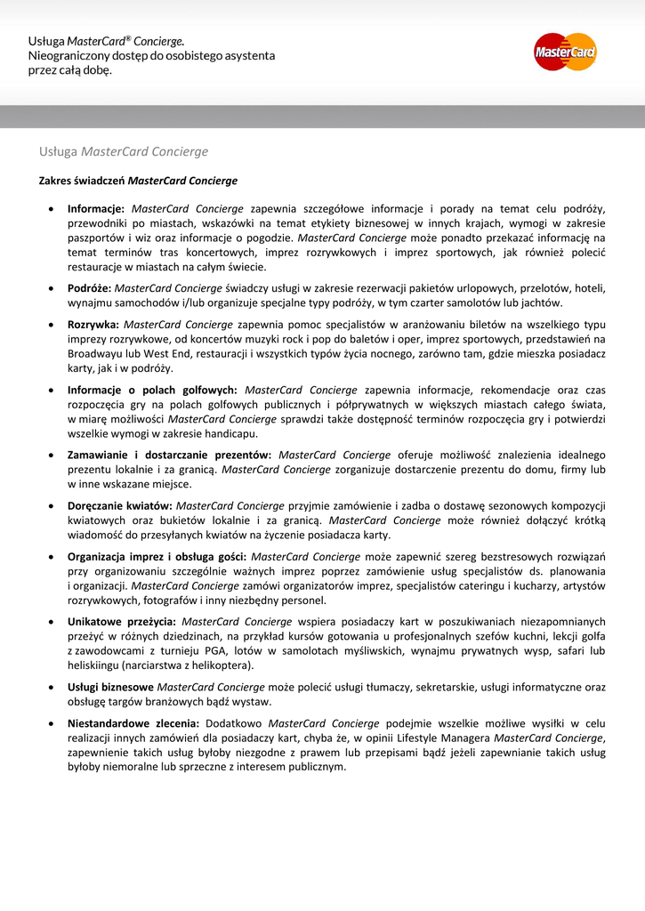 Usługa MasterCard Concierge Zakres świadczeń MasterCard Concierge Informacje: MasterCard Concierge zapewnia szczegółowe informacje i porady na temat celu podróży, przewodniki po miastach, wskazówki na temat etykiety biznesowej w innych krajach, wymogi w zakresie paszportów i wiz oraz informacje o pogodzie. MasterCard Concierge może ponadto przekazać informację na temat terminów tras koncertowych, imprez rozrywkowych i imprez sportowych, jak również polecić restauracje w miastach na całym świecie. Podróże: MasterCard Concierge świadczy usługi w zakresie rezerwacji pakietów urlopowych, przelotów, hoteli, wynajmu samochodów i/lub organizuje specjalne typy podróży, w tym czarter samolotów lub jachtów. Rozrywka: MasterCard Concierge zapewnia pomoc specjalistów w aranżowaniu biletów na wszelkiego typu imprezy rozrywkowe, od koncertów muzyki rock i pop do baletów i oper, imprez sportowych, przedstawień na Broadwayu lub West End, restauracji i wszystkich typów życia nocnego, zarówno tam, gdzie mieszka posiadacz karty, jak i w podróży. Informacje o polach golfowych: MasterCard Concierge zapewnia informacje, rekomendacje oraz czas rozpoczęcia gry na polach golfowych publicznych i półprywatnych w większych miastach całego świata, w miarę możliwości MasterCard Concierge sprawdzi także dostępność terminów rozpoczęcia gry i potwierdzi wszelkie wymogi w zakresie handicapu. Zamawianie i dostarczanie prezentów: MasterCard Concierge oferuje możliwość znalezienia idealnego prezentu lokalnie i za granicą. MasterCard Concierge zorganizuje dostarczenie prezentu do domu, firmy lub w inne wskazane miejsce. Doręczanie kwiatów: MasterCard Concierge przyjmie zamówienie i zadba o dostawę sezonowych kompozycji kwiatowych oraz bukietów lokalnie i za granicą. MasterCard Concierge może również dołączyć krótką wiadomość do przesyłanych kwiatów na życzenie posiadacza karty. Organizacja imprez i obsługa gości: MasterCard Concierge może zapewnić szereg bezstresowych rozwiązań przy organizowaniu szczególnie ważnych imprez poprzez zamówienie usług specjalistów ds. planowania i organizacji. MasterCard Concierge zamówi organizatorów imprez, specjalistów cateringu i kucharzy, artystów rozrywkowych, fotografów i inny niezbędny personel. Unikatowe przeżycia: MasterCard Concierge wspiera posiadaczy kart w poszukiwaniach niezapomnianych przeżyć w różnych dziedzinach, na przykład kursów gotowania u profesjonalnych szefów kuchni, lekcji golfa z zawodowcami z turnieju PGA, lotów w samolotach myśliwskich, wynajmu prywatnych wysp, safari lub heliskiingu (narciarstwa z helikoptera). Usługi biznesowe MasterCard Concierge może polecić usługi tłumaczy, sekretarskie, usługi informatyczne oraz obsługę targów branżowych bądź wystaw. Niestandardowe zlecenia: Dodatkowo MasterCard Concierge podejmie wszelkie możliwe wysiłki w celu realizacji innych zamówień dla posiadaczy kart, chyba że, w opinii Lifestyle Managera MasterCard Concierge, zapewnienie takich usług byłoby niezgodne z prawem lub przepisami bądź jeżeli zapewnianie takich usług byłoby niemoralne lub sprzeczne z interesem publicznym. We wszystkich przypadkach Lifestyle Manager MasterCard Concierge przedstawi opcje, cenę usług (co obejmuje ceny dostawy i inne powiązane koszty), przedziały czasowe dostaw lub kolejne kroki (w odpowiednich przypadkach). Na życzenie Klienta MasterCard Concierge dokona rezerwacji, złoży zamówienie lub zorganizuje dostawę, posługując się, za zgodą posiadacza karty, kartą płatniczą MasterCard posiadacza karty do pokrycia powyższych kosztów. MasterCard Concierge uzyskuje dostęp do dostawców lokalnie i za granicą w celu realizacji zamówień posiadacza karty. Warunki i zasady zleceń są podane poniżej: 1. Dostępność dostawców może różnić się w poszczególnych krajach oraz w zależności od zamawianej usługi. 2. Wszelkie zamówienia przekazane dostawcy będą realizowane w imieniu posiadacza karty z użyciem, w odpowiednich przypadkach, konta karty płatniczej MasterCard posiadacza karty. Dla uniknięcia wątpliwości zaznacza się, że posiadacz karty odpowiada za pokrycie kosztów wszystkich towarów i usług uzyskanych za pośrednictwem MasterCard Concierge oraz wszelkich dodatkowych opłat związanych z transakcją, na przykład opłat związanych z rezerwacją z użyciem karty. W żadnych okolicznościach MasterCard Concierge ani usługodawca MasterCard Concierge nie będzie odpowiadać za koszty związane z transakcją posiadacza karty. Posiadacz karty będzie odpowiadać bezpośrednio wobec dostawcy za uregulowanie wszystkich rachunków za towary lub usługi zamówione w imieniu posiadacza karty, jeżeli nie zostały one przedpłacone z użyciem karty płatniczej MasterCard posiadacza karty. 3. Pomiędzy posiadaczem karty i dostawcą powstanie bezpośredni związek umowny. 4. Wszelkie towary lub usługi zamówione w imieniu posiadacza karty będą podlegać standardowym zasadom i warunkom dostawcy. 5. Niektórzy dostawcy (na przykład hotele lub firmy wynajmu samochodów) mogą zastrzec sobie prawo do obciążenia karty płatniczej MasterCard posiadacza karty opłatą za anulowanie lub innymi opłatami w przypadku anulowania rezerwacji przez posiadacza karty lub nieskorzystania z zamówionej usługi. 6. Bilety lotnicze będą podlegać regułom odnoszącym się do typu biletu zakupionego przez MasterCard Concierge w imieniu posiadacza karty. 7. MasterCard Concierge nie będzie odpowiadać za niedostarczenie przez jakiegokolwiek dostawcę towarów lub usług odpowiednio zarezerwowanych lub zamówionych w imieniu posiadacza karty i nie będzie odpowiadać za zaniedbania dostawcy w zapewnianiu takich towarów lub usług bądź za niezapewnienie powyższych. 8. Jeżeli prośba obejmuje dostarczenie informacji, dostępność takich informacji może być uzależniona od kraju, którego informacje dotycz