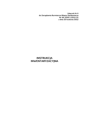 Załącznik Nr 6 do Zarządzenia Burmistrza Miasta Sandomierza Nr SK.3200.1.2012.CG z dnia 16 kwietnia 2012 INSTRUKCJA INWENTARYZACYJNA Niniejsza instrukcja opracowana została na podstawie ustawy z dnia 29 września 1994 roku o rachunkowości (tj. Dz. U. z 2009 r. Nr 152, poz. 1223 z późn. zm.), rozporządzeniu Ministra Finansów z dnia 5 lipca 2010 r. w sprawie szczególnych zasad rachunkowości oraz planów kont dla budżetu państwa, budżetów jednostek samorządu terytorialnego, jednostek budżetowych, samorządowych zakładów budżetowych państwowych funduszy celowych oraz państwowych jednostek budżetowych mających siedzibę poza granicami Rzeczpospolitej Polskiej (tj. Dz. U. Nr 128, poz. 861 z późn. zm.), Urząd Miejski w Sandomierzu stosuje zasady inwentaryzacji, określone w ustawie o rachunkowości, uzupełnione postanowieniami niniejszej instrukcji oraz zasadami wynikającymi z obowiązującego w jednostce zakładowego planu kont. §1 1. W pojęciu „inwentaryzacja” mieszczą się następujące czynności: a) ustalenie stanu faktycznego aktywów i pasywów za pomocą odpowiednich metod inwentaryzacji, b) udokumentowanie inwentaryzacji i jej wyników oraz wycena składników, jeżeli mają wyraz ilościowy, c) ustalenie różnic stwierdzonych między stanem rzeczywistym a stanem księgowym, d) wyjaśnienie różnic z podaniem ich przyczyn, e) dostosowanie danych wynikających z ewidencji księgowej do danych rzeczywistych, f) rozliczenie osób odpowiedzialnych lub współodpowiedzialnych z powierzonego im mienia, g) ocena przydatności inwentaryzowanych składników oraz realności ich stanu księgowego, h) podjęcie decyzji w sprawie stwierdzonych różnic pomiędzy stanem księgowym a stanem faktycznym /i wyeliminowanie - jeżeli jest to możliwe – przyczyn je powodujących/, I) rozliczenie różnic w księgach rachunkowych danego roku obrotowego w celu doprowadzenia do zgodności zapisów księgowych ze stanami rzeczywistymi. §2 Celem inwentaryzacji jest ustalenie rzeczywistego stanu aktywów i pasywów i na tej podstawie: -doprowadzenie danych wynikających z ksiąg rachunkowych do zgodności ze stanem rzeczywistym, a tym samym zapewnienie realności wynikających z ich informacji ekonomicznych; -rozliczenie osób materialnie odpowiedzialnych (współodpowiedzialnych) za powierzone im mienie; -dokonanie oceny gospodarczej przydatności składników majątkowych jednostki; -przeciwdziałania nieprawidłowościom w gospodarce składnikami majątku jednostki. §3 Stan rzeczywisty aktywów i pasywów jednostki ustala się w drodze: - spisu z natury, 2 - uzyskania od kontrahentów potwierdzenia sald na dzień inwentaryzacji, - weryfikacji prawidłowości stanów wynikających z ksiąg rachunkowych – drogą porównania danych ksiąg rachunkowych z odpowiednimi dokumentami i weryfikacji realnej wartości tych składników. Spisem z natury ustala się stan następujących aktywów: - druków ścisłego zarachowania - bilety opłaty targowej, parkingowej, i kwitariuszy K 103, - środków trwałych w eksploatacji, - pozostałych środków trwałych w użytkowaniu, - środków trwałych dzierżawionych, obcych oraz postawionych w stan likwidacji. W drodze uzyskania od kontrahentów pisemnego potwierdzenia ustala się stany następujących aktywów i pasywów: - środków pieniężnych na rachunkach bankowych, - kredytów bankowych i pożyczek w kwocie wymagającej zapłaty, - rozrachunków z dostawcami i odbiorcami. Za stan rzeczywisty nie wymagający pisemnego potwierdzenia przez kontrahentów można przyjąć stan należności i zobowiązań wynikający z ksiąg rachunkowych jednostki uregulowanych do dnia sporządzenia bilansu nie przekraczających 50 zł. Inwentaryzacją w drodze weryfikacji stanu ewidencyjnego obejmuje się w szczególności: - grunty i trudno dostępne oglądowi środki trwałe, - wartości niematerialne i prawne, - rzeczowe składniki majątku znajdujące się poza jednostką, - należności i zobowiązania publicznoprawne, - inwestycje rozpoczęte (w toku) – środki trwałe w budowie, - udziały w innych jednostkach. W jednostce mogą być stosowane następujące metody inwentaryzacji: - pełna inwentaryzacja okresowa polegająca na ustaleniu na dzień inwentaryzacji rzeczywistego stanu wszystkich składników objętego inwentaryzacją aktywów lub pasywów, - inwentaryzacja okresowa – polegająca na ustaleniu rzeczywistego stanu części składników aktywów lub pasywów objętych inwentaryzacją, - uproszczona inwentaryzacja składników majątkowych. §4 Inwentaryzacja poszczególnych składników majątku jednostki przeprowadzana jest w terminach ustalonych w rocznym planie inwentaryzacyjnym ustalonym odrębnym zarządzeniem Burmistrza Miasta Sandomierza. Terminy i częstotliwość inwentaryzacji określa Burmistrz na wniosek Skarbnika Miasta. Projekt planu inwentaryzacji opracowuje Skarbnik Miasta. Przy ustalaniu terminów inwentaryzacji poszczególnych składników majątku należy stosować następujące zasady: a) co 4 lata: znajdujące się na terenie strzeżonym środki trwałe oraz maszyny i urządzenia wchodzące w skład środków trwałych w budowie. Za teren strzeżony uważa się budynek Urzędu Miejskiego w Sandomierzu, b) co 2 lata: zapasy materiałów, produktów gotowych i półfabrykatów znajdujących 3 się na strzeżonych składowiskach i objętych ewidencją ilościowo-wartościową, c) co rok składniki aktywów i pasywów tj: aktywów pieniężnych, papierów wartościowych, druków ścisłego zarachowania, stanu należności, stanu udzielonych i otrzymanych pożyczek, gruntów budynków i budowli, maszyn urządzeń i środków transportu Ustala się, z uwzględnieniem częstotliwości określonej powyżej: a) w ostatnim kwartale roku lub na dzień bilansowy każdego roku: aktywów pieniężnych, papierów wartościowych, materiałów, które bezpośrednio z zakupu obciążają koszty działalności, składnik