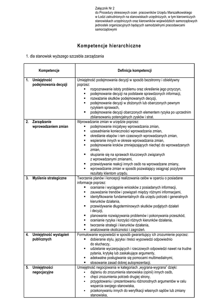 Załącznik Nr 2 do Procedury okresowych ocen pracowników Urzędu Marszałkowskiego w Łodzi zatrudnionych na stanowiskach urzędniczych, w tym kierowniczych stanowiskach urzędniczych oraz kierowników wojewódzkich samorządowych jednostek organizacyjnych będących samodzielnymi pracodawcami samorządowymi Kompetencje hierarchiczne 1. dla stanowisk wyższego szczebla zarządzania Kompetencje 1. Umiejętność podejmowania decyzji 2. Zarządzanie wprowadzaniem zmian 3. Myślenie strategiczne 4. Umiejętność wystąpień publicznych 5. Umiejętności negocjacyjne Definicja kompetencji Umiejętność podejmowania decyzji w sposób bezstronny i obiektywny poprzez: rozpoznawanie istoty problemu oraz określenie jego przyczyn, podejmowanie decyzji na podstawie sprawdzonych informacji, rozważanie skutków podejmowanych decyzji, podejmowanie decyzji w złożonych lub obarczonych pewnym ryzykiem sprawach, podejmowanie decyzji obarczonych elementem ryzyka po uprzednim zbilansowaniu potencjalnych zysków i strat. Wprowadzanie zmian w urzędzie poprzez: podejmowanie inicjatywy wprowadzania zmian, uzasadnianie konieczności wprowadzania zmian, określanie etapów i ram czasowych wprowadzanych zmian, wspieranie innych w okresie wprowadzania zmian, podejmowanie kroków zmniejszających niechęć do wprowadzanych zmian, skupianie się na sprawach kluczowych związanych z wprowadzanymi zmianami, przewidywanie reakcji innych osób na wprowadzane zmiany, wprowadzanie zmian w sposób pozwalający osiągnąć pozytywne rezultaty klientom urzędu. Tworzenie planów i koncepcji realizowania celów w oparciu o posiadane informacje poprzez: ocenianie i wyciąganie wniosków z posiadanych informacji, zauważanie trendów i powiązań między różnymi informacjami, identyfikowanie fundamentalnych dla urzędu potrzeb i generalnych kierunków działania, przewidywanie długoterminowych skutków podjętych działań i decyzji, planowanie rozwiązywania problemów i pokonywania przeszkód, ocenianie ryzyka i korzyści różnych kierunków działania, tworzenie strategii i kierunków działania, analizowanie okoliczności i zagrożeń. Formułowanie wypowiedzi w sposób gwarantujący ich zrozumienie poprzez: dobieranie stylu, języka i treści wypowiedzi odpowiednio do słuchaczy, udzielanie wyczerpujących i rzeczowych odpowiedzi nawet na trudne pytania, krytykę lub zaskakujące argumenty, adekwatne posługiwanie się pomocami multimedialnymi, stosowanie zasad dobrej autoprezentacji. Umiejętność negocjowania w kategoriach „wygrana-wygrana” dzięki: dążeniu do zrozumienia stanowiska (opinii) innych osób, chęci zrozumienia potrzeb drugiej strony, przygotowaniu i prezentowaniu różnorodnych argumentów w celu wsparcia swojego stanowiska, przekonywaniu innych do weryfikacji własnych sądów lub zmiany stanowiska, stymulowaniu otwartych dyskusji na temat źródeł konfliktów/problemów, chęci rozwiązania problemu, kwestii spornej, tworzeniu i proponowaniu nowych rozwiązań. 2. dla stanowisk średniego szczebla zarządzania Kompetencje Definicja kompetencji 1. Umiejętność delegowania zadań formułowanie w jasny sposób poleceń dla pracowników, właściwy dobór osób do realizacji zadań, omawianie z pracownikami powierzanych zadań, przekazywanie zadań wraz z narzędziami do ich realizacji i odpowiedzialnością za ich właściwe wykonanie. Umiejętność podejmowania decyzji w sposób bezstronny i obiektywny poprzez: rozpoznawanie istoty problemu oraz określenie jego przyczyn, podejmowanie decyzji na podstawie sprawdzonych informacji, rozważanie skutków podejmowanych decyzji, podejmowanie decyzji w złożonych lub obarczonych pewnym ryzykiem sprawach, podejmowanie decyzji obarczonych elementem ryzyka po uprzednim zbilansowaniu potencjalnych zysków i strat. Osiąganie zakładanych celów, doprowadzanie działań do końca poprzez: ustalanie priorytetów działania, identyfikowanie zadań krytycznych, szczególnie trudnych, mogących mieć przełomowe znaczenie, określanie sposobów mierzenia postępu realizacji zadań, przyjmowanie odpowiedzialności w trakcie realizacji zadań i wywiązywanie się ze zobowiązań, zrozumienie konieczności rozwiązywania problemów oraz kończenia podjętych działań. umiejętność i wola poszukiwania obszarów wymagających zmian i informowanie o nich, inicjowanie działań doskonalących i branie odpowiedzialności za ich realizację, mówienie otwarcie o problemach, badanie źródeł ich powstania. Pokonywanie sytuacji kryzysowych oraz rozwiązywanie skomplikowanych problemów poprzez: wczesne rozpoznawanie potencjalnych sytuacji kryzysowych, szybkie działanie w celu rozwiązania kryzysu, dostosowywanie działań do zmieniających się warunków, informowanie wszystkich, którzy będą musieli zareagować na kryzys, wyciąganie odpowiednich/właściwych wniosków z sytuacji kryzysowych, aby w przyszłości można było uniknąć podobnych sytuacji, skuteczne działanie (także) w okresach przejściowych lub wprowadzania zmian. 2. Umiejętność podejmowania decyzji 3. Nastawienie na osiąganie celów 4. Inicjatywa 5. Radzenie sobie w sytuacjach kryzysowych 3. dla stanowisk pracowniczych Kompetencje 1. Wiedza specjalistyczna 2. Umiejętność współpracy 3. Umiejętność wyciągania wniosków 4. Kreatywność 5. Chęć uczenia się Definicja kompetencji posiadanie wiedzy z konkretnej dziedziny, warunkującej odpowiedni poziom merytoryczny i wysoką jakość realizowanych zadań na danym stanowisku. Realizacja zadań wspólnych dla całego urzędu poprzez: współpracę wewnątrz komórek, współpracę z innymi komórkami. Realizacja zadań w zespole przez: pomoc i doradzanie kolegom w razie potrzeby, zrozumienie celu i korzyści wynikających ze wspólnego realizowania zadań, zgłaszanie konstruktywnych wniosków usprawniających pracę zespołu, aktywne słuchanie innych, wzbudzanie zaufania. umiejętne analizowanie i interpretowanie danych (