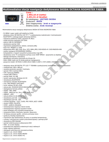 Informacje o produkcie Utworzono 01-03-2017 Multimedialna stacja nawigacja dedykowana SKODA OCTAVIA ROOMSTER FABIA Cena : 1.993,10 zł (netto) 2.451,51 zł (brutto) Nr katalogowy : JDZ7005 SKODA Producent : NVOX Stan magazynowy : brak w magazynie Średnia ocena : brak recenzji Multimedialna stacja nawigacja dedykowana SKODA OCTAVIA ROOMSTER FABIA er m ar k - PL MENU i super szybki soft (platforma S100) - dotykowy ekran HD DIGITAL LCD TFT 7" o podwyższonej rozdzielczości i kontrastowości - BLUETOOTH z obsługą książki adresowej telefonu - najnowsza platforma S100 z językiem PL Menu - szybki procesor jednostki CPU 1GHz - wejście USB 3G (INTERNET) - wbudowana pamięć 4GB - regulowane podświetlenie: zielone, czerwone,żółty - duża moc: MOSFET 4 x 45W - odtwarzanie MP3, MP4, DVD, Divx, VCD, WMA, JPEG, DVD-R/DVD+R i DVD-RW/DVD+RW - szybka nawigacja GPS(SAMSUNG 500Mhz) - kompatybilne z mapami wszystkich producentów map GPS - wbudowany tuner TV analogowej (cyfrowy tuner DVBT MPEG4 - opcjonalnie za dopłatą) - obsługa sterowania z kierownicy - wbudowana wirtualna zmieniarka do 20 płyt CD - DUAL ZONE (radio lub CD działa podczas nawigowania) - pasuje do modeli: OCTAVIA II (2004-2012) FABIA II (2007+) YETI (2009+) ROOMSTER (2006+) w at • dotykowy ekran HD DIGITAL TFT LCD 7" TOSHIBA o podwyższonej rozdzielczości oraz kontrastowości • rozdzielczość: 800 x 480 pix • wysokie parametry jasności i kontrastu • jasność 350:1 kontrast 800:1 • CPU: Samsung 500MHz • chipset SIRF STAR III • pamięć RAM: 512 MB • system operacyjny Windows 6.0 CE • wbudowany BLUETOOTH • zewnętrzny mikrofon BLUETOOTH • moc: MAX MOSFET 4x45 WATT • tuner radiowy FM AM z RDS • odczyt płyt: DVD/DVD-R/DVD-RW/VCD/CD/CD-R/CD-RW • obsługiwane formaty plików: • AUDIO - MP3, WMA • VIDEO - MP4(czyli avi, Divx, XVID), DVD, VCD • OBRAZY - JPEG • odczyt plików txt dla filmów Divx • wbudowany port SD - multimedia • wbudowany port SD - GPS • cyfrowy Equalizer - FLAT, CLASS, POP, ROCK, JAZZ i USER) • system VIDEO: PAL/NTSC • LOUD - podbicie dźwięków • wielostopniowa regulacja niskich tonów • wielostopniowa regulacja wysokich tonów • panel działający przy wysokiej temperaturze • ustawienie Koloru, Kontrastu, Jasności, Nasycenia • 32 bitowy procesor grafiki, ruchoma animacja menu • graficzny Interfejs Użytkownika • mechanizm płyt dostosowany do pracy w wysokiej temperaturze • cyfrowy I mechaniczny system przeciwwstrząsowy z pamięcią ESP • wewnętrzny MP4 Dekoder • pamięć ostatniej pozycji odtwarzania DVD • OSD - on screen display • automatyczne zapisanie znalezionych stacji radiowych • koder regulacji głośności • obsługuje automatycznie wysuwaną antenę • wyjście 1 szt. chinch VIDEO • wyjście 2 szt. chinch AUDIO PRZÓD • wyjście 2 szt. chinch AUDIO TYŁ Wygenerowano w programie www.oscGold.com • wyjście 2 szt. chinch AUDIO 2-zone • wejście na antenę radiową • wejście 1szt. chinch VIDEO • wejście 1 szt. chinch - AUX VIDEO • wejście 2 szt. chinch - AUX AUDIO W zestawie: w at er m ar k - stacja dedykowana - pilot - antena GPS - kabelek do podłączenia IPOD'a - kabel USB do podłączenia modemu 3G - kable podłączeniowe audio-video - okablowanie zasilające + kabel USB - zewnętrzny mikrofon Bluetooth - gwarancja NVOX 12 mies. - instrukcja obsługi - paragon lub faktura VAT