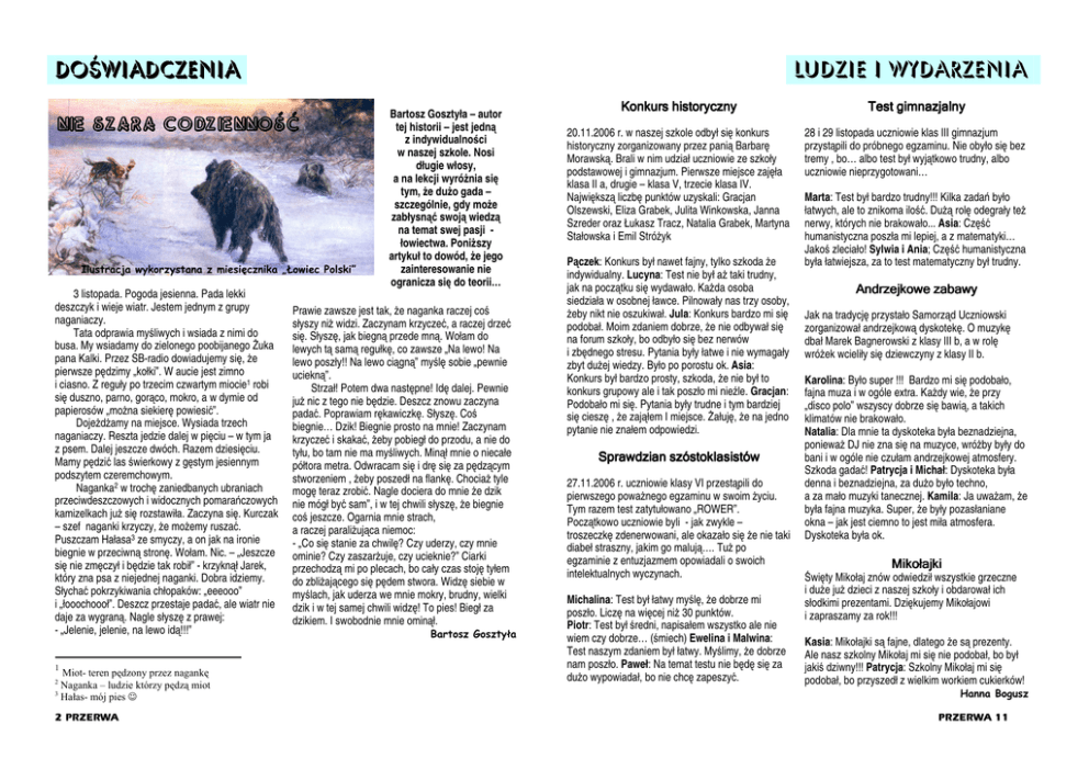 LUDZIE I WYDARZENIA DOŚWIADCZENIA Nie szara codzienność Ilustracja wykorzystana z miesięcznika „Łowiec Polski” 3 listopada. Pogoda jesienna. Pada lekki deszczyk i wieje wiatr. Jestem jednym z grupy naganiaczy. Tata odprawia myśliwych i wsiada z nimi do busa. My wsiadamy do zielonego poobijanego Żuka pana Kalki. Przez SB-radio dowiadujemy się, że pierwsze pędzimy „kołki”. W aucie jest zimno i ciasno. Z reguły po trzecim czwartym miocie1 robi się duszno, parno, gorąco, mokro, a w dymie od papierosów „można siekierę powiesić”. Dojeżdżamy na miejsce. Wysiada trzech naganiaczy. Reszta jedzie dalej w pięciu – w tym ja z psem. Dalej jeszcze dwóch. Razem dziesięciu. Mamy pędzić las świerkowy z gęstym jesiennym podszytem czeremchowym. Naganka2 w trochę zaniedbanych ubraniach przeciwdeszczowych i widocznych pomarańczowych kamizelkach już się rozstawiła. Zaczyna się. Kurczak – szef naganki krzyczy, że możemy ruszać. Puszczam Hałasa3 ze smyczy, a on jak na ironie biegnie w przeciwną stronę. Wołam. Nic. – „Jeszcze się nie zmęczył i będzie tak robił” - krzyknął Jarek, który zna psa z niejednej naganki. Dobra idziemy. Słychać pokrzykiwania chłopaków: „eeeooo” i „łooochoooł”. Deszcz przestaje padać, ale wiatr nie daje za wygraną. Nagle słyszę z prawej: - „Jelenie, jelenie, na lewo idą!!!” 1 Miot- teren pędzony przez nagankę Naganka – ludzie którzy pędzą miot 3 Hałas- mój pies ☺ 2 2 PRZERWA Bartosz Gosztyła – autor tej historii – jest jedną z indywidualności w naszej szkole. Nosi długie włosy, a na lekcji wyróżnia się tym, że dużo gada – szczególnie, gdy może zabłysnąć swoją wiedzą na temat swej pasji łowiectwa. Poniższy artykuł to dowód, że jego zainteresowanie nie ogranicza się do teorii… Prawie zawsze jest tak, że naganka raczej coś słyszy niż widzi. Zaczynam krzyczeć, a raczej drzeć się. Słyszę, jak biegną przede mną. Wołam do lewych tą samą regułkę, co zawsze „Na lewo! Na lewo poszły!! Na lewo ciągną” myślę sobie „pewnie uciekną”. Strzał! Potem dwa następne! Idę dalej. Pewnie już nic z tego nie będzie. Deszcz znowu zaczyna padać. Poprawiam rękawiczkę. Słyszę. Coś biegnie… Dzik! Biegnie prosto na mnie! Zaczynam krzyczeć i skakać, żeby pobiegł do przodu, a nie do tyłu, bo tam nie ma myśliwych. Minął mnie o niecałe półtora metra. Odwracam się i drę się za pędzącym stworzeniem , żeby poszedł na flankę. Chociaż tyle mogę teraz zrobić. Nagle dociera do mnie że dzik nie mógł być sam”, i w tej chwili słyszę, że biegnie coś jeszcze. Ogarnia mnie strach, a raczej paraliżująca niemoc: - „Co się stanie za chwilę? Czy uderzy, czy mnie ominie? Czy zaszarżuje, czy ucieknie?” Ciarki przechodzą mi po plecach, bo cały czas stoję tyłem do zbliżającego się pędem stwora. Widzę siebie w myślach, jak uderza we mnie mokry, brudny, wielki dzik i w tej samej chwili widzę! To pies! Biegł za dzikiem. I swobodnie mnie ominął. Bartosz Gosztyła Konkurs historyczny Test gimnazjalny 20.11.2006 r. w naszej szkole odbył się konkurs historyczny zorganizowany przez panią Barbarę Morawską. Brali w nim udział uczniowie ze szkoły podstawowej i gimnazjum. Pierwsze miejsce zajęła klasa II a, drugie – klasa V, trzecie klasa IV. Największą liczbę punktów uzyskali: Gracjan Olszewski, Eliza Grabek, Julita Winkowska, Janna Szreder oraz Łukasz Tracz, Natalia Grabek, Martyna Stałowska i Emil Stróżyk 28 i 29 listopada uczniowie klas III gimnazjum przystąpili do próbnego egzaminu. Nie obyło się bez tremy , bo… albo test był wyjątkowo trudny, albo uczniowie nieprzygotowani… Pączek: Konkurs był nawet fajny, tylko szkoda że indywidualny. Lucyna: Test nie był aż taki trudny, jak na początku się wydawało. Każda osoba siedziała w osobnej ławce. Pilnowały nas trzy osoby, żeby nikt nie oszukiwał. Jula: Konkurs bardzo mi się podobał. Moim zdaniem dobrze, że nie odbywał się na forum szkoły, bo odbyło się bez nerwów i zbędnego stresu. Pytania były łatwe i nie wymagały zbyt dużej wiedzy. Było po porostu ok. Asia: Konkurs był bardzo prosty, szkoda, że nie był to konkurs grupowy ale i tak poszło mi nieźle. Gracjan: Podobało mi się. Pytania były trudne i tym bardziej się cieszę , że zająłem I miejsce. Żałuję, że na jedno pytanie nie znałem odpowiedzi. Sprawdzian Sprawdzian szóstoklasistów 27.11.2006 r. uczniowie klasy VI przestąpili do pierwszego poważnego egzaminu w swoim życiu. Tym razem test zatytułowano „ROWER”. Początkowo uczniowie byli - jak zwykle – troszeczkę zdenerwowani, ale okazało się że nie taki diabeł straszny, jakim go malują…. Tuż po egzaminie z entuzjazmem opowiadali o swoich intelektualnych wyczynach. Michalina: Test był łatwy myślę, że dobrze mi poszło. Liczę na więcej niż 30 punktów. Piotr: Test był średni, napisałem wszystko ale nie wiem czy dobrze… (śmiech) Ewelina i Malwina: Test naszym zdaniem był łatwy. Myślimy, że dobrze nam poszło. Paweł: Na temat testu nie będę się za dużo wypowiadał, bo nie chcę zapeszyć. Marta: Test był bardzo trudny!!! Kilka zadań było łatwych, ale to znikoma ilość. Dużą rolę odegrały też nerwy, których nie brakowało... Asia: Część humanistyczna poszła mi lepiej, a z matematyki… Jakoś zleciało! Sylwia i Ania; Część humanistyczna była łatwiejsza, za to test matematyczny był trudny. Andrzejkowe zabawy Jak na tradycję przystało Samorząd Uczniowski zorganizował andrzejkową dyskotekę. O muzykę dbał Marek Bagnerowski z klasy III b, a w rolę wróżek wcieliły się dziewczyny z klasy II b. Karolina: Było super !!! Bardzo mi się podobało, fajna muza i w ogóle extra. Każdy wie, że przy „disco polo” wszyscy dobrze się bawią, a takich klimatów nie brakowało. Natalia: Dla mnie ta dyskoteka była beznadziejna, ponieważ DJ nie