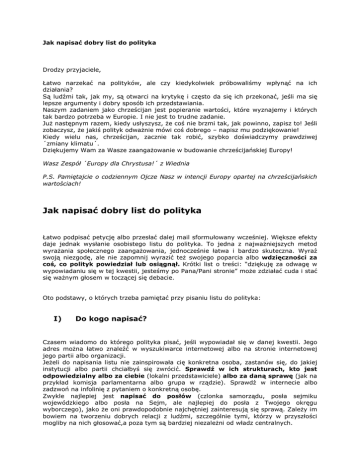Jak napisać dobry list do polityka Drodzy przyjaciele, Łatwo narzekać na polityków, ale czy kiedykolwiek próbowaliśmy wpłynąć na ich działania? Są ludźmi tak, jak my, są otwarci na krytykę i często da się ich przekonać, jeśli ma się lepsze argumenty i dobry sposób ich przedstawiania. Naszym zadaniem jako chrześcijan jest popieranie wartości, które wyznajemy i których tak bardzo potrzeba w Europie. I nie jest to trudne zadanie. Już następnym razem, kiedy usłyszysz, że coś nie brzmi tak, jak powinno, zapisz to! Jeśli zobaczysz, że jakiś polityk odważnie mówi coś dobrego – napisz mu podziękowanie! Kiedy wielu nas, chrześcijan, zacznie tak robić, szybko doświadczymy prawdziwej ´zmiany klimatu´. Dziękujemy Wam za Wasze zaangażowanie w budowanie chrześcijańskiej Europy! Wasz Zespół ´Europy dla Chrystusa!´ z Wiednia P.S. Pamiętajcie o codziennym Ojcze Nasz w intencji Europy opartej na chrześcijańskich wartościach! Jak napisać dobry list do polityka Łatwo podpisać petycję albo przesłać dalej mail sformułowany wcześniej. Większe efekty daje jednak wysłanie osobistego listu do polityka. To jedna z najważniejszych metod wyrażania społecznego zaangażowania, jednocześnie łatwa i bardzo skuteczna. Wyraź swoją niezgodę, ale nie zapomnij wyrazić też swojego poparcia albo wdzięczności za coś, co polityk powiedział lub osiągnął. Krótki list o treści: “dziękuję za odwagę w wypowiadaniu się w tej kwestii, jesteśmy po Pana/Pani stronie” może zdziałać cuda i stać się ważnym głosem w toczącej się debacie. Oto podstawy, o których trzeba pamiętać przy pisaniu listu do polityka: I) Do kogo napisać? Czasem wiadomo do którego polityka pisać, jeśli wypowiadał się w danej kwestii. Jego adres można łatwo znaleźć w wyszukiwarce internetowej albo na stronie internetowej jego partii albo organizacji. Jeżeli do napisania listu nie zainspirowała cię konkretna osoba, zastanów się, do jakiej instytucji albo partii chciałbyś się zwrócić. Sprawdź w ich strukturach, kto jest odpowiedzialny albo za ciebie (lokalni przedstawiciele) albo za daną sprawę (jak na przykład komisja parlamentarna albo grupa w rządzie). Sprawdź w internecie albo zadzwoń na infolinię z pytaniem o konkretną osobę. Zwykle najlepiej jest napisać do posłów (czlonka samorządu, posła sejmiku wojewódzkiego albo posła na Sejm, ale najlepiej do posła z Twojego okręgu wyborczego), jako że oni prawdopodobnie najchętniej zainteresują się sprawą. Zależy im bowiem na tworzeniu dobrych relacji z ludźmi, szczególnie tymi, którzy w przyszłości mogliby na nich głosować,a poza tym są bardziej niezależni od władz centralnych. Dodatkowo warto napisać także do działu kontaktów (są różnie nazywane, ale łatwo znaleźć je na stronie partii) i do tych wszystkich, którzy zajmują się zdobywaniem popularności wyborców, rekrutacją wolontariuszy i marketingiem. Ich praca polega na nawiązywaniu kontaktów, więc możesz spodziewać się ich odpowiedzi. Dla pewności możesz wysłać list do kilku osób, ale poinformuj o tym odbiorców. II) Treść ⇒ Captatio Benevolentiae (łac. zjednywanie sobie względów): Rozpocznij swój list od wyrażenia zachęty, pochwały albo wdzięczności. Także polityk tego potrzebuje, poza tym będzie bardziej skłonny do zapoznania się z pozostałą częścią wiadomości. To ważne także dlatego, by polityk odniósł wrażenie, że mógłbyś na niego zagłosować, i że linia polityczna jego partii jest ci bliska. Inaczej może nawet nie rozważać sprawy, o której piszesz, jeśli uzna ją za całkowicie ‘straconą’. ⇒ Jasno wyraź swoją prośbę Jeśli wiesz coś o osobistym zaangażowaniu tego polityka w sprawę, napisz o tym. Wyjaśnij, czemu ma ona dla ciebie znaczenie. Osobista historia doda ci wiarygodności. Swoją prośbę wyraź możliwie najkonkretniej. Na przykład powiedz, że głosowałeś na niego/ nią w oczekiwaniu, że... albo że nie zagłosujesz na niego/ nią albo na tą partię, ponieważ... ⇒ Klucz do skutecznej argumentacji: Zobacz wiat oczami tego polityka Wyobraź sobie, na czym polega rola osoby, do której piszesz – to szukanie kompromisów między sprzecznymi interesami różnych grup wyborców oraz między działalnością jego biura i polityki partii. Wyraź prawdę i swoje potrzeby, stawiając rozsądne oczekiwania. Przemyśl dobrze, jakie argumenty mogą przemówić do konkretnego polityka, zgodnie ze zdrowym rozsądkiem, własnym doświadczeniem i statystykami, które mówią, że zwykle argumenty oparte na wierze nie odnoszą skutku. Generalnie błędy ustawodawców nie wynikają ze złej woli, więc staraj się wyrażać swoje stanowisko z życzliwością i zrozumieniem. Częstym i poważnym błędem chrześcijan jest odrzucanie niedoskonałych rozwiązań, dlatego chwal ulepszenia, a krytykuj niedociągnięcia tylko, jeśli to konieczne. Możliwe, że ten konkretny polityk już zrobił wiele, by wprowadzić te zmiany. Postaraj się też wyrazić za pomocą przykładów albo emocjonalnego języka to, że twoje oczekiwania nie są przesadzone ani ekstremalne, ale są „normalną prośbą normalnych ludzi”. ⇒ Przekonujące argumenty są oparte na faktach Sprawdź statystyki: czy istnieją badania, które popierają twój punkt widzenia? Kto je przeprowadził? Jakie działania w tej sprawie podejmował rząd, opozycja i mniejsze partie? Organizacje szczególnie zaangażowane w tą sprawę? Czy media się nią interesowały? Wszelkie inne fakty mogą być przydatne. ⇒ Wyraź to krótko W razie potrzeby, dołącz dodatkowe materiały, o których wspominasz w liście. Jeśli chcesz napisać o kilku sprawach, bardziej skuteczne moze być poświęcenie na każdą oddzielnego listu, niż opisywanie wszystkich w jednym. III) Forma • • • • • • Nie zapomnij podać swojego imienia, nazwiska i adresu, podanie zawodu też mo