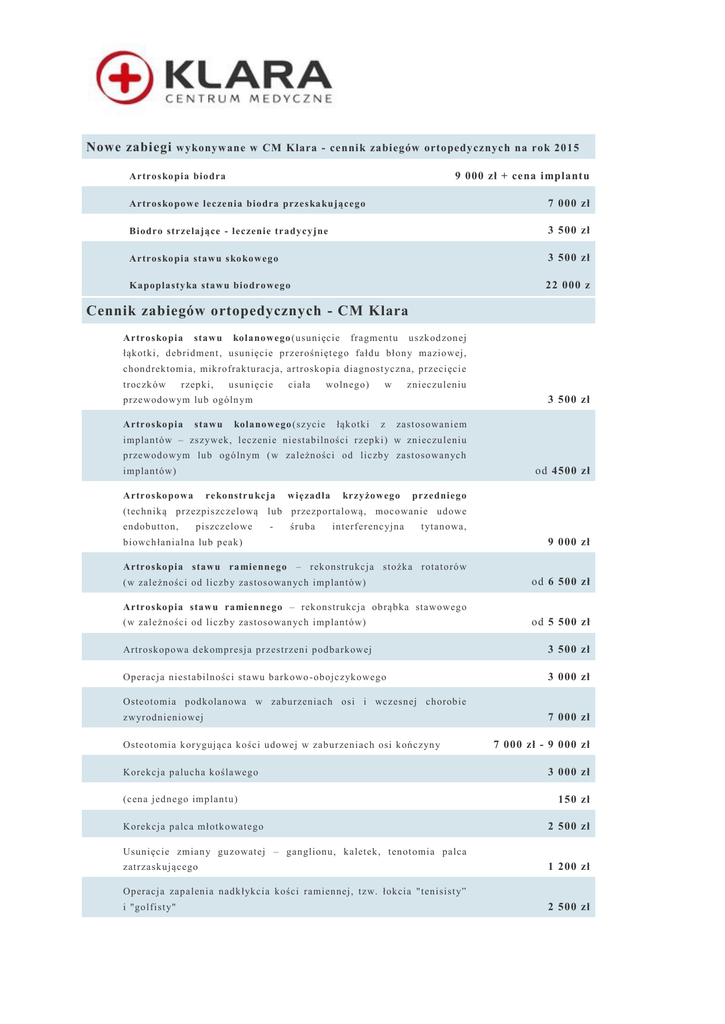 Nowe zabiegi w ykonyw ane w CM Klara - cennik zabiegów ortopedycznych na rok 2015 9 000 zł + cena implantu Artros ko pia biodra Artros ko powe leczenia biodra przes ka kującego 7 000 zł Biodro strzelające - leczenie tradycyjne 3 500 zł Artros ko pia stawu s ko kowego 3 500 zł Kapoplasty ka stawu biodrowego 22 000 z Cennik zabiegów ortopedycznych - CM Klara Artros ko pia stawu kolanowego (usunięcie fragm entu uszkod zon ej łąkotki, debridment , usunięcie przerośnięt ego fałdu błon y maziowej, chondrektomia, mikrofrakturacja, artroskopia diagnost yczna, przecięci e troczk ów rzepki, usunięcie ciała woln ego) w znieczuleniu 3 500 zł przewodowym lub ogóln ym Artros ko pia stawu kolanowego (szyci e łąkotki z zast osowaniem implantów – zs zywek, leczeni e niestabilności rzepki) w zn ieczu leniu przewodowym lub ogóln ym (w za leżności od liczb y zast osowan ych od 4500 zł implantów) Artros ko powa re konstru kcja więzadła krzyżowego przedniego (techniką przezpis zczelową lub przezportalową, moc owanie udowe endobutton, piszczelowe - śruba interferenc yjna t ytanowa, biowch łanialna lub peak) 9 000 zł Artros ko pia stawu ra mienn ego – rekonstrukcja stożka rotatorów (w zależności od liczb y zastos owan ych implantów) od 6 500 zł Artros ko pia stawu ramien ne go – rekonstrukcja obrąbka stawowego (w zależności od liczb y zastos owan ych implantów) od 5 500 zł Artroskopowa d ekompresja przestrzeni podbarkowej 3 500 zł Operacja niestabilności sta wu barkowo -obojc zykowego 3 000 zł Osteotomia podkolanowa w zaburzeniach osi i wczesnej chorobie zwyrodnieniowej Osteotomia korygująca kości udowej w zaburzeniach osi kończyn y Korekcja palucha kośla wego (cena jednego implantu) Korekcja palca młotkowatego 7 000 zł 7 000 zł - 9 000 zł 3 000 zł 150 zł 2 500 zł Usunięcie zmian y gu zowatej – ganglionu, kaletek, tenot omia palca zatrzaskującego 1 200 zł Operacja zapalenia nadkłykcia kości ramiennej, tzw. łokcia "tenisist y” i "golfist y" 2 500 zł Rekonstrukcja ścięgna Achillesa 2 500 zł - 3 500 zł Usunięcie materiału zespalającego 2 100 zł - 2 500 zł 14 000 zł + cena Endoprotezop last yka bezcemen towa sta wu biodrowego implantu (cena ob ejmuje obsługę med yc zną, pielęgniarską i rehabilitacyjną, leki, wyżywieni e i hospitalizację po zabiegu op erac yjn ym) 14 000 zł + cena Endoprotezop last yka sta wu kolanowego implantu (cena ob ejmuje obsługę med yc zną, pielęgniarską i rehabilitacyjną, leki, wyżywieni e i hospitalizację po zabiegu op erac yjn ym) Usunięcie torbieli Bakera z dołu podkolanowego Operacja braku zrostu lub zaburzenia zrostu 2 500 zł 8 600 zł - 12 000 zł (z podaniem osoc za bogatopłyt kowego lub komórek macierzyst ych) Operacje ręki Operacje zespołów ucis kowych nerwów obwodowych Operacja zesp ołu cieśni nadgarstka 1 500 zł Operacja zesp ołu kanału Gu yona 1 500 zł Operacja zesp ołu rowka nerwu łokciowego 2 000 zł Operacje zaciskającego zapalenia pochewek ścięgnistych Operacja palca zatrzaskującego 1 200 zł Operacja chorob y de Qu ervain 1 500 zł Mi krochirurgiczne operacje nerwów obwodowych Operacj e ś wi eżych uszkod zeń nerwów Operacj e rekonstrukc yjne (ws zczep z nerwu łydkowego) 3000 -4000 zł 4 000 zł Operacje ścięgien prostowni ków i zginaczy Pierwotn e s zyci e ścięgien 2350 -2750 zł Operacj e rekonstrukc yjne zastarza łych uszkod zeń ścięgien 2400 -3500 zł Operacja palca młotkowat ego 1 800 zł Operacja palca butonierkowat ego 1 800 zł Operacja przykurczu rozcięgna dłoniowego (Dupuyt rena) 2 500 zł S ynowektomia sta wów ręki, tenos ynowektomia nadgarstka 2 000 zł Operacje zmian guzowatych Torbieli ga laretowatej (ganglion) 1200 -1500 zł Gu za tkanek miękkich 2 000 zł Torbieli kostnej 2 000 zł zależnie od ceny Endoprotezop last yka sta wów ręki i mplantu Operacje świeżych urazów ręki i przedra mienia Ot warta repozycja i wewnęt rzna stabilizacja paliczka 1 500 zł Ot warta repozycja i wewnęt rzna stabilizacja kości śródręcza 2 500 zł Ot warta repozycja i wewnęt rzna stabilizacja kości łódec zkowatej 4 000 zł Ot warta repozycja i wewnęt rzna stabilizacja dalszego końca kości promieniowej 4 500 zł Operacje re konstr u kcyjne ni eprawidłowego zrostu kos tne go Osteotomia korekc yjna nieprawid łowego zrostu kości śródręcza i palców 4 200 zł Osteotomia korekc yjna nieprawid łowego zrostu kości promieniowej 4 500 zł Osteotomia skracająca kości łokciowej 4 000 zł Operacja sta wu rzek omego koś ci łódec zkowat ej Operacj e pourazowych przykurczów i znieks ztałc eń palców 4000 -6000 zł od 2 000 zł Usztywnienie stawów Nadgarstka 6 000 zł Częściowe nadgarstka 5 500 zł Stawu mi ędzypa liczkowego 2 000 zł Operacja łokcia "tenisist y" 2 500 zł Wycięci e kaletki łokciowej 1 400 zł Usunięcie materiału zespalającego od 1 700 zł