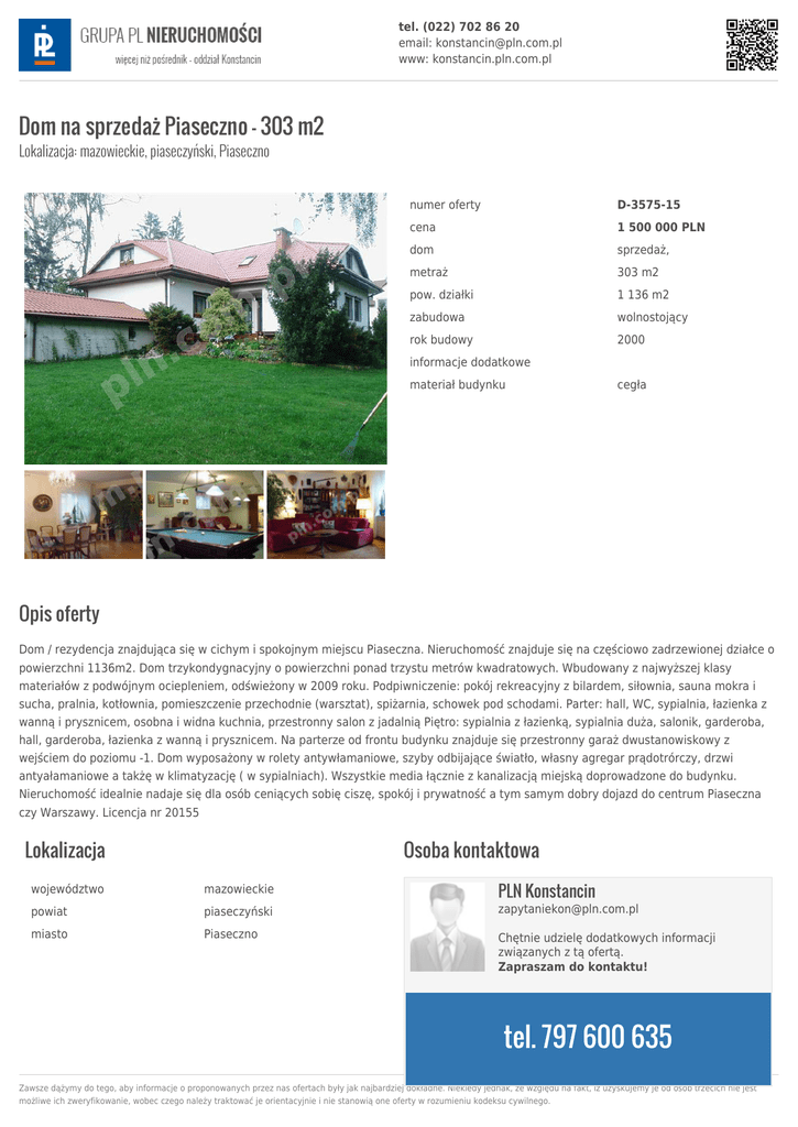 tel. (022) 702 86 20 email: [email protected] www: konstancin.pln.com.pl Dom na sprzedaż Piaseczno - 303 m2 Lokalizacja: mazowieckie, piaseczyński, Piaseczno numer oferty D-3575-15 cena 1 500 000 PLN dom sprzedaż, metraż 303 m2 pow. działki 1 136 m2 zabudowa wolnostojący rok budowy 2000 informacje dodatkowe materiał budynku cegła Opis oferty Dom / rezydencja znajdująca się w cichym i spokojnym miejscu Piaseczna. Nieruchomość znajduje się na częściowo zadrzewionej działce o powierzchni 1136m2. Dom trzykondygnacyjny o powierzchni ponad trzystu metrów kwadratowych. Wbudowany z najwyższej klasy materiałów z podwójnym ociepleniem, odświeżony w 2009 roku. Podpiwniczenie: pokój rekreacyjny z bilardem, siłownia, sauna mokra i sucha, pralnia, kotłownia, pomieszczenie przechodnie (warsztat), spiżarnia, schowek pod schodami. Parter: hall, WC, sypialnia, łazienka z wanną i prysznicem, osobna i widna kuchnia, przestronny salon z jadalnią Piętro: sypialnia z łazienką, sypialnia duża, salonik, garderoba, hall, garderoba, łazienka z wanną i prysznicem. Na parterze od frontu budynku znajduje się przestronny garaż dwustanowiskowy z wejściem do poziomu -1. Dom wyposażony w rolety antywłamaniowe, szyby odbijające światło, własny agregar prądotrórczy, drzwi antyałamaniowe a takżę w klimatyzację ( w sypialniach). Wszystkie media łącznie z kanalizacją miejską doprowadzone do budynku. Nieruchomość idealnie nadaje się dla osób ceniących sobię ciszę, spokój i prywatność a tym samym dobry dojazd do centrum Piaseczna czy Warszawy. Licencja nr 20155 Lokalizacja Osoba kontaktowa PLN Konstancin województwo mazowieckie powiat piaseczyński [email protected] miasto Piaseczno Chętnie udzielę dodatkowych informacji związanych z tą ofertą. Zapraszam do kontaktu! tel. 797 600 635 Zawsze dążymy do tego, aby informacje o proponowanych przez nas ofertach były jak najbardziej dokładne. Niekiedy jednak, ze względu na fakt, iż uzyskujemy je od osób trzecich nie jest możliwe ich zweryfikowanie, wobec czego należy traktować je orientacyjnie i nie stanowią one oferty w rozumieniu kodeksu cywilnego.