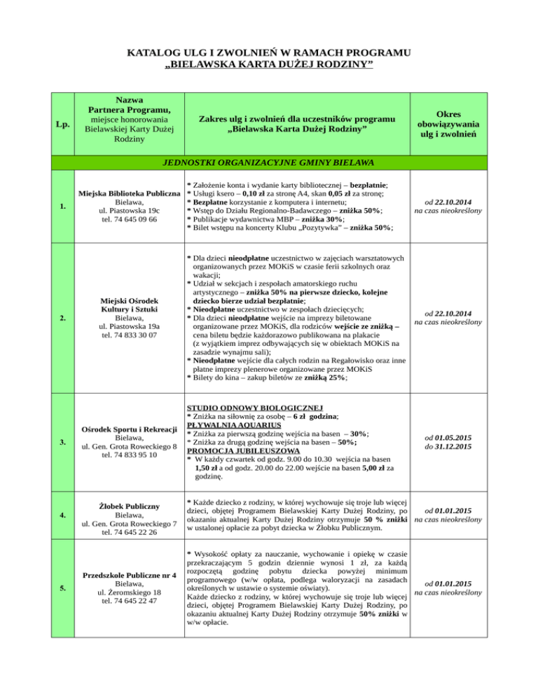 KATALOG ULG I ZWOLNIEŃ W RAMACH PROGRAMU „BIELAWSKA KARTA DUŻEJ RODZINY” Lp. Nazwa Partnera Programu, miejsce honorowania Bielawskiej Karty Dużej Rodziny Zakres ulg i zwolnień dla uczestników programu „Bielawska Karta Dużej Rodziny” Okres obowiązywania ulg i zwolnień JEDNOSTKI ORGANIZACYJNE GMINY BIELAWA 1. 2. 3. 4. 5. Miejska Biblioteka Publiczna Bielawa, ul. Piastowska 19c tel. 74 645 09 66 Miejski Ośrodek Kultury i Sztuki Bielawa, ul. Piastowska 19a tel. 74 833 30 07 Ośrodek Sportu i Rekreacji Bielawa, ul. Gen. Grota Roweckiego 8 tel. 74 833 95 10 Żłobek Publiczny Bielawa, ul. Gen. Grota Roweckiego 7 tel. 74 645 22 26 Przedszkole Publiczne nr 4 Bielawa, ul. Żeromskiego 18 tel. 74 645 22 47 * Założenie konta i wydanie karty bibliotecznej – bezpłatnie; * Usługi ksero – 0,10 zł za stronę A4, skan 0,05 zł za stronę; * Bezpłatne korzystanie z komputera i internetu; * Wstęp do Działu Regionalno-Badawczego – zniżka 50%; * Publikacje wydawnictwa MBP – zniżka 30%; * Bilet wstępu na koncerty Klubu „Pozytywka” – zniżka 50%; od 22.10.2014 na czas nieokreślony * Dla dzieci nieodpłatne uczestnictwo w zajęciach warsztatowych organizowanych przez MOKiS w czasie ferii szkolnych oraz wakacji; * Udział w sekcjach i zespołach amatorskiego ruchu artystycznego – zniżka 50% na pierwsze dziecko, kolejne dziecko bierze udział bezpłatnie; * Nieodpłatne uczestnictwo w zespołach dziecięcych; * Dla dzieci nieodpłatne wejście na imprezy biletowane organizowane przez MOKiS, dla rodziców wejście ze zniżką – cena biletu będzie każdorazowo publikowana na plakacie (z wyjątkiem imprez odbywających się w obiektach MOKiS na zasadzie wynajmu sali); * Nieodpłatne wejście dla całych rodzin na Regałowisko oraz inne płatne imprezy plenerowe organizowane przez MOKiS * Bilety do kina – zakup biletów ze zniżką 25%; od 22.10.2014 na czas nieokreślony STUDIO ODNOWY BIOLOGICZNEJ * Zniżka na siłownię za osobę – 6 zł godzina; PŁYWALNIA AQUARIUS * Zniżka za pierwszą godzinę wejścia na basen – 30%; * Zniżka za drugą godzinę wejścia na basen – 50%; PROMOCJA JUBILEUSZOWA * W każdy czwartek od godz. 9.00 do 10.30 wejścia na basen 1,50 zł a od godz. 20.00 do 22.00 wejście na basen 5,00 zł za godzinę. od 01.05.2015 do 31.12.2015 * Każde dziecko z rodziny, w której wychowuje się troje lub więcej dzieci, objętej Programem Bielawskiej Karty Dużej Rodziny, po od 01.01.2015 okazaniu aktualnej Karty Dużej Rodziny otrzymuje 50 % zniżki na czas nieokreślony w ustalonej opłacie za pobyt dziecka w Żłobku Publicznym. * Wysokość opłaty za nauczanie, wychowanie i opiekę w czasie przekraczającym 5 godzin dziennie wynosi 1 zł, za każdą rozpoczętą godzinę pobytu dziecka powyżej minimum programowego (w/w opłata, podlega waloryzacji na zasadach od 01.01.2015 określonych w ustawie o systemie oświaty). na czas nieokreślony Każde dziecko z rodziny, w której wychowuje się troje lub więcej dzieci, objętej Programem Bielawskiej Karty Dużej Rodziny, po okazaniu aktualnej Karty Dużej Rodziny otrzymuje 50% zniżki w w/w opłacie. PARTNERZY PRYWATNI / FIRMY / PRZEDSIĘBIORSTWA 1. ARTE Wielobranżowa Spółdzielnia Socjalna Bielawa, ul. Nowobielawska 5 tel. 535 933 887 * Remont mieszkań – zniżka 10%; * Usługi hydrauliczne – zniżka 10%; * Usługi wodociągowe – zniżka 10%; * Usługi elektryczne – zniżka 10%; od 22.10.2014 na czas nieokreślony 2. Pretty Woman Ewelina Minkina Bielawa, ul. Piastowska 2a tel. 600 375 074 * Odzież dziewczęca – zniżka 10%; * Pozostały asortyment – zniżka 5%; od 22.10.2014 na czas nieokreślony 3 „G.M.” Grzegorz Machowski Złotnik – jubiler: Bielawa, ul. Bankowa 1 * Zakup dowolnego artykułu – zniżka 10%; tel. 502 208 056 * Wykonanie usługi – zniżka 10%; od 22.10.2014 do 31.12.2015 4. Niepubliczne Przedszkole MONTESSORI Bielawa, os. Włókniarzy 11 tel. 74 645 22 25 * 20% zniżki w opłacie czesnego dla jednego dziecka uczęszczającego do przedszkola; * 20% dodatkowej zniżki w opłacie czesnego dla rodzeństwa (dwoje dzieci uczęszczających do przedszkola) każde następne dziecko bez opłat; * 50% zniżki na jedno wybrane, odpłatne zajęcie dodatkowe; Ulgi, zniżki, (rabaty) będą realizowane w placówkach Partnera oznaczonych logo programu: os. Włókniarzy 11 i ul. Osiedlowa 2a. od 02.09.2015 do 31.08.2016 5. Przedszkole Niepubliczne „Wesołe Krasnoludki” Bielawa, ul. 3 Maja 22 tel. 74 645 22 29 * 20% zniżki w opłacie czesnego na drugie i kolejne dziecko z rodziny (niekoniecznie uczęszczające do przedszkola jednocześnie); * 30% zniżki w opłacie czesnego na drugie i kolejne dziecko, gdy uczęszczają do przedszkola jednocześnie; od 22.10.2014 na czas nieokreślony 6. * 20% zniżki w opłacie czesnego na drugie i kolejne dziecko Przedszkole Niepubliczne (w przypadku jednoczesnego uczęszczania do przedszkola z Oddziałami Integracyjnymi dwojga dzieci z jednej rodziny); Bielawa, * Bezpłatne ubezpieczenie dla drugiego i trzeciego dziecka ul. Wolności 88 z jednej rodziny (w przypadku jednoczesnego uczęszczania do tel. 74 645 22 27 przedszkola); * 50% zniżki w opłacie czesnego dla dziecka niepełnosprawnego; * 50% zniżki w opłacie czesnego dla drugiego dziecka (w przypadku jednoczesnego uczęszczania dwojga dzieci z rodziny do przedszkola); * 100% zniżki w opłacie czesnego dla trzeciego dziecka (w przypadku jednoczesnego uczęszczania trojga dzieci z rodziny do przedszkola); * Przedszkole zapewnia dzieciom wyprawkę papierniczą na początku roku szkolnego; od 22.10.2014 do 31.12.2016 7. Sportowe Przedszkole Niepubliczne Bielawa, ul. Klonowa 4 tel. 74 645 22 28 8. „HD” Henryk Drozdowski Bielawa, pl. Wolności 3 tel. 74 833 36 09 * Sprzedaż obuwia – zniżka 5%; 9. Katering Firma Handlowo-Usługowa Piotr Drozdowski Bielawa, pl. Wolności 3 tel. 530 790 093 * Katering – zniżka 5%; od 22.10.2014 * Asortyment w sklepie (torby i inne wy