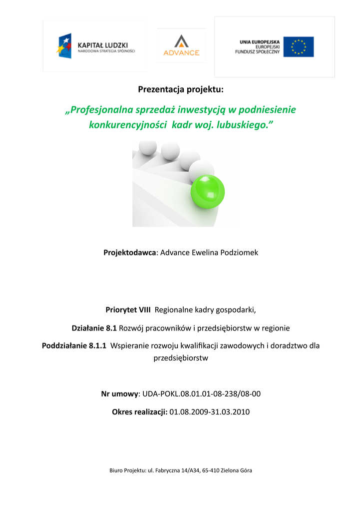 Prezentacja projektu: „Profesjonalna sprzedaż inwestycją w podniesienie konkurencyjności kadr woj. lubuskiego.” Projektodawca: Advance Ewelina Podziomek Priorytet VIII Regionalne kadry gospodarki, Działanie 8.1 Rozwój pracowników i przedsiębiorstw w regionie Poddziałanie 8.1.1 Wspieranie rozwoju kwalifikacji zawodowych i doradztwo dla przedsiębiorstw Nr umowy: UDA-‐POKL.08.01.01-‐08-‐238/08-‐00 Okres realizacji: 01.08.2009-‐31.03.2010 Biuro Projektu: ul. Fabryczna 14/A34, 65-‐410 Zielona Góra CELE PROJEKTU Jak pokazały wyniki badań i analiz, przeprowadzonych na potrzeby opracowania Strategii Rozwoju woj. lubuskiego, drogie oferty edukacyjne i szkoleniowe stanowią ogromną barierę w rozwoju kompetencji handlowych kadr regionu. Słabe kapitałowo i instytucjonalnie przedsiębiorstwa sektora MMiŚP ponoszą coraz niższe nakłady na szkolenia i edukację pracowników w obszarze handlu i sprzedaży, zmniejszając tym samym jeszcze bardziej swoją pozycję konkurencyjną w skali lokalnej jak i globalnej. W obliczu przeanalizowanych uwarunkowań rynkowych, za cel główny zrealizowanego projektu obrano podniesienie zdolności handlowych przedsiębiorców i pracowników mikro, małych i średnich przedsiębiorstw z terenu woj. lubuskiego, niezbędnych do zwiększania efektywności prowadzonej sprzedaży. Cele szczegółowe projektu objęły: 1. Podniesienie wiedzy uczestników szkoleń z zakresu efektywnej sprzedaży. 2. Podniesienie praktycznych umiejętności handlowych. 3. Zwiększenie zdolności komunikacyjnych uczestników szkoleń. Założone przez projektodawcę cele uzasadniała również zgodność z założeniami Programu Operacyjnego Kapitał Ludzki, Strategią Rozwoju Regionalnego i celami służącymi realizacji polityki spójności Unii Europejskiej. GRUPA DOCELOWA Do grupy docelowej projektu zaliczono przedsiębiorców i pracowników mikro, małych i średnich przedsiębiorstw z woj. lubuskiego, pragnący zdobyć lub poszerzyć swoje kwalifikacje z zakresu efektywnej sprzedaży. Projektodawca nie wprowadził żadnych ograniczeń dotyczących wieku, płci, wykształcenia, miejsca zamieszkania czy też niepełnosprawności uczestników projektu. W szkoleniach brali udział zarówno członkowie zarządu przedsiębiorstw, managerowie średniego i wyższego szczebla jak i pracownicy pierwszej linii. Wśród uczestników szkoleń znaleźli się mieszkańcy miast i wsi o zróżnicowanym statucie zawodowym i społecznym. DZIAŁANIA Do kluczowych działań podczas realizacji projektu zaliczono: szkolenia, promocję oraz rekrutację. Działania promocyjne oraz rekrutacyjne prowadzone były od pierwszego miesiąca realizacji projektu i równolegle z realizacją kolejnych szkoleń. Towarzyszył im również bieżący monitoring i ewaluacja, których celem była weryfikacja skuteczności pozostałych działań i stopienia realizacji założonych celów. Przeprowadzona, przy wykorzystaniu m.in. mediów lokalnych i krajowych, kampania promocyjna zapewniła równy dostęp do projektu pracodawcom i pracownikom określonych jako grupa docelowa. Projekt objął realizację 11 szkoleń tematycznych podzielonych na dwa komponenty. Komponent I "Profesjonalny handlowiec" objął szkolenia przeznaczone w szczególności dla pracowników, którym zależy na zdobywaniu i doskonaleniu umiejętności handlowych, związanych z obsługą klienta przy wykorzystaniu nowoczesnych technik sprzedaży. Odbycie całego cyklu szkoleń w ramach tego komponentu pozwoliło uczestnikom szkoleń na uzyskanie kompleksowych umiejętności, które powinien posiadać każdy profesjonalny handlowiec. Projektodawca założył również możliwość dowolnego doboru ilości i rodzaju szkoleń, które były najbardziej interesujące dla każdego uczestnika, z punktu widzenia jego indywidualnych potrzeb. Komponent I objął szkolenia z następujących bloków tematycznych: 1. Zawód "sprzedawca"-‐ 20.10.2009 2. Nowoczesne techniki sprzedaży -‐ 30.10.2009 3. Skuteczne negocjacje handlowe -‐ 06.11.2009 4. Obsługa klienta przez telefon-‐telemarkeing -‐ 20.11.2009 5. Budowanie relacji z klientami -‐ 27.11.2009 6. Zarządzanie czasem i obszarem sprzedaży -‐ 04.12.2009 Na kolejnych szkoleniach komponentu ich uczestnicy mieli możliwość poszerzyć swoją wiedzę i rozwinąć umiejętności związane m.in. z: ‣ przygotowaniem do sprzedaży, ‣ kreowaniem potrzeb klienta, ‣ ustaleniem rzeczywistych potrzeb klienta, ‣ sprawną komunikacją i budowaniem dobrych relacji z klientem, ‣ etapami i fazami rozmowy handlowej, ‣ technikami prezentacji, ‣ budowaniem pozytywnego wizerunku firmy, ‣ znaczeniem motywacji i własnych przekonań w procesie sprzedaży,, ‣ typologią klienta i podziałem klientów, ‣ budowaniem zaufania klienta, ‣ technikami zamknięcia rozmowy sprzedażowej, ‣ metodami pokonywania zastrzeżeń klientów i reakcji na nie, ‣ ideą negocjacji – technikami wywierania wpływu i perswazji, ‣ negocjacjami w biznesie i w windykacji, ‣ negocjacjami z trudnym klientem, ‣ taktykami i błędami w negocjacjach, ‣ cechami dobrego negocjatora, ‣ sprzedażą relacyjną, ‣ charakterystyką rozmówcy, ‣ typami oraz stylami zachowań klientów, ‣ zakłóceniami komunikacyjnymi, ‣ technikami zadawania pytań, ‣ przebiegiem profesjonalnej rozmowy telefonicznej, ‣ rozpoznawaniem potrzeb i chęci zakupu, ‣ procesem decyzyjnym klienta, ‣ aktywnym słuchaniem, ‣ analizą obszaru sprzedaży, ‣ wyznaczanie celów i priorytetów sprzedażowych, ‣ planem sprzedaży i jego efektywnością, ‣ efektywnym planowaniem w zarządzaniu czasem pracy Komponent II "Profesjonalny manager sprzedaży" objął szkolenia przeznaczone w szczególności dla pracowników na kierowniczych stanowiskach w dziale sprzedaży oraz wszystkich, którym zależy na poszerzaniu wiedzy z zakresu strategicznych aspektów kształtowania sprzedaży. Odbycie całego cyklu szkole