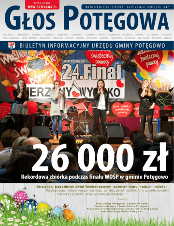 W W W. P OT E G O W O. P L 26 000 zł Rekordowa zbiórka podczas finału WOŚP w gminie Potęgowo STRONA 1 G ŁO S P OTĘG OWA Rekordowa zbiórka dla WOŚP Rekordową kwotę 26 000 zł udało się zebrać podczas akcji 24. Finału Wielkiej Orkiestry Świątecznej Pomocy w Gminie Potęgowo oraz imprezy finałowej, która odbyła się 10 stycznia w Gminnym Centrum Kultury w Potęgowie. Wolontariusze zebrali 10.349,03 zł, z licytacji udało się zebrać kwotę 14.460,97 zł, a ze sklepiku 1.190 zł. T radycyjnie w sali Gminnego Centrum Kultury w Potęgowie orkiestrowy sztab działał w niedzielę od godz. 15:00. Imprezę prowadziły dyrektor Joanna Basiak i pani Dorota Awchimieni. Na scenie wystąpili młodsi i starsi artyści działający przy potęgowskim GOK-u oraz zaproszone zespoły. iędzy występami odbyły się licytacje przedmiotów - gadżetów WOŚP, ale także cennych fantów ofiarowanych przez darczyńców. Drugi już raz odbyła się licytacja „Fotelu Wójta” – czyli jednego dnia pracy spędzonego z Wójtem Gminy Potęgowo Dawidem Litwinem. Mieszkanka Gminy Potęgowo spędziła go za 570 zł. Najdrożej udało się wylicytować obraz podarowany przez panią Annę Dajnowicz, który osiągnął cenę 900 zł. Ogromnym zainteresowaniem cieszyły się także orkiestrowe koszulki, kalendarze, talony, słodkie wypieki oraz gadżety podarowane przez sponsorów. W tym roku po raz pierwszy zlicytowano odpalenie “Światełka do nieba”, które wygrała rodzina państwa Agnieszki i Pawła Nowickich. a scenie prezentowali się soliści i zespoły działające przy GOK: zespół “Mleczaki” przygotowany przez Panią Basię Krasnoborską w składzie: Jan Müller, Maciej Leśniewski, Igor Żółciński, Martyna Piołunkowska, Julia Saganowska, Marta Małek, Aleksandra Jagielska, Aleksandra Socha, Anna Puchacz, Nela Dziecielska, Julia Marchewka, Mateusz Kędra, Borys Zieliński, Inka Malek, Wiktoria Szycko, Maja Łoś; zespół działający przy GOK pod M N STRONA 2 kierunkiem Pana Marcina Gałązki w składzie: Patryk Lemek, Oskar Celban, Magdalena Semak, Wiktoria Kosowsk; zespół “PZPR” w składzie: Zbyszek Ulaszek, Marian Pikus, Romek Pastuszko, Władek Kozłowski, Staszek Princ, Zenek Fir, Andrzej Makuch oraz Klaudia Litych, Karolina Oszmaniec, Nikola Kędra, Patrycja Pikuła przygotowane pod kierunkiem pana Daniela Spoczyńskiego, które zaprezentowały się solo oraz wystąpiły jako zespół “Symulacja”. ystąpił także zespół dziecięcy “Dzwonki” z ZS w Potęgowie oraz zespół młodzieżowy, działający przy MDK w Słupsku, w którym grają i śpiewają: Karolina Oszmaniec, Wiktoria Kosowska, Patrycja Pikuła i Agnieszka Kucharska. Dziewczyny zostały przygotowane przez pana Marcina Gałązkę. W trakcie imprezy, młodzież z koła teatralnego, działającego przy GOK w składzie: Weronika Szczepańska, Remigiusz Ciuńczyk, Michał Baksalerski, W przygotowana przez Panią Monikę Klimczyk, zaprezentowała skecz pt. “Paciaciakowie na pielgrzymce. Pielgrzymka do miejsc śmiesznych”. ajmłodsi goście imprezy uczestniczyli w tańcach animacyjnych, które poprowadziła pani Justynka z pałacu pod Bocianim Gniazdem w Runowie, a dzieci uczestniczące na zajęcia Zumby, pod kierunkiem Pani Aleksandry Ciecholewskiej, zaprezentowały “zumbiakowe” tańce. Na zakończenie finałowego grania na scenie wystąpił zespół “Synkopa” z Lęborka. ównocześnie, w trakcie występów i licytacji, strażacy z OSP w Potęgowie prezentowali pokaz ratownictwa medycznego, podczas którego przedstawili najważniejsze dla ratowania ludzkiego życia zasady udzielania pierwszej pomocy. Natomiast Pani Krystyna Wielgus wykonywała badania ciśnienia tętniczego oraz pomiar poziomu cukru we krwi. N R W W W. P OT E G O W O. P L PODZIĘKOWANIA Serdeczne podziękowania składamy wszystkim wolontariuszom zbierającym na terenie całej Gminy Potęgowo, a więc dzieciom i młodzieży z Zespołu Szkół w Potęgowie, Zespołu Szkół w Łupawie, nauczycielom oraz opiekunom wymienionych jednostek - Paniom Iwonie Górskiej i Monice Klimczyk, a także osobom prywatnym: Pani Joannie Celban z córkami Julią i Wiktorią oraz synem Szymonem, Michałowi Knasiowi, Pani Zofii Szóstakiewicz, członkom Koła Myśliwskie Darzbór ze Słupska oraz najmłodszym wolontariuszom tegorocznego finału: Frankowi Wasylko, Julii Marchewka, Oli i Julii Socha. Wolontariusze zbierający pieniądze do późnych godzin popołudniowych intensywnie kwestowali na ulicach gminy. Serdeczne podziękowania składamy Wójtowi Gminy Potęgowo Panu Dawidowi Litwinowi za udostępnienie transportu. Dziękujemy wszystkim ofiarodawcom wrzucającym datki do puszek oraz biorącym udział w licytacjach, zespołom, grupie teatralnej, solistom występującym podczas tegorocznego finału, dzieciom, młodzieży i dorosłym oraz instruktorom, opiekunom i nauczycielom, dzięki którym wszyscy uczestnicy tegorocznej zbiórki mieli możliwość zobaczenia przepięknych występów. Za umożliwienie zbadania ciśnienia tętniczego oraz poziomu cukru we krwi dziękujemy doktorowi Cezaremu Zielewskiemu oraz Pani Krystynie Wielgus - za wykonywanie tych badań. Finałowe podsumowanie puszek możliwe było dzięki Paniom Elżbiecie Szczepańskiej, Barbarze Tutak, rodzinie Pradlików Agnieszce, Aleksandrze i Robertowi, którzy wytrwale, do późnych godzin nocnych liczyli zebrane pieniądze. Dziękujemy im za ciężką pracę. Serdecznie dziękujemy strażakom z OSP w Potęgowie za przygotowanie pokazu, akustykom Panom: Danielowi Spoczyńskiemu, Marcinowi Gałązce, Maciejowi Basiakowi; za pracę w sklepiku Pani Emilii Świerczyńskiej, Pani Elżbiecie Kędra, Panu Arkowi Damaszkowi, Panu Tomaszowi Wasylko. Pani Marcie Rutkiewicz, Panu Jakubowi Rutkiewicz i Panu Władysławowi Rutkiewicz-Nikorowicz oraz animatorce Pani Justynie z “Pałacu pod Bocianim Gniazdem” w Runowie za organizację tańców animacyjnych dla dzieci. Serdeczne po