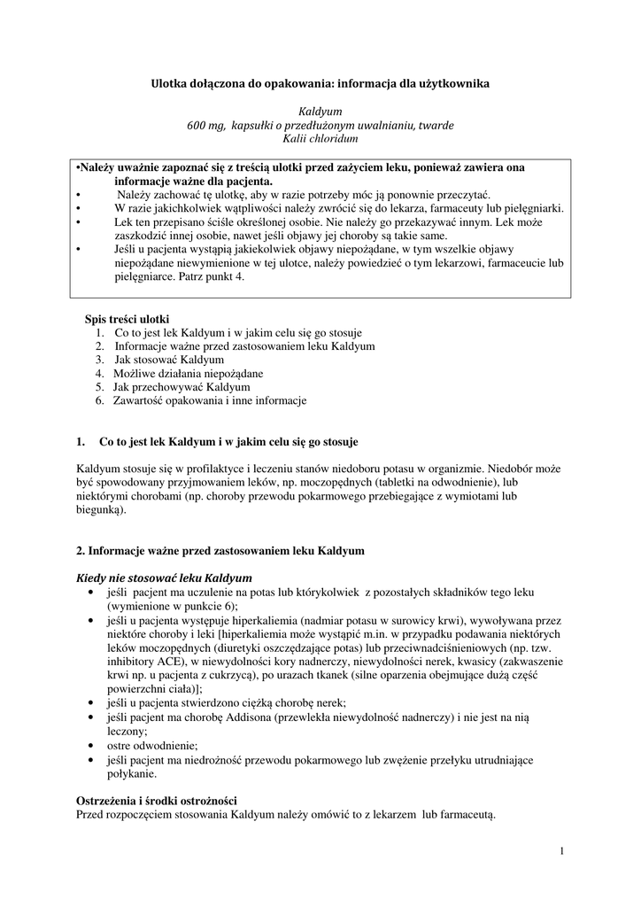 Ulotka dołączona do opakowania: informacja dla użytkownika Kaldyum 600 mg, kapsułki o przedłużonym uwalnianiu, twarde Kalii chloridum •Należy uważnie zapoznać się z treścią ulotki przed zażyciem leku, ponieważ zawiera ona informacje ważne dla pacjenta. • Należy zachować tę ulotkę, aby w razie potrzeby móc ją ponownie przeczytać. • W razie jakichkolwiek wątpliwości należy zwrócić się do lekarza, farmaceuty lub pielęgniarki. • Lek ten przepisano ściśle określonej osobie. Nie należy go przekazywać innym. Lek może zaszkodzić innej osobie, nawet jeśli objawy jej choroby są takie same. • Jeśli u pacjenta wystąpią jakiekolwiek objawy niepożądane, w tym wszelkie objawy niepożądane niewymienione w tej ulotce, należy powiedzieć o tym lekarzowi, farmaceucie lub pielęgniarce. Patrz punkt 4. Spis treści ulotki 1. Co to jest lek Kaldyum i w jakim celu się go stosuje 2. Informacje ważne przed zastosowaniem leku Kaldyum 3. Jak stosować Kaldyum 4. Możliwe działania niepożądane 5. Jak przechowywać Kaldyum 6. Zawartość opakowania i inne informacje 1. Co to jest lek Kaldyum i w jakim celu się go stosuje Kaldyum stosuje się w profilaktyce i leczeniu stanów niedoboru potasu w organizmie. Niedobór może być spowodowany przyjmowaniem leków, np. moczopędnych (tabletki na odwodnienie), lub niektórymi chorobami (np. choroby przewodu pokarmowego przebiegające z wymiotami lub biegunką). 2. Informacje ważne przed zastosowaniem leku Kaldyum Kiedy nie stosować leku Kaldyum • jeśli pacjent ma uczulenie na potas lub którykolwiek z pozostałych składników tego leku (wymienione w punkcie 6); • jeśli u pacjenta występuje hiperkaliemia (nadmiar potasu w surowicy krwi), wywoływana przez niektóre choroby i leki [hiperkaliemia może wystąpić m.in. w przypadku podawania niektórych leków moczopędnych (diuretyki oszczędzające potas) lub przeciwnadciśnieniowych (np. tzw. inhibitory ACE), w niewydolności kory nadnerczy, niewydolności nerek, kwasicy (zakwaszenie krwi np. u pacjenta z cukrzycą), po urazach tkanek (silne oparzenia obejmujące dużą część powierzchni ciała)]; • jeśli u pacjenta stwierdzono ciężką chorobę nerek; • jeśli pacjent ma chorobę Addisona (przewlekła niewydolność nadnerczy) i nie jest na nią leczony; • ostre odwodnienie; • jeśli pacjent ma niedrożność przewodu pokarmowego lub zwężenie przełyku utrudniające połykanie. Ostrzeżenia i środki ostrożności Przed rozpoczęciem stosowania Kaldyum należy omówić to z lekarzem lub farmaceutą. 1 Przed przepisaniem leku lekarz może sprawdzić stężenie potasu we krwi i wykonać badanie EKG. Należy poinformować lekarza o występowaniu owrzodzeń lub innych chorób przewodu pokarmowego. W przypadku jednoczesnego przyjmowania glikozydów naparstnicy (leki stosowane w chorobach serca) należy poinformować o tym lekarza prowadzącego, gdyż nagłe przerwanie stosowania leku Kaldyum może być szkodliwe. W niektórych stanach lekarz może zapisać inny lek zawierający potas, w innych przypadkach natomiast może zalecić przyjmowanie razem z Kaldyum dodatkowego leku. Należy przestrzegać diety przepisanej przez lekarza. Lek Kaldyum a inne leki Należy powiedzieć lekarzowi lub farmaceucie o wszystkich lekach stosowanych obecnie lub ostatnio, a także o lekach, które pacjent planuje stosować. Należy zachować ostrożność przy jednoczesnym stosowaniu Kaldyum z następującymi lekami: • inhibitory ACE (leki stosowane w leczeniu nadciśnienia), leki moczopędne oszczędzające potas, gdyż jednoczesne stosowanie może doprowadzić do bardzo wysokiego stężenia potasu w surowicy krwi; • bogate w potas produkty spożywcze i roślinne (np. liście i korzenie mniszka lekarskiego, banany, pomidory, sok pomarańczowy) zwiększają ryzyko wystąpienia zwiększonego stężenia potasu w surowicy; • blokery receptora angiotensyny II i aliskiren (leki stosowane w leczeniu podwyższonego ciśnienia tętniczego i niektórych chorób serca) mogą prowadzić do zwiększenia stężenia potasu w surowicy; • inhibitory pompy protonowej (leki zmniejszające wydzielanie kwasu żołądkowego) mogą prowadzić do zwiększenia stężenia potasu w surowicy; • niesteroidowe leki przeciwzapalne, leki antycholinergiczne, ponieważ może dojść do nasilenia działań niepożądanych w przewodzie pokarmowym; • glikozydy naparstnicy (stosowane w leczeniu niewydolności serca), leki beta-adrenergiczne (stosowane w leczeniu nadciśnienia i (lub) zaburzeń rytmu serca), heparyna (lek hamujący krzepnięcie krwi), cyklosporyna (lek cytostatyczny). Lekarz może przeprowadzać regularną kontrolę stężenia potasu w surowicy w razie jednoczesnego stosowania któregoś z tych leków z lekiem Kaldyum. W razie wątpliwości dotyczących stosowanych leków należy poradzić się lekarza. Ciąża i karmienie piersią Jeśli pacjentka jest w ciąży lub karmi piersią, przypuszcza że może być w ciąży lub gdy planuje mieć dziecko, powinna poradzić się lekarza lub farmaceuty przed zastosowaniem tego leku. Lek Kaldyum można stosować w okresie ciąży i karmienia piersią, zgodnie ze wskazaniami i zalecanym dawkowaniem. Prowadzenie pojazdów i obsługiwanie maszyn Nie ma żadnych ograniczeń. 3. Jak stosować Kaldyum Ten lek należy zawsze stosować zgodnie z zaleceniem lekarza. W razie wątpliwości należy zwrócić się do lekarza lub farmaceuty. 2 Lekarz ustala dawkowanie według indywidualnych potrzeb pacjenta. Dorośli Profilaktyka: zalecana dawka to 2 lub 3 kapsułki na dobę; Leczenie: zalecana dawka to 5 do 12 kapsułek na dobę, przy regularnej kontroli stężenia potasu w surowicy. Jeśli dawka dobowa przekracza 2 kapsułki, powinna być podawana w dwóch lub większej liczbie dawek podzielonych. Na ogół kapsułkę należy połykać w całości, popijając szklanką wody, w trakcie lub po posiłku. Pacjenci karmieni przez zgłębnik żołą