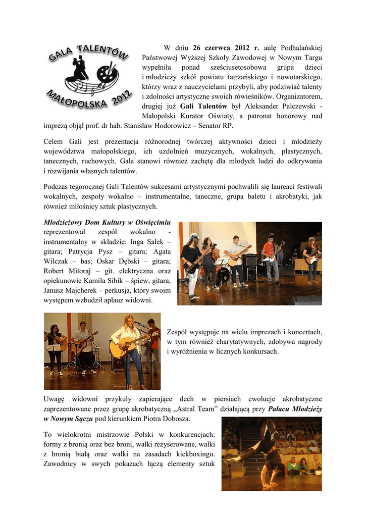 W dniu 26 czerwca 2012 r. aulę Podhalańskiej Państwowej Wyższej Szkoły Zawodowej w Nowym Targu wypełniła ponad sześciusetosobowa grupa dzieci i młodzieży szkół powiatu tatrzańskiego i nowotarskiego, którzy wraz z nauczycielami przybyli, aby podziwiać talenty i zdolności artystyczne swoich rówieśników. Organizatorem, drugiej już Gali Talentów był Aleksander Palczewski Małopolski Kurator Oświaty, a patronat honorowy nad imprezą objął prof. dr hab. Stanisław Hodorowicz – Senator RP. Celem Gali jest prezentacja różnorodnej twórczej aktywności dzieci i młodzieży województwa małopolskiego, ich uzdolnień muzycznych, wokalnych, plastycznych, tanecznych, ruchowych. Gala stanowi również zachętę dla młodych ludzi do odkrywania i rozwijania własnych talentów. Podczas tegorocznej Gali Talentów sukcesami artystycznymi pochwalili się laureaci festiwali wokalnych, zespoły wokalno – instrumentalne, taneczne, grupa baletu i akrobatyki, jak również miłośnicy sztuk plastycznych. Młodzieżowy Dom Kultury w Oświęcimiu reprezentował zespół wokalno instrumentalny w składzie: Inga Sałek – gitara; Patrycja Pysz – gitara; Agata Wilczak – bas; Oskar Dębski – gitara; Robert Mitoraj – git. elektryczna oraz opiekunowie Kamila Sibik – śpiew, gitara; Janusz Majcherek – perkusja, który swoim występem wzbudził aplauz widowni. Zespół występuje na wielu imprezach i koncertach, w tym również charytatywnych, zdobywa nagrody i wyróżnienia w licznych konkursach. Uwagę widowni przykuły zapierające dech w piersiach ewolucje akrobatyczne zaprezentowane przez grupę akrobatyczną „Astral Team” działającą przy Pałacu Młodzieży w Nowym Sączu pod kierunkiem Piotra Dobosza. To wielokrotni mistrzowie Polski w konkurencjach: formy z bronią oraz bez broni, walki reżyserowane, walki z bronią białą oraz walki na zasadach kickboxingu. Zawodnicy w swych pokazach łączą elementy sztuk walki z akrobatyką oraz elementami break dance, na wzór nowej popularnej na zachodzie konkurencji - Extreme Martial Arts (XMA). Piękno, delikatność i precyzję ruchu zaprezentowały dziewczęta z grupy baletowej „Adagio” - Pałac Młodzieży w Nowym Sączu, które wykonały dwa układy taneczne do muzyki Sergiusza Prokofiewa i Gianniego Pavesi. Grupa powstała w 1997 r. Jej choreografem i opiekunem jest Urszula Baziak. Obecnie zespół liczy 62 osoby w wieku od 5- 17 lat. Dziewczęta pracują w pięciu zróżnicowanych wiekowo grupach. Mają na swoim koncie wiele nagród i wyróżnień m.in.: „Laureata Perłowej Pointy” na Małopolskich spotkaniach tanecznych w Krynicy –Zdroju, Nagrodę specjalną na „Jasielskim Festiwalu tańca”, nagrody i wyróżnienia na „Dziecięcej Wiośnie Artystycznej” - Nowy Sącz, jak również nagrania w Telewizji Polskiej Kraków oraz występy w Kiskunhalas na Węgrzech. Ponadto, na zaproszenie Pani Prezydentowej Jolanty Kwaśniewskiej grupa baletowa „Adagio” gościła w Pałacu Prezydenckim w Warszawie. Rejon tarnowski reprezentował prowadzony przez Roberta Żurka zespół wokalny „Szmer”, który tworzą uczennice Zespołu Szkół w Tymowej i Zespołu Szkół w Domosławicach: Agnieszka Bednarek, Aleksandra Sikora, Aleksandra Fyda, Kinga Jakóbczyk. Dziewczęta mają na swoim koncie wyróżnienie w powiatowym przeglądzie XXV Małopolskiego Festiwalu Form Muzycznych i Tanecznych „Talenty Małopolski”. Publiczność uczestnicząca w Gali mogła podziwiać zdolności wokalne solistek Miejskiego Ośrodka Kultury w Nowym Targu: Julii Mokrackiej, Magdy Panek, Marty Skarby, Martyny Łęckiej, Izy Guroś i Martyny Plewy oraz Daniela Ramsa i Katarzyny Szczepaniak z I Gimnazjum i Liceum Ogólnokształcącego im. Jana Długosza w Nowym Sączu. Serca publiczności podbiła najmłodsza uczestniczka Gali Talentów - Martyna Plewa, uczestniczka zajęć Studia Piosenki w Miejskim Ośrodku Kultury w Nowym Targu. Aplauz widowni wzbudził występ grupy tanecznej „Silver stars” z Zespołu Szkół w Tymowej. Grupa działa od 6 lat pod opieką Anny Witkowskiej. Prezentuje pokazy taneczne na szkolnych imprezach okolicznościowych, piknikach środowiskowych. Brała kilkakrotnie udział w powiatowych zawodach cheerleaders w Borzęcinie. W roku 2012 grupa „Silver stars” sięgnęła po wyróżnienie w Powiatowym Przeglądzie XXV Małopolskiego Festiwalu Form Muzycznych i Tanecznych „Talenty Małopolski, zdobyła II miejsce w powiatowych zawodach cheerleaders oraz III miejsce w otwartym Turnieju Tańca Nowoczesnego w Gnojniku. Dopełnienie występów dzieci i młodzieży na scenie stanowiła wystawa dzieł plastycznych (grafiki, rzeźby, ceramiki, malarstwa na szkle) uczestników zajęć artystycznych prowadzonych przez Powiatowy Młodzieżowy Dom Kultury w Nowym Targu, którzy w 14 międzynarodowych, 14 ogólnopolskich i 12 wojewódzkich konkursach zdobyli ogółem 122 nagrody, 101 wyróżnień i 57 kwalifikacji do wystaw. Laureaci nagród to: Sylwia Marszałek, Karolina Fąfrowicz, Piotr Budzyk, Maria Budzyk, Sebastian Bryja, Grzegorz Długopolski, Miłosz Długopolski, Julia Krzysztof, Ola Maciaś, Ola Chowaniec, Marlena Smarduch, Matylda Grojec, Andżelika Fryźlewicz, Agnieszka Solecka, Maria Jarkiewicz, Rafał Bańka, Amelia Zgama, Agnieszka Truty, Alicja Guzik, Emilia Prusak, Wiktoria Prusak, Łukasz Mrożek, Jan Mrożek, Oliwia Sral, Patrycja Stołowska, Katarzyna Zając, Anna Mrożek, Agnieszka Galarowicz, Dorota Pęksa, Kornelia Furca. Opiekunami młodych artystów są nauczyciele: Maria Bogdał, Urszula Michorczyk i Zofia Mrożek. Gala Talentów Małopolska 2012 była szczególnym wydarzeniem artystycznym, a za sprawą prowadzących - Mirosława Spery i Tomasza Zielińskiego, także okazją do wspólnej radosnej zabawy. Opracowała: Marzena Bąk - st. wiz. Kuratorium Oświaty w Krakowie