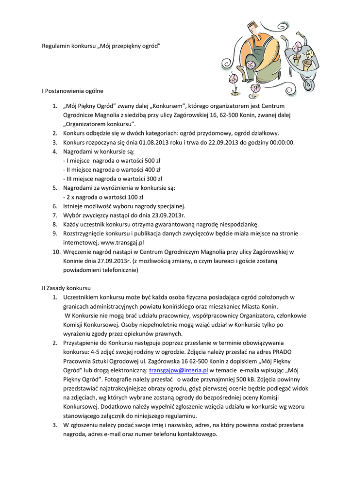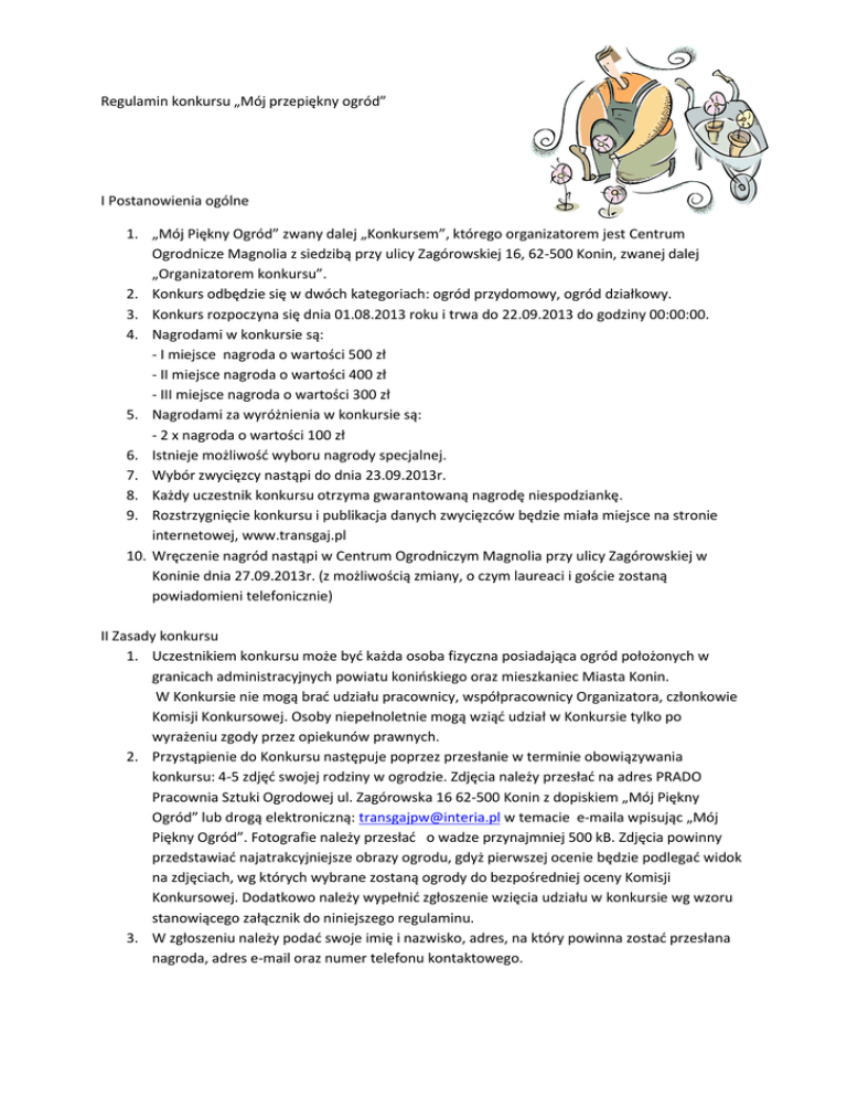 Regulamin konkursu „Mój przepiękny ogród” I Postanowienia ogólne 1. „Mój Piękny Ogród” zwany dalej „Konkursem”, którego organizatorem jest Centrum Ogrodnicze Magnolia z siedzibą przy ulicy Zagórowskiej 16, 62-500 Konin, zwanej dalej „Organizatorem konkursu”. 2. Konkurs odbędzie się w dwóch kategoriach: ogród przydomowy, ogród działkowy. 3. Konkurs rozpoczyna się dnia 01.08.2013 roku i trwa do 22.09.2013 do godziny 00:00:00. 4. Nagrodami w konkursie są: - I miejsce nagroda o wartości 500 zł - II miejsce nagroda o wartości 400 zł - III miejsce nagroda o wartości 300 zł 5. Nagrodami za wyróżnienia w konkursie są: - 2 x nagroda o wartości 100 zł 6. Istnieje możliwość wyboru nagrody specjalnej. 7. Wybór zwycięzcy nastąpi do dnia 23.09.2013r. 8. Każdy uczestnik konkursu otrzyma gwarantowaną nagrodę niespodziankę. 9. Rozstrzygnięcie konkursu i publikacja danych zwycięzców będzie miała miejsce na stronie internetowej, www.transgaj.pl 10. Wręczenie nagród nastąpi w Centrum Ogrodniczym Magnolia przy ulicy Zagórowskiej w Koninie dnia 27.09.2013r. (z możliwością zmiany, o czym laureaci i goście zostaną powiadomieni telefonicznie) II Zasady konkursu 1. Uczestnikiem konkursu może być każda osoba fizyczna posiadająca ogród położonych w granicach administracyjnych powiatu konińskiego oraz mieszkaniec Miasta Konin. W Konkursie nie mogą brać udziału pracownicy, współpracownicy Organizatora, członkowie Komisji Konkursowej. Osoby niepełnoletnie mogą wziąć udział w Konkursie tylko po wyrażeniu zgody przez opiekunów prawnych. 2. Przystąpienie do Konkursu następuje poprzez przesłanie w terminie obowiązywania konkursu: 4-5 zdjęć swojej rodziny w ogrodzie. Zdjęcia należy przesłać na adres PRADO Pracownia Sztuki Ogrodowej ul. Zagórowska 16 62-500 Konin z dopiskiem „Mój Piękny Ogród” lub drogą elektroniczną: [email protected] w temacie e-maila wpisując „Mój Piękny Ogród”. Fotografie należy przesłać o wadze przynajmniej 500 kB. Zdjęcia powinny przedstawiać najatrakcyjniejsze obrazy ogrodu, gdyż pierwszej ocenie będzie podlegać widok na zdjęciach, wg których wybrane zostaną ogrody do bezpośredniej oceny Komisji Konkursowej. Dodatkowo należy wypełnić zgłoszenie wzięcia udziału w konkursie wg wzoru stanowiącego załącznik do niniejszego regulaminu. 3. W zgłoszeniu należy podać swoje imię i nazwisko, adres, na który powinna zostać przesłana nagroda, adres e-mail oraz numer telefonu kontaktowego. 4. Dokonując oceny ogrodów komisja konkursowa, w uzgodnieniu z właścicielem terenu, zastrzega sobie możliwość wizji lokalnej w umówionym terminie. 5. Kryterium oceny będą podlegać: - ocena kompozycji elementów ogrodu 0-5 pkt.; - racjonalne urządzenie części wypoczynkowej 0-5pkt.; - dobór roślin zdobiących ogród przez cały okres wegetacji 0-5pkt.; - kwietniki, skalniaki, murki kwiatowe, pergole 0-5 pkt.; - trawniki i ich utrzymanie 0-5 pkt.; - ogólne wrażenia estetyczne 0-5 pkt. 6. Każdy uczestnik może tylko raz wysłać zgłoszenie do Konkursu. 7. Poprzez wysłanie e-mail lub wysłanie listu uczestnik akceptuje treść Regulaminu zobowiązuje się stosować warunki i zasady określone w Regulaminie dotyczące przeprowadzonego Konkursu. 8. Zwycięzcy Konkursu oraz osoby nagrodzone wyróżnieniami zostaną wyłonione przez Komisję Konkursową. 9. W skład Komisji Konkursowej wejdą: projektant ogrodów Sonia Ostrowska, architekt krajobrazu Jacek Grabarczyk, oraz pracownicy biura 10. Uczestnik ma prawo do otrzymania tylko jednej nagrody. 11. Nagroda nie podlega zamianie na inną nagrodę rzeczową lub na jej równowartość pieniężną. 12. Zwycięzca, któremu została przyznana nagroda, nie może przenieść praw do przyznanej nagrody na osoby trzecie. 13. Zdobywca nagrody o tym fakcie zostanie poinformowany telefonicznie, a następnie drogą pocztową. Koordynator konkursu trzykrotnie podejmie próbę nawiązania kontaktu telefonicznego w ciągu 48 godzin od daty wyłonienia zwycięzcy. 14. Nagroda dla uczestnika Konkursu nie przekroczy kwoty 760 zł. III Prawa Autorskie 1. Organizator nabywa na własność zdjęcia zgłoszone do konkursu. 2. Poprzez uczestnictwo w konkursie uczestnik wyraża zgodę na przeniesienie na Organizatora autorskich praw majątkowych do zdjęć zgłoszonych do Organizatora wszelkich znanych w chwili wydania nagrody polach eksploatacji, w tym praw do wykorzystania zdjęcia poprzez jego publikację w prasie, Internecie, telewizji lub na innych nośnikach reklamy, bez prawa autora do odrębnego wynagrodzenia. IV Postanowienia końcowe 1. Brak akceptacji Regulaminu Konkursu oraz niespełnienie warunków określonych w Regulaminie powodują automatyczną dyskwalifikację danego uczestnika Konkursu. 2. Biorąc udział w Konkursie, uczestnik oświadcza, iż ma świadomość, że udział w Konkursie wiąże się z podaniem przez uczestnika danych osobowych, które Organizator będzie przetwarzał na potrzeby realizacji Konkursu. 3. Biorąc udział w konkursie, jego uczestnik wyraża zgodę na opublikowanie imienia, nazwiska, miejsca zamieszkania oraz przesłanych przez siebie zdjęć, jeżeli zostanie on jednym ze zwycięzców Konkursu. 4. Uczestnik ma prawo wglądu do swoich danych osobowych, ich poprawiania oraz zgłaszania żądania zaprzestania ich przetwarzania. Prawo to może być wykonywane poprzez przesłanie odpowiedniego wniosku w formie pisemnej na adres Organizatora konkursu. 5. Organizator zastrzega sobie prawo do zmian Regulaminu w każdym czasie bez podania przyczyny. 6. Uczestnik jest zobowiązany niezwłocznie powiadomić Organizatora o zmianie adresu lub innych danych podanych w zgłoszeniu. Organizator nie ponosi odpowiedzialności za podanie przez uczestnika niewłaściwego adresu lub innych danych uniemożliwiających jego identyfikację. 7. Organizator konkursu nie ponosi odpowiedzialności za działalność podmiotów 