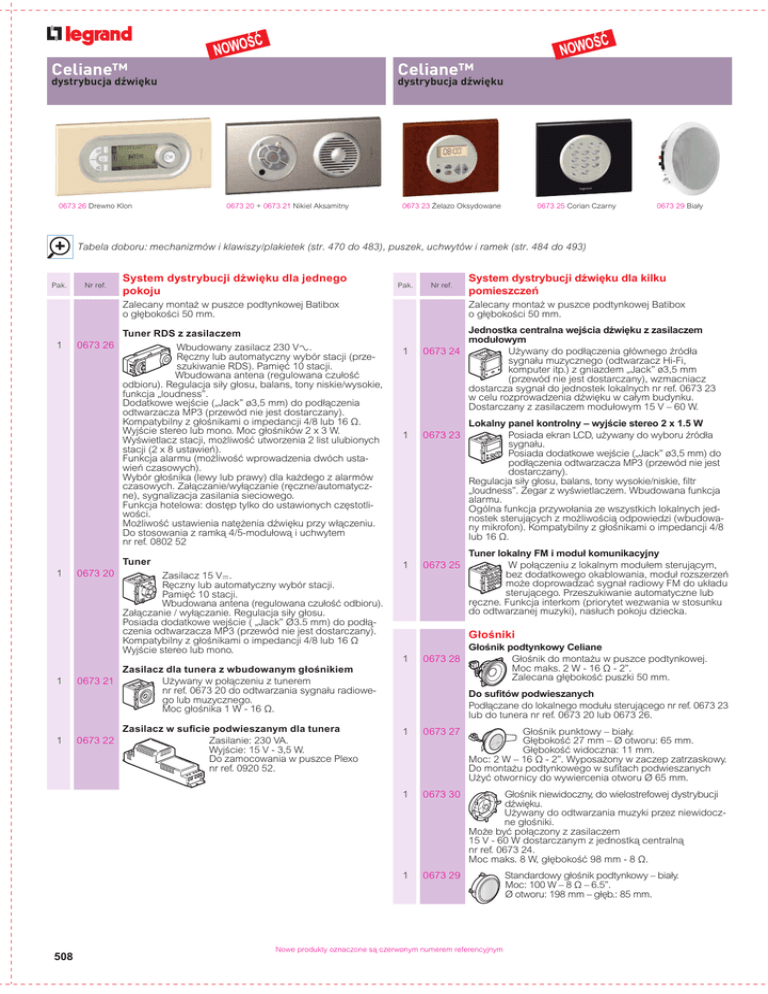 B C M Y SLUR CMY B C 0673 25 Corian Czarny CMY M Y 70% CMY B C 0673 23 Żelazo Oksydowane 70% M Y SLUR CMY B C M Y 70% 0673 20 + 0673 21 Nikiel Aksamitny Y CMY B C M Y SLUR CMY B 0673 26 Drewno Klon M dystrybucja dźwięku 0673 29 Biały Tabela doboru: mechanizmów i klawiszy/plakietek (str. 470 do 483), puszek, uchwytów i ramek (str. 484 do 493) Pak. Nr ref. System dystrybucji dźwięku dla jednego pokoju Pak. Nr ref. Zalecany montaż w puszce podtynkowej Batibox o głębokości 50 mm. Zalecany montaż w puszce podtynkowej Batibox o głębokości 50 mm. Tuner RDS z zasilaczem 1 0673 26 Wbudowany zasilacz 230 VA. Ręczny lub automatyczny wybór stacji (przeszukiwanie RDS). Pamięć 10 stacji. Wbudowana antena (regulowana czułość odbioru). Regulacja siły głosu, balans, tony niskie/wysokie, funkcja „loudness”. Dodatkowe wejście („Jack” ø3,5 mm) do podłączenia odtwarzacza MP3 (przewód nie jest dostarczany). Kompatybilny z głośnikami o impedancji 4/8 lub 16 Ω. Wyjście stereo lub mono. Moc głośników 2 x 3 W. Wyświetlacz stacji, możliwość utworzenia 2 list ulubionych stacji (2 x 8 ustawień). Funkcja alarmu (możliwość wprowadzenia dwóch ustawień czasowych). Wybór głośnika (lewy lub prawy) dla każdego z alarmów czasowych. Załączanie/wyłączanie (ręczne/automatyczne), sygnalizacja zasilania sieciowego. Funkcja hotelowa: dostęp tylko do ustawionych częstotliwości. Możliwość ustawienia natężenia dźwięku przy włączeniu. Do stosowania z ramką 4/5-modułową i uchwytem nr ref. 0802 52 Tuner 1 0673 20 1 1 508 0673 21 0673 22 Jednostka centralna wejścia dźwięku z zasilaczem modułowym 0673 24 Używany do podłączenia głównego źródła sygnału muzycznego (odtwarzacz Hi-Fi, komputer itp.) z gniazdem „Jack” ø3,5 mm (przewód nie jest dostarczany), wzmacniacz dostarcza sygnał do jednostek lokalnych nr ref. 0673 23 w celu rozprowadzenia dźwięku w całym budynku. Dostarczany z zasilaczem modułowym 15 V – 60 W. 1 0673 23 1 0673 25 Zasilacz 15 V=. Ręczny lub automatyczny wybór stacji. Pamięć 10 stacji. Wbudowana antena (regulowana czułość odbioru). Załączanie / wyłączanie. Regulacja siły głosu. Posiada dodatkowe wejście ( „Jack” Ø3.5 mm) do podłączenia odtwarzacza MP3 (przewód nie jest dostarczany). Kompatybilny z głośnikami o impedancji 4/8 lub 16 Ω Wyjście stereo lub mono. 0673 28 Zasilacz dla tunera z wbudowanym głośnikiem Używany w połączeniu z tunerem nr ref. 0673 20 do odtwarzania sygnału radiowego lub muzycznego. Moc głośnika 1 W - 16 Ω. Zasilacz w suficie podwieszanym dla tunera Zasilanie: 230 VA. Wyjście: 15 V - 3,5 W. Do zamocowania w puszce Plexo nr ref. 0920 52. Lokalny panel kontrolny – wyjście stereo 2 x 1.5 W Posiada ekran LCD, używany do wyboru źródła sygnału. Posiada dodatkowe wejście („Jack” ø3,5 mm) do podłączenia odtwarzacza MP3 (przewód nie jest dostarczany). Regulacja siły głosu, balans, tony wysokie/niskie, filtr „loudness”. Zegar z wyświetlaczem. Wbudowana funkcja alarmu. Ogólna funkcja przywołania ze wszystkich lokalnych jednostek sterujących z możliwością odpowiedzi (wbudowany mikrofon). Kompatybilny z głośnikami o impedancji 4/8 lub 16 Ω. Tuner lokalny FM i moduł komunikacyjny W połączeniu z lokalnym modułem sterującym, bez dodatkowego okablowania, moduł rozszerzeń może doprowadzać sygnał radiowy FM do układu sterującego. Przeszukiwanie automatyczne lub ręczne. Funkcja interkom (priorytet wezwania w stosunku do odtwarzanej muzyki), nasłuch pokoju dziecka. Głośniki 1 1 System dystrybucji dźwięku dla kilku pomieszczeń Głośnik podtynkowy Celiane Głośnik do montażu w puszce podtynkowej. Moc maks. 2 W - 16 Ω - 2”. Zalecana głębokość puszki 50 mm. Do sufitów podwieszanych Podłączane do lokalnego modułu sterującego nr ref. 0673 23 lub do tunera nr ref. 0673 20 lub 0673 26. 1 0673 27 Głośnik punktowy – biały. Głębokość 27 mm – Ø otworu: 65 mm. Głębokość widoczna: 11 mm. Moc: 2 W – 16 Ω - 2”. Wyposażony w zaczep zatrzaskowy. Do montażu podtynkowego w sufitach podwieszanych Użyć otwornicy do wywiercenia otworu Ø 65 mm. 1 0673 30 Głośnik niewidoczny, do wielostrefowej dystrybucji dźwięku. Używany do odtwarzania muzyki przez niewidoczne głośniki. Może być połączony z zasilaczem 15 V - 60 W dostarczanym z jednostką centralną nr ref. 0673 24. Moc maks. 8 W, głębokość 98 mm - 8 Ω. 1 0673 29 Nowe produkty oznaczone są czerwonym numerem referencyjnym Standardowy głośnik podtynkowy – biały. Moc: 100 W – 8 Ω – 6.5”. Ø otworu: 198 mm – głęb.: 85 mm. C Celiane™ dystrybucja dźwięku B Celiane™ C M Y