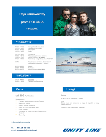 *18/02/2017 10:00 – 11:30 12:00 – 13:00 13:00 – 04:00 13:00 – 15:00 Transport do Świnoujścia Odprawa na terminalu OPEN BAR Obiad 16:00 – 16:05 16:05 – 16:10 16:10 – 17:20 17:20 – 18:00 Przywitanie Pokaz przygotowania drinków Występ kabaretu NOWAKI Prezentacja i degustacja piwa PILSNER 20:15 Przypłynięcie do Ystad, dla chętnych zwiedzanie miasteczka z pilotem 22:00 – 00:00 23:00 – 04:00 23:30 – 00:30 Kolacja Dyskoteka Koncert zespołu MASTERS *19/02/2017 07:00 – 09:00 09:00 – 10:30 Śniadanie Transport do Szczecina Uwagi Cena od 395 PLN/osoba Cena zawiera: Przejazd w obie strony promem Polonia Miejsce w kabinie Obiad , kolację, śniadanie Open bar podczas całego rejsu Kawa i ciastko Transport na trasie Szczecin ŚwinoujścieSzczecin Rozrywkę Informacja i rezerwacja: 091 35 95 600 e-mail [email protected] tel. Dopłaty: 41,40 PLN - za kabinę dla 1 osoby Inne: Oferta musi być opłacona w ciągu 2 tygodni od daty zarezerwowania Zakupiony bilet nie podlega zwrotowi! Opis atrakcji MASTERS Masters – polski zespół wykonujący muzykę z pogranicza disco polo i dance. Grupa została założona w 2007 roku w Zambrowie. Liderem, założycielem i autorem większości utworów jest Paweł Jasionowski. KABARET NOWAKI Sami o sobie: Zawiązaliśmy się w maju 2012 roku n.e. Zwiemy, a właściwie ksywujemy się barciś i mimi. Niektórzy z Was, drodzy czytacze, mogą kojarzyć nas z formacji: Babeczki z Rodzynkiem i Hlynur. Słusznie. Do niedawna je współtworzyliśmy. Skecze piszemy oczywiście po to, żeby widza rozbawić. Ale nie tylko. Staramy się, żeby były „o czymś”. Jednak jest to staranność nienachalna, unikamy dydaktyki. Jak ktoś chce się tylko pośmiać, to się tylko pośmieje. Jak ktoś szuka czegoś więcej, to znajdzie. Obserwujemy świat i szukamy tematów dotyczących Was i nas. Nie pokazujemy ich jednak w skali 1:1. Zawsze przetwarzamy rzeczywistość. Podkręcamy absurdalność sytuacji. FOTORELACJA Osoby, które będą chciały po imprezie otrzymać linka do strony, na której będzie można obejrzeć fotorelacje z wydarzenia proszone są o pozostawienie aktualnego adresu mail podczas dokonania rezerwacji. *Program ma charakter orientacyjny, a wskazane godziny mogą ulec zmianom. Informacja i rezerwacja: 091 35 95 600 e-mail [email protected] tel.