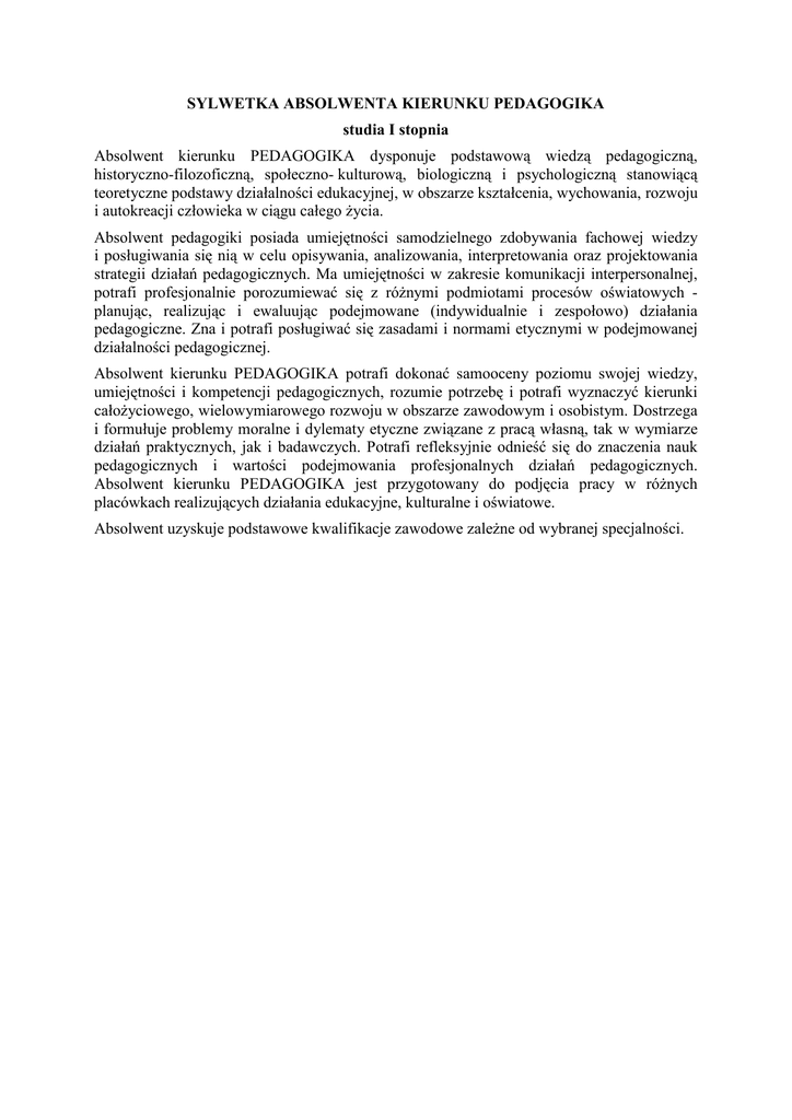 SYLWETKA ABSOLWENTA KIERUNKU PEDAGOGIKA studia I stopnia Absolwent kierunku PEDAGOGIKA dysponuje podstawową wiedzą pedagogiczną, historyczno-filozoficzną, społeczno- kulturową, biologiczną i psychologiczną stanowiącą teoretyczne podstawy działalności edukacyjnej, w obszarze kształcenia, wychowania, rozwoju i autokreacji człowieka w ciągu całego Ŝycia. Absolwent pedagogiki posiada umiejętności samodzielnego zdobywania fachowej wiedzy i posługiwania się nią w celu opisywania, analizowania, interpretowania oraz projektowania strategii działań pedagogicznych. Ma umiejętności w zakresie komunikacji interpersonalnej, potrafi profesjonalnie porozumiewać się z róŜnymi podmiotami procesów oświatowych planując, realizując i ewaluując podejmowane (indywidualnie i zespołowo) działania pedagogiczne. Zna i potrafi posługiwać się zasadami i normami etycznymi w podejmowanej działalności pedagogicznej. Absolwent kierunku PEDAGOGIKA potrafi dokonać samooceny poziomu swojej wiedzy, umiejętności i kompetencji pedagogicznych, rozumie potrzebę i potrafi wyznaczyć kierunki całoŜyciowego, wielowymiarowego rozwoju w obszarze zawodowym i osobistym. Dostrzega i formułuje problemy moralne i dylematy etyczne związane z pracą własną, tak w wymiarze działań praktycznych, jak i badawczych. Potrafi refleksyjnie odnieść się do znaczenia nauk pedagogicznych i wartości podejmowania profesjonalnych działań pedagogicznych. Absolwent kierunku PEDAGOGIKA jest przygotowany do podjęcia pracy w róŜnych placówkach realizujących działania edukacyjne, kulturalne i oświatowe. Absolwent uzyskuje podstawowe kwalifikacje zawodowe zaleŜne od wybranej specjalności. Nazwa jednostki prowadzącej kierunek: WYDZIAŁ PEDAGOGIKI I PSYCHOLOGII Kierunek: PEDAGOGIKA Specjalność: animacja kultury z arteterapią Studia: pierwszego stopnia Profil kształcenia: ogólnoakademicki Absolwent kierunku pedagogika, o specjalności animacja kultury z arteterapią studiów I stopnia, posiada wiedzę o kulturze, sztuce, o edukacji filmowej, teatralnej i literackiej, dotyczącą multimediów, edukacji muzycznej (ze szczególnym uwzględnieniem edukacji arteterapeutycznej oraz animacyjnej) i plastycznej oraz animacji społeczno-kulturowej. Zna sposoby krytycznej analizy zjawisk kulturowych, wybrane kategorie estetyczne, elementy dzieła plastycznego, i filmowego oraz narzędzia warsztatu artystycznego. Posiada wiedzę na temat działań marketingowych podczas planowania i organizowania przedsięwzięć w sferze kultury, zna zasady diagnozy warunków animacji społeczno-kulturowej, podstawowe metody i techniki terapeutyczne ze szczególnym uwzględnieniem elementów arteterapii, muzykoterapii, biblioterapii. Zna podstawowe teorie mediów, cechy przekazu medialnego, podstawowe modele komunikacji i ich związki z przemianami kultury. Posiada umiejętności realizacji własnych koncepcji artystycznych, przygotowania wystąpień publicznych z zachowaniem zasad pracy nad tekstem, potrafi przygotować i przeprowadzić działania w zakresie animacji i edukacji kulturalnej na podstawie przeprowadzonej diagnozy potrzeb kulturalnych, opracować strategię marketingową i zorganizować róŜne formy promocji działań animacyjnych w polu kultury. Posiada umiejętności stosowania technik terapeutycznych. Absolwent pedagogiki, o specjalności animacja kultury z arteterapią, wykazuje się odpowiedzialnością i wytrwałością w realizacji zamierzonych celów, kontroluje własne zachowania i potrafi opanować emocje związane z publicznymi wystąpieniami, ma świadomość waŜności sztuki, muzyki, plastyki i literatury w działalności pedagogicznej i terapeutycznej. Absolwent posiada kwalifikacje do podjęcia pracy w instytucjach kultury, oświaty, ośrodkach terapeutycznych, instytucjach samorządowych i pozarządowych, stowarzyszeniach o charakterze działalności społeczno-kulturalnej, w turystyce i promocji zdrowia, a takŜe w środkach masowego przekazu. Absolwent specjalności jest przygotowany do podjęcia autorskich działań związanych z animacją kultury w skali lokalnej i ponadlokalnej.