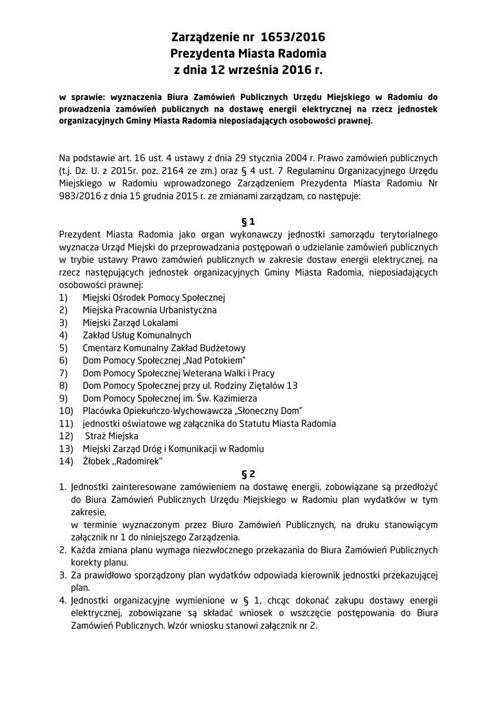 Zarządzenie nr 1653/2016 Prezydenta Miasta Radomia z dnia 12 września 2016 r. w sprawie: wyznaczenia Biura Zamówień Publicznych Urzędu Miejskiego w Radomiu do prowadzenia zamówień publicznych na dostawę energii elektrycznej na rzecz jednostek organizacyjnych Gminy Miasta Radomia nieposiadających osobowości prawnej. Na podstawie art. 16 ust. 4 ustawy z dnia 29 stycznia 2004 r. Prawo zamówień publicznych (t.j. Dz. U. z 2015r. poz. 2164 ze zm.) oraz § 4 ust. 7 Regulaminu Organizacyjnego Urzędu Miejskiego w Radomiu wprowadzonego Zarządzeniem Prezydenta Miasta Radomiu Nr 983/2016 z dnia 15 grudnia 2015 r. ze zmianami zarządzam, co następuje: §1 Prezydent Miasta Radomia jako organ wykonawczy jednostki samorządu terytorialnego wyznacza Urząd Miejski do przeprowadzania postępowań o udzielanie zamówień publicznych w trybie ustawy Prawo zamówień publicznych w zakresie dostaw energii elektrycznej, na rzecz następujących jednostek organizacyjnych Gminy Miasta Radomia, nieposiadających osobowości prawnej: 1) Miejski Ośrodek Pomocy Społecznej 2) Miejska Pracownia Urbanistyczna 3) Miejski Zarząd Lokalami 4) Zakład Usług Komunalnych 5) Cmentarz Komunalny Zakład Budżetowy 6) Dom Pomocy Społecznej „Nad Potokiem’’ 7) Dom Pomocy Społecznej Weterana Walki i Pracy 8) Dom Pomocy Społecznej przy ul. Rodziny Ziętalów 13 9) Dom Pomocy Społecznej im. Św. Kazimierza 10) Placówka Opiekuńczo-Wychowawcza „Słoneczny Dom’’ 11) jednostki oświatowe wg załącznika do Statutu Miasta Radomia 12) Straż Miejska 13) Miejski Zarząd Dróg i Komunikacji w Radomiu 14) Żłobek ,,Radomirek’’ §2 1. Jednostki zainteresowane zamówieniem na dostawę energii, zobowiązane są przedłożyć do Biura Zamówień Publicznych Urzędu Miejskiego w Radomiu plan wydatków w tym zakresie, w terminie wyznaczonym przez Biuro Zamówień Publicznych, na druku stanowiącym załącznik nr 1 do niniejszego Zarządzenia. 2. Każda zmiana planu wymaga niezwłocznego przekazania do Biura Zamówień Publicznych korekty planu. 3. Za prawidłowo sporządzony plan wydatków odpowiada kierownik jednostki przekazującej plan. 4. Jednostki organizacyjne wymienione w § 1, chcąc dokonać zakupu dostawy energii elektrycznej, zobowiązane są składać wniosek o wszczęcie postępowania do Biura Zamówień Publicznych. Wzór wniosku stanowi załącznik nr 2. §3 Tracą moc: 1. Zarządzenie nr 1543/2011 Prezydenta Miasta Radomia z dnia 4 listopada 2011 r. w sprawie wyznaczenia Biura Zamówień Publicznych do prowadzenia wskazanych zamówień publicznych na rzecz jednostek organizacyjnych Gminy Miasta Radomia nieposiadających osobowości prawnej oraz Zarządzenie zmieniające je, tj. Zarządzenie nr 2536/2012 Prezydenta Miasta Radomia z dnia 22 czerwca 2012 r. 2. Zarządzenie nr 237/2015 Prezydenta Miasta Radomia z dnia 26 lutego 2015 r. w sprawie: wyznaczenia Urzędu Miejskiego w Radomiu do przeprowadzania postępowań o udzielenie zamówienia na dostawę energii elektrycznej na rzecz jednostek organizacyjnych Gminy Miasta Radomia, nieposiadających osobowości prawnej. §4 Wykonanie zarządzenia powierzam Sekretarzowi Miasta. §5 Zarządzenie wchodzi w życie z dniem podpisania. PREZYDENT MIASTA (-) Radosław Witkowski