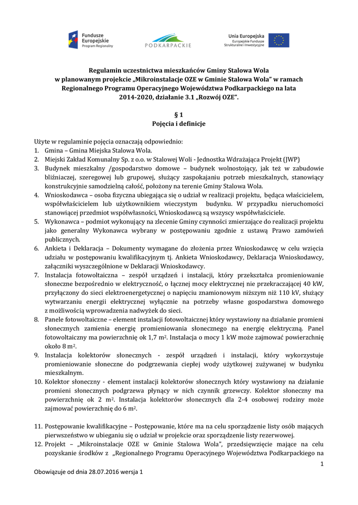 Regulamin uczestnictwa mieszkańców Gminy Stalowa Wola w planowanym projekcie „Mikroinstalacje OZE w Gminie Stalowa Wola” w ramach Regionalnego Programu Operacyjnego Województwa Podkarpackiego na lata 2014-2020, działanie 3.1 „Rozwój OZE”. §1 Pojęcia i definicje Użyte w regulaminie pojęcia oznaczają odpowiednio: 1. Gmina – Gmina Miejska Stalowa Wola. 2. Miejski Zakład Komunalny Sp. z o.o. w Stalowej Woli - Jednostka Wdrażająca Projekt (JWP) 3. Budynek mieszkalny /gospodarstwo domowe – budynek wolnostojący, jak też w zabudowie bliźniaczej, szeregowej lub grupowej, służący zaspokajaniu potrzeb mieszkalnych, stanowiący konstrukcyjnie samodzielną całość, położony na terenie Gminy Stalowa Wola. 4. Wnioskodawca – osoba fizyczna ubiegająca się o udział w realizacji projektu, będąca właścicielem, współwłaścicielem lub użytkownikiem wieczystym budynku. W przypadku nieruchomości stanowiącej przedmiot współwłasności, Wnioskodawcą są wszyscy współwłaściciele. 5. Wykonawca – podmiot wykonujący na zlecenie Gminy czynności zmierzające do realizacji projektu jako generalny Wykonawca wybrany w postępowaniu zgodnie z ustawą Prawo zamówień publicznych. 6. Ankieta i Deklaracja – Dokumenty wymagane do złożenia przez Wnioskodawcę w celu wzięcia udziału w postępowaniu kwalifikacyjnym tj. Ankieta Wnioskodawcy, Deklaracja Wnioskodawcy, załączniki wyszczególnione w Deklaracji Wnioskodawcy. 7. Instalacja fotowoltaiczna – zespół urządzeń i instalacji, który przekształca promieniowanie słoneczne bezpośrednio w elektryczność, o łącznej mocy elektrycznej nie przekraczającej 40 kW, przyłączony do sieci elektroenergetycznej o napięciu znamionowym niższym niż 110 kV, służący wytwarzaniu energii elektrycznej wyłącznie na potrzeby własne gospodarstwa domowego z możliwością wprowadzenia nadwyżek do sieci. 8. Panele fotowoltaiczne – element instalacji fotowoltaicznej który wystawiony na działanie promieni słonecznych zamienia energię promieniowania słonecznego na energię elektryczną. Panel fotowoltaiczny ma powierzchnię ok 1,7 m2. Instalacja o mocy 1 kW może zajmować powierzchnię około 8 m2. 9. Instalacja kolektorów słonecznych - zespół urządzeń i instalacji, który wykorzystuje promieniowanie słoneczne do podgrzewania ciepłej wody użytkowej zużywanej w budynku mieszkalnym. 10. Kolektor słoneczny - element instalacji kolektorów słonecznych który wystawiony na działanie promieni słonecznych podgrzewa płynący w nich czynnik grzewczy. Kolektor słoneczny ma powierzchnię ok 2 m2. Instalacja kolektorów słonecznych dla 2-4 osobowej rodziny może zajmować powierzchnię do 6 m2. 11. Postępowanie kwalifikacyjne – Postępowanie, które ma na celu sporządzenie listy osób mających pierwszeństwo w ubieganiu się o udział w projekcie oraz sporządzenie listy rezerwowej. 12. Projekt – „Mikroinstalacje OZE w Gminie Stalowa Wola”, przedsięwzięcie mające na celu pozyskanie środków z ,,Regionalnego Programu Operacyjnego Województwa Podkarpackiego na 1 Obowiązuje od dnia 28.07.2016 wersja 1 13. 14. 15. 16. 17. lata 2014-2020, działanie 3.1 „Rozwój OZE” co przełoży się na dofinansowanie instalacji fotowoltaicznych i instalacji kolektorów słonecznych zamontowanych na budynkach Wnioskodawców. Umowa – umowa pomiędzy Gminą i Wnioskodawcą, ustalająca szczegółowo obowiązki stron w zakresie przygotowania i realizacji projektu, w tym również warunki wykonania i eksploatacji instalacji fotowoltaicznej i Instalacji kolektorów słonecznych. Koszt kwalifikowany – koszt który zostanie pokryty do 85% z funduszu przewidzianego do realizacji projektu. Wnioskodawca pokrywa min. 15% tego kosztu. Koszt niekwalifikowany – koszt który nie zostanie pokryty z funduszu przewidzianego do realizacji projektu i w całości będzie poniesiony przez Wnioskodawcę. Ustawa OZE - Ustawa z dnia 20 lutego 2015 r. o odnawialnych źródłach energii. Regulamin – niniejszy regulamin. §2 Warunki udziału w postępowaniu kwalifikacyjnym 1. Nabór ankiet i deklaracji uczestnictwa w projekcie prowadzony jest przez Gminę Stalowa Wola/JWP w celu opracowania wniosku aplikacyjnego o dofinansowanie dostawy i montażu instalacji kolektorów słonecznych i instalacji fotowoltaicznych w ramach Osi Priorytetowej 3 Czysta energia, Działanie 3.1 „Rozwój OZE”, w ramach Regionalnego Programu Operacyjnego Województwa Podkarpackiego na lata 2014-2020 (RPO WP 2014-2020). 2. Ilość Wnioskodawców zakwalifikowanych do programu jest ograniczona, ze względu na wytyczne programowe i zapisy w Szczegółowym Opisie Osi Priorytetowych RPO WP 2014-2020. Ankiety i deklaracje będą podlegać ocenie i weryfikacji. Ze względu na ograniczenie co do wielkości aplikowanego projektu przez Gminę – maksymalna moc urządzeń w wysokości 2 MW oraz maksymalnej kwocie dofinansowania wynoszącej 10 000 000 zł, przy tworzeniu listy Wnioskodawców będzie decydować kolejność wpływu ankiet. 3. Projekt będzie realizowany przez Gminę Stalowa Wola jedynie w przypadku otrzymania dofinansowania z RPO WP 2014-2020 za pośrednictwem Miejskiego Zakładu Komunalnego Sp. z o.o. 4. Poziom dofinansowania może wynieść maksymalnie 85 % kosztów kwalifikowanych brutto. 5. Dopuszcza się złożenie tylko jednej deklaracji wraz z ankietą na jeden budynek mieszkalny, w której Wnioskodawca wybiera tylko jeden rodzaj instalacji – instalację kolektorów słonecznych lub instalację fotowoltaiczną. 6. Wnioskodawcy muszą być właścicielem/współwłaścicielem/użytkownikiem wieczystym budynku mieszkalnego, na której będzie realizowana instalacja i posiadać dokumenty potwierdzające własność (Księga wieczysta, akt notarialny, inny – kserokopia potwierdzona za zgodność z oryginałem). 7. W przypadku współwłasności nieruchomości wszyscy współwłaściciele muszą wyrazić zgodę na warunki zawarte w A