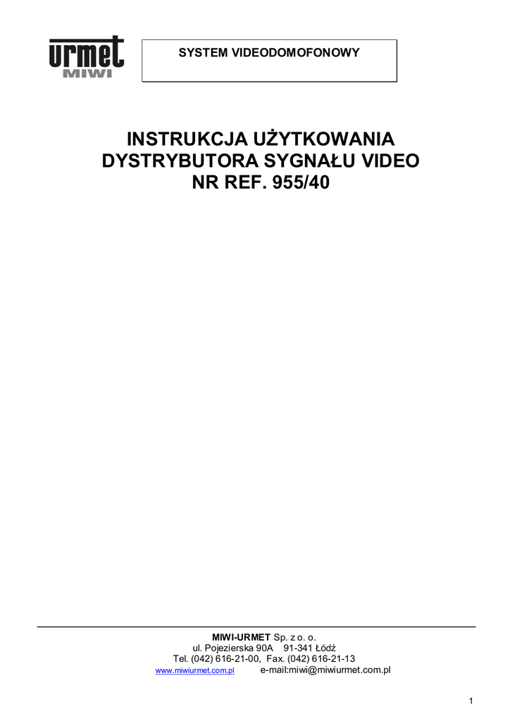 SYSTEM VIDEODOMOFONOWY INSTRUKCJA UŻYTKOWANIA DYSTRYBUTORA SYGNAŁU VIDEO NR REF. 955/40 MIWI-URMET Sp. z o. o. ul. Pojezierska 90A 91-341 Łódź Tel. (042) 616-21-00, Fax. (042) 616-21-13 www.miwiurmet.com.pl e-mail:[email protected] 1 DYSTRYBUTOR SYGNAŁU VIDEO VIDEO NR REF. 955/40 Dystrybutor sygnału video nr ref. 955/40 przeznaczony jest do stosowania w systemach bez przewodu koncentrycznego. Umożliwia on rozdzielenie sygnału wizyjnego w zależności od wymogów instalacji: • na kilka pionów, • na 4 videomonitory. Posiada on 4 wyjścia, 1 wejście i jedno wyjście bezpośrednie. OPIS ZACISKÓW POD PRZEWODY Wejście R1 zasilanie, R2 zasilanie, A sygnał video, B sygnał video, Wyjście R1 zasilanie, R2 zasilanie, A sygnał video, B sygnał video, Wyjścia: I, II, III, IV R1 zasilanie, R2 zasilanie, A sygnał video, B sygnał video. DANE TECHNICZNE Zasilanie 12 - 20 Vdc Wymiary (dł. x szer. 95 x 64 x 28 mm gł.) 2 MIWI-URMET Sp. z o.o. 91-341 Łódź ul. Pojezierska 90a tel. (42) 616-21-00 fax. (42) 616-21-13 WYPOSAŻENIE WEWNĘTRZNE NR REF. 955/40 ZASILACZE I PRZEKAŻNIKI DYSTRYBUTOR SYGNAŁU VIDEO NR REF. 955/40