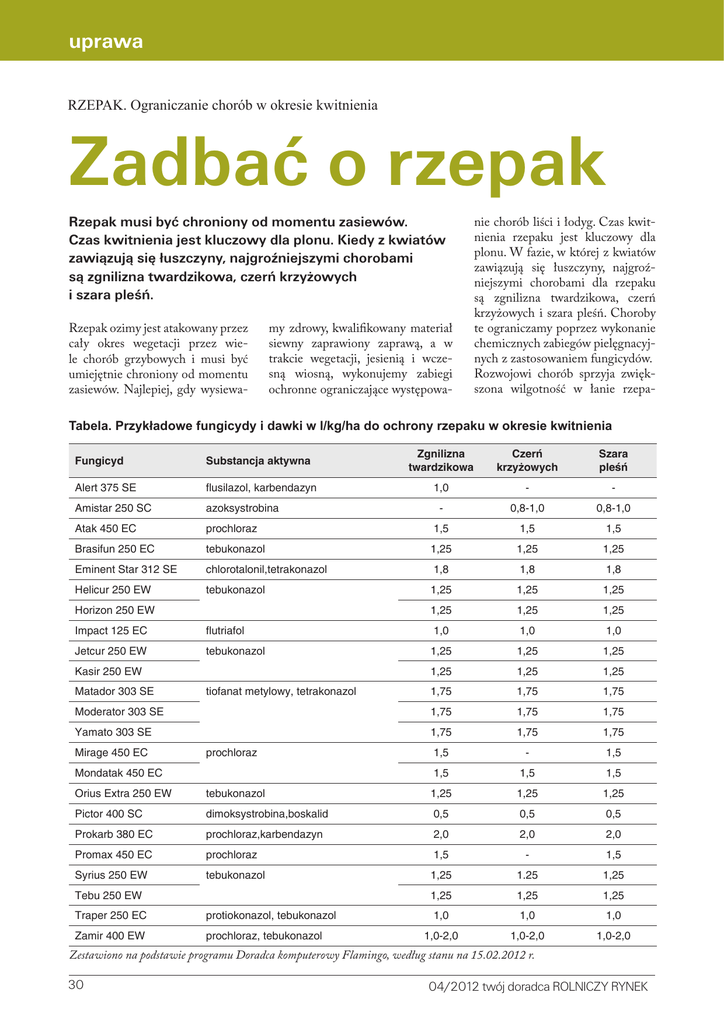 uprawa RZEPAK. Ograniczanie chorób w okresie kwitnienia Zadbać o rzepak Rzepak musi być chroniony od momentu zasiewów. Czas kwitnienia jest kluczowy dla plonu. Kiedy z kwiatów zawiązują się łuszczyny, najgroźniejszymi chorobami są zgnilizna twardzikowa, czerń krzyżowych i szara pleśń. Rzepak ozimy jest atakowany przez cały okres wegetacji przez wiele chorób grzybowych i musi być umiejętnie chroniony od momentu zasiewów. Najlepiej, gdy wysiewa- my zdrowy, kwalifikowany materiał siewny zaprawiony zaprawą, a w trakcie wegetacji, jesienią i wczesną wiosną, wykonujemy zabiegi ochronne ograniczające występowa- nie chorób liści i łodyg. Czas kwitnienia rzepaku jest kluczowy dla plonu. W fazie, w której z kwiatów zawiązują się łuszczyny, najgroźniejszymi chorobami dla rzepaku są zgnilizna twardzikowa, czerń krzyżowych i szara pleśń. Choroby te ograniczamy poprzez wykonanie chemicznych zabiegów pielęgnacyjnych z zastosowaniem fungicydów. Rozwojowi chorób sprzyja zwiększona wilgotność w łanie rzepa- 7DEHOD3U]\NáDGRZHIXQJLF\G\LGDZNLZONJKDGRRFKURQ\U]HSDNXZRNUHVLHNZLWQLHQLD Fungicyd Substancja aktywna Zgnilizna twardzikowa &]HUì NU]\ēRZ\FK Szara SOHþì Alert 375 SE ņXVLOD]RONDUEHQGD]\Q - - $PLVWDU6& D]RNV\VWURELQD - $WDN(& SURFKORUD] %UDVLIXQ(& WHEXNRQD]RO (PLQHQW6WDU6( FKORURWDORQLOWHWUDNRQD]RO +HOLFXU(: WHEXNRQD]RO +RUL]RQ(: ,PSDFW(& ņXWULDIRO -HWFXU(: WHEXNRQD]RO 0RGHUDWRU6( <DPDWR6( - .DVLU(: 0DWDGRU6( 0LUDJH(& WLRIDQDWPHW\ORZ\WHWUDNRQD]RO SURFKORUD] 0RQGDWDN(& 2ULXV([WUD(: WHEXNRQD]RO 3LFWRU6& GLPRNV\VWURELQDERVNDOLG 3URNDUE(& SURFKORUD]NDUEHQGD]\Q 3URPD[(& SURFKORUD] - 6\ULXV(: WHEXNRQD]RO 7HEX(: 7UDSHU(& SURWLRNRQD]ROWHEXNRQD]RO =DPLU(: SURFKORUD]WHEXNRQD]RO Zestawiono na podstawie programu Doradca komputerowy Flamingo, według stanu na 15.02.2012 r. 30 04/2012 twój doradca ROLNICZY RYNEK uprawa Uprawa po sobie sprzyja chorobom Korzystne ceny w skupie są powodem, dla którego rzepak jest coraz częściej wysiewany po sobie lub tylko z roczną przerwą w uprawie z rośliną przedplonową. Najczęściej jest to pszenica lub jęczmień. Taka sytuacja prowadzi do zwiększonego zagrożenia chorobami płodozmianowymi, z których w okresie kwitnienia najgroźniejsza jest zgnilizna twardzikowa. Przetrwalniki tej choroby (sklerocja) przedostają się do gleby z porażonych roślin podczas zbioru i mogą zachowywać zdolność do kiełkowania i infekcji roślin przez 7-10 lat. Im dłuższa przerwa w uprawie rzepaku, tym mniejsza szkodliwość ze strony tej choroby. Zarodniki z wiatrem Z kiełkujących przetrwalników uwalniają się zarodniki, które z przenoszą się z wiatrem na rozgałęzione łodyg i liście u ich nasady. Przypada to na okres kwitnienia rzepaku, kiedy opadające płatki kwiatowe i pyłek również się tam osadzają i stanowią doskonałą pożywkę dla kiełkujących zarodników. Ten typ infekcji przez zarodniki poraża wyższe odcinki i rozgałęzienia łodyg lub kątów liści, ale może też dojść do infekcji roślin na wskutek rozrostu grzybni z przetrwalników leżących na ziemi ‒ wtedy objawy chorobowe pojawiają się u podstawy łodygi. Rozrost choroby jest początkowo niewidoczny, pojawiają się białoszare plamy z białą puszystą grzybnią, a wewnątrz porażonych łodyg można zaobserwować czarne sklerocja (przetrwalniki). Grzyb niszczy wiązki przewodzące i dochodzi do zahamowania transportu substancji pokarmowych oraz wody do górnych partii łodyg z łuszczynami. Powoduje to zakłócenia, a nawet zahamowanie procesu formowania i dojrzewania nasion w łuszczynach. Większe nasilenie choroby występuje przy intensyw- nych opadach. W razie wystąpienia suszy, przebieg choroby jest ograniczony. go pod koniec okresu kwitnienia, na początku formowania się łuszczyn i nasion. Zabiegi w pełni kwitnienia Pękanie łuszczyn Podczas zbioru przetrwalniki znowu dostają się do gleby. Zagrożenie chorobą wzrasta, jeżeli rzepak jest zbyt często siany na tym samym polu. Z badań Instytutu Ochrony Roślin-PIB, w Poznaniu wynika, że największą skuteczność fungicydów do ograniczania zgnilizny twardzikowej osiągamy, kiedy wykonujemy zabieg w fazie opadania pierwszych płatków kwiatowych ‒ pełni kwitnienia. Zabiegi wykonane w terminach wcześniejszych ‒ w fazie zielonego czy żółtego pąka, dawały gorsze efekty ochronne. Zabiegi ochronne wykonane w pełni kwitnienia chronią także łuszczyny przed chorobami powodującymi czerń krzyżowych i szarą pleśń. Przykładowe fungicydy do ograniczania chorób w tym okresie zostały wymienione w tabeli. W przypadku małego zagrożenia ze strony zgnilizny twardzikowej, a większego ze strony chorób łuszczyn, możemy zabieg fungicydowy opóźnić o kilkanaście dni i wykonać Choroby atakujące łuszczyny są szczególnie niebezpieczne, bowiem podczas ich rozwoju dochodzi do ubytku ilościowego plonu wskutek pękania łuszczyn i osypywania się nasion, ale też często do wniknięcia choroby w głąb łuszczyny i nasion oraz pogorszenia jego parametrów jakościowych. Jeżeli w długim okresie uprawy rzepaku stosujemy fungicydy dwu- lub trzykrotnie, ważne jest abyśmy używali środków z różnych grup chemicznych ‒ triazoli, benzymidazoli, strobiluryn i imidazoli. Przemienne stosowanie fungicydów z różnych grup chemicznych oraz różnych substancji aktywnych jest dobrą strategią przeciwdziałania wytworzeniu się odporności grzybów i zapobiega obniżeniu skuteczności zabiegów. źródła: Nowoczesne Rolnictwo, Doradca Komputerowy Flamingo, Agroserwis. Marian Karasek DODR we Wrocławiu fot. Agnieszka Siegel ku, który w okresie kwitnienia jest już wysoki i nawet, jeśli nie padają deszcze, do porażenia wystarczy nocna lub poranna rosa. Zabiegi wykonywane w fazie zielonego czy żółtego pąka dają gorsze efekty ochronne 04/2012 twój doradca ROLNICZY RYNEK 31