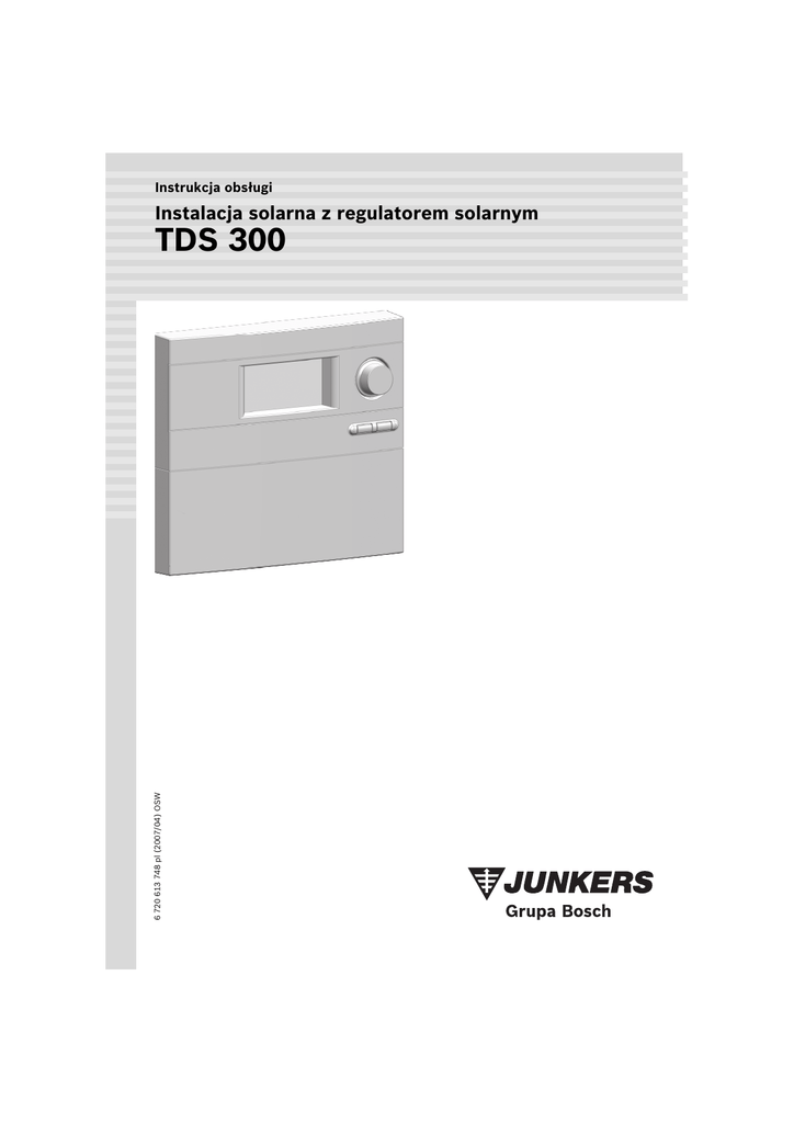 Instrukcja obsługi Instalacja solarna z regulatorem solarnym 6 720 613 748 pl (2007/04) OSW TDS 300 Spis treści Spis treści 1 1.2 Wskazówki dotyczące bezpieczeństwa i objaśnienie symboli Ogólne wskazówki dotyczące bezpieczeństwa Objaśnienie symboli 3 3 2 2.1 2.2 Dane produktu Deklaracja zgodności WE Opis produktu 4 4 4 3 3.1 3.2 3.3 Obsługa 6 Elementy stacji solarnej 7 Elementy obsługowe regulatora 8 Poziom wskazań - wyświetlenie parametrów instalacji 9 Menu główne 11 1.1 3.4 4 4.1 3 Usterki Usterki ze wskazaniem na wyświetlaczu Usterki bez wskazania na wyświetlaczu 12 16 5.5 Wskazówki dla użytkownika Dlaczego regularna konserwacja jest ważna? Ważne wskazówki odnośnie płynu solarnego Kontrola instalacji solarnej Kontrola i ponowne ustawienie ciśnienia roboczego. Czyszczenie kolektorów 17 17 6 Protokół dla użytkownika 18 4.2 5 5.1 5.2 5.3 5.4 2 12 14 16 16 16 6 720 613 748 (2007/04) Wskazówki dotyczące bezpieczeństwa i objaśnienie symboli 1 Wskazówki dotyczące bezpieczeństwa i objaśnienie symboli 1.1 Ogólne wskazówki dotyczące bezpieczeństwa Informacje wstępne Niniejsza instrukcja zawiera ważne informacje dotyczące bezpiecznej i prawidłowej obsługi instalacji solarnej. B Pobrać całość dokumentacji technicznej termicznej instalacji solarnej od fachowej firmy instalacyjnej. Utylizacja B Opakowanie utylizować zgodnie z wymaganiami ochrony środowiska. B W razie wymiany części: starą część utylizować zgodnie z wymaganiami ochrony środowiska. 1.2 Wskazówki dotyczące bezpieczeństwa będą oznaczone w tekście trójkątem ostrzegawczym. B Należy starannie przeczytać instrukcję i właściwie ją przechowywać. B Należy przestrzegać wskazówek bezpieczeństwa, aby uniknąć poszkodowania osób i szkód materialnych. Zastosowanie zgodne z przeznaczeniem Regulator solarny (dalej zwany regulatorem) może być stosowany jedynie w solarnych instalacjach cieplnych przy spełnionych wymaganiach warunków otoczenia (0 - 50 °C). Regulator nie może być montowany na wolnym powietrzu, w pomieszczeniach zawilgoconych lub w takich, w których mogą powstać palne mieszaniny gazowe. B Instalację solarną należy użytkować tylko zgodnie z jej przeznaczeniem oraz w stanie sprawności technicznej. Temperatura c.w.u. Jeżeli maksymalna temperatura podgrzewacza ustawiona jest na ponad 60 °C, w miejscach poboru wody istnieje niebezpieczeństwo oparzenia się. Objaśnienie symboli Słowa wytłuszczone oznaczają możliwe niebezpieczeństwo, jeśli nie będzie się przestrzegało odpowiednich zaleceń. • Uwaga oznacza, że mogą nastąpić lekkie uszkodzenia przedmiotów. • Ostrzeżenie oznacza, że może dojść do lekkiego uszkodzenia ciała lub cięższych uszkodzeń przedmiotów. • Niebezpieczeństwo oznacza, że może dojść do uszkodzenia ciała. W szczególnych przypadkach zagrożone może być życie. Wskazówki w tekście będą oznaczone znajdującym się obok symbolem. Wskazówki zawierają ważne informacje w przypadkach, gdy nie istnieje niebezpieczeństwo dla ludzi i sprzętu. B Zapytać instalatora o ustawioną maksymalną temperaturę c.w.u. B Odkręcać tylko wodę zmieszaną. 6 720 613 748 (2007/04) 3 Dane produktu 2 Dane produktu 2.1 Deklaracja zgodności WE Konstrukcja oraz sposób pracy opisanego tu produktu spełniają wymagania określone w odnośnych dyrektywach europejskich, a także ew. dodatkowe wymagania obowiązujące w danym kraju. Zgodność ta została potwierdzona. 2.2 Opis produktu Schemat instalacji solarnej 4 1 3 2 7747006071.01-1.SD Rys. 1 1 2 3 4 4 Schemat instalacji Pole kolektorów Stacja solarna Podgrzewacz solarny Regulator TDS 300 6 720 613 748 (2007/04) Dane produktu Główne elementy składowe instalacji solarnej Pole kolektorów • składa się z kolektorów płaskich lub próżniowych. Stacja solarna • składa się z pompy oraz armatury bezpieczeństwa i odcinającej dla obiegu solarnego Podgrzewacz solarny • służy do magazynowania pozyskanej energii słonecznej • Rozróżnia się: – podgrzewacze wody użytkowej – podgrzewacze buforowe (do wspomagania ogrzewania) – podgrzewacze dwufunkcyjne (do wspomagania ogrzewania i wody użytkowej) Regulator TDS 300 • wraz z dwoma czujnikami temperatury Tab. 1 Zasada działania Regulator Jeżeli ustawiona różnica temperatur pomiędzy polem kolektorów (Æ rysunek 1, poz. 1) i podgrzewaczem solarnym (Æ rys. 1, poz. 3) zostanie przekroczona, załącza się pompa w stacji solarnej. Regulator jest dobrany do sterowania instalacją solarną. Może być zamontowany na ścianie lub zintegrowany w stacji solarnej. Pompa transportuje medium solarne (płyn solarny) w obiegu przez pole kolektorów do odbiornika. Z reguły jest to podgrzewacz solarny. W podgrzewaczu solarnym jest wymiennik ciepła, który ciepło pozyskane z medium solarnego przenosi na wodę użytkową wzgl. na wodę w obiegu grzewczym. Wyświetlacz (Æ rys. 2) regulatora po ostatnim naciśnięciu przycisku/pokrętła jest przez 5 minut podświetlony na zielono/żółto (aktywacja np. przez naciśnięcie pokrętła ok ). Wyświetlacz wskazuje: • Status pompy i zaworów (jako prosty, niemontażowy schemat instalacji) • Parametry instalacji (np. temperatury) • Wybrane funkcje • Komunikaty usterek 1 5 Rys. 2 6 720 613 748 (2007/04) Możliwe wskazania wyświetlacza 5 Obsługa 3 Obsługa Instalacja solarna ustawiana jest podczas uruchomienia przez instalatora i pracuje w pełni automatycznie. B Instalator powinien objaśnić użytkownikowi sposób działania i obsługi urządzenia. B Nie wyłączać instalacji solarnej również podczas dłuższej nieobecności (np. w czasie urlopu). Jeżeli instalacja została wykonana zgodnie z zaleceniami producenta, jest ona w pełni bezpieczna. B Po zaniku napięcia lub dłuższej nieobecności sprawdzić ciśnienie robocze na manometrze instalacji solarnej (Æ roz. 5.4, strona 17). Ostrzeżenie: Uszkodzenia instalacji przez zmianę us