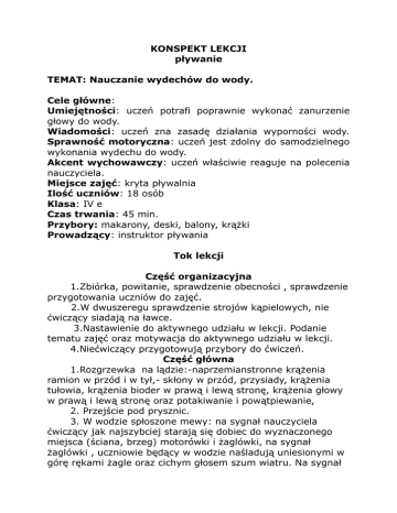 KONSPEKT LEKCJI pływanie TEMAT: Nauczanie wydechów do wody. Cele główne: Umiejętności: uczeń potrafi poprawnie wykonać zanurzenie głowy do wody. Wiadomości: uczeń zna zasadę działania wyporności wody. Sprawność motoryczna: uczeń jest zdolny do samodzielnego wykonania wydechu do wody. Akcent wychowawczy: uczeń właściwie reaguje na polecenia nauczyciela. Miejsce zajęć: kryta pływalnia Ilość uczniów: 18 osób Klasa: IV e Czas trwania: 45 min. Przybory: makarony, deski, balony, krążki Prowadzący: instruktor pływania Tok lekcji Część organizacyjna 1.Zbiórka, powitanie, sprawdzenie obecności , sprawdzenie przygotowania uczniów do zajęć. 2.W dwuszeregu sprawdzenie strojów kąpielowych, nie ćwiczący siadają na ławce. 3.Nastawienie do aktywnego udziału w lekcji. Podanie tematu zajęć oraz motywacja do aktywnego udziału w lekcji. 4.Niećwiczący przygotowują przybory do ćwiczeń. Część główna 1.Rozgrzewka na lądzie:-naprzemianstronne krążenia ramion w przód i w tył,- skłony w przód, przysiady, krążenia tułowia, krążenia bioder w prawą i lewą stronę, krążenia głowy w prawą i lewą stronę oraz potakiwanie i powątpiewanie, 2. Przejście pod prysznic. 3. W wodzie spłoszone mewy: na sygnał nauczyciela ćwiczący jak najszybciej starają się dobiec do wyznaczonego miejsca (ściana, brzeg) motorówki i żaglówki, na sygnał żaglówki , uczniowie będący w wodzie naśladują uniesionymi w górę rękami żagle oraz cichym głosem szum wiatru. Na sygnał motorówki biegają naśladując głosem warkot motoru, a rękoma trzymanie kierownicy z balonikiem. Dzieci trzymają baloniki. Na sygnał prowadzącego podrzucają baloniki i dmuchają tak aby baloniki nie spadły do wody. Rozpoczęcie i zakończenie każdego ćwiczenia na znak prowadzącego, zwracanie uwagi na poprawność wykonywania ćwiczeń, głębokość do poziomu pasa, nauczyciel zwraca uwagę na bezpieczeństwo. 4.Nauczanie wydechu do wody- „sprężynki” na sygnał prowadzącego dzieci jak najszybciej skaczą obunóż do połowy basenu, deski pływają po wodzie. Dzieci nurkują pod wyznaczone przez siebie deski i starają się podrzucić je jak najwyżej. Wydmuchiwanie powietrza do wody po zanurzeniu głowy. 5.Uczniowie wykonują przysiad, po czym wyskakują do góry wykonując głęboki wdech, a następnie wracają do pełnego zanurzenia w przysiadzie, tam głośno wypuszczają powietrze. 6.Uczniowie starają się wyłowić wrzucone przez nauczyciela przedmioty. Wygrywa ten, który wyłowi najwięcej przedmiotów, pereł. 7.Tor przeszkód: trzech ćwiczących trzymają deski na wodzie stojąc w odstępach 2m. Pozostali pokonują tor pod deseczką i wdech wynurzając się między deseczkami. Wygrywa ten rząd, który pierwszy pokona tor poprawnie. 8.Dzieci biegają w wodzie, na sygnał prowadzącego wykonują wdech, zanurzają się wyciągając ręce nad wodę, klaszczą. W trakcie klaskania wykonują długi wydech. 9. Uczniowie odliczają do dwóch, koło obraca się w lewo lub w prawo. Na sygnał prowadzącego jedynki kładą się na wodzie na plecach, z nogami skierowanymi do środka koła, a dwójki obracają koło. Na .gwizdek prowadzącego następuje zmiana. 10. Wydechy do wody w połączeniu z naprzemianstronnymi ruchami nóg trzymając się ściany basenu. 11. Uczniowie skaczą kolejno do wody na nogi. W czasie lotu klaszczą. Wygrywa uczeń, który wykona najwięcej klaśnięć. Objaśnienia prowadzącego są krótkie i zrozumiałe. Grupa ustawiona jest w rzędzie, rozsypce, kole. 12. Uspokojenie organizmu, 10 wydechów do wody 13. Uczniowie starają się usiąść na dnie basenu i oburącz dotknąć prawej stopy, naśladując nakładanie skarpetki. Na sygnał zmieniają stopę. Część końcowa 1.Zbiórka, omówienie lekcji, zwrócenie uwagi na popełniane błędy, pochwalenie osób najlepiej wykonujących ćwiczenia 2 . Na brzegu basenu, nie ćwiczący zbierają sprzęt i odnoszą na wskazane miejsce. 3. Zachęcanie uczniów do korzystania z rodzicami z pływalni w czasie wolnym 4. Podanie kilku ćwiczeń do wykonania w domu. 5. Pożegnanie. 6. Rozejście się do szatni. Konspekt opracowała Karolina Jarkowska