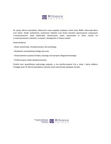 W naszej ofercie posiadamy fabrycznie nowe pojazdy osobowe marki Audi, BMW, Mercedes-Benz oraz Volvo. Dzięki unikalnemu systemowi rabatów oraz braku kosztów operacyjnych związanych z utrzymywaniem stacji dealerskiej dostarczamy nowe samochody w cenie niższej niż w autoryzowanych salonach, na każdy z dostępnych w Polsce modeli. Gwarantujemy: - Nowe samochody, nierejestrowane, bez przebiegu - Możliwość samodzielnej konfiguracji auta - Finansowanie w postaci kredytu, leasingu lub wynajmu długoterminowego - Preferencyjne stawki ubezpieczeniowe Prześlij nam specyfikację wybranego pojazdu, a my poinformujemy Cię o cenie i dacie odbioru Twojego auta. W ofercie posiadamy również nowe samochody dostępne od ręki.