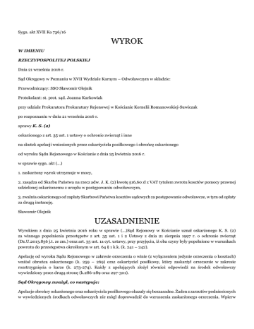 Sygn. akt XVII Ka 736/16 WYROK W IMIENIU RZECZYPOSPOLITEJ POLSKIEJ Dnia 21 września 2016 r. Sąd Okręgowy w Poznaniu w XVII Wydziale Karnym – Odwoławczym w składzie: Przewodniczący: SSO Sławomir Olejnik Protokolant: st. prot. sąd. Joanna Kurkowiak przy udziale Prokuratora Prokuratury Rejonowej w Kościanie Kornelii Romanowskiej-Suwiczak po rozpoznaniu w dniu 21 września 2016 r. sprawy K. S. (2) oskarżonego z art. 35 ust. 1 ustawy o ochronie zwierząt i inne na skutek apelacji wniesionych przez oskarżyciela posiłkowego i obrońcę oskarżonego od wyroku Sądu Rejonowego w Kościanie z dnia 25 kwietnia 2016 r. w sprawie sygn. akt (...) 1. zaskarżony wyrok utrzymuje w mocy, 2. zasądza od Skarbu Państwa na rzecz adw. J. K. (2) kwotę 516,60 zł z VAT tytułem zwrotu kosztów pomocy prawnej udzielonej oskarżonemu z urzędu w postępowaniu odwoławczym, 3. zwalnia oskarżonego od zapłaty Skarbowi Państwa kosztów sądowych za postępowanie odwoławcze, w tym od opłaty za drugą instancję. Sławomir Olejnik UZASADNIENIE Wyrokiem z dnia 25 kwietnia 2016 roku w sprawie (...)Sąd Rejonowy w Kościanie uznał oskarżonego K. S. (2) za winnego popełnienia przestępstw z art. 35 ust. 1 i 2 Ustawy z dnia 21 sierpnia 1997 r. o ochronie zwierząt (Dz.U.2013.856 j.t. ze zm.) oraz art. 35 ust. 1a cyt. ustawy, przy przyjęciu, iż oba czyny były popełnione w warunkach powrotu do przestępstwa określonym w art. 64 § 1 k.k. (k. 241 – 242). Apelację od wyroku Sądu Rejonowego w zakresie orzeczenia o winie (z wyłączeniem jedynie orzeczenia o kosztach) wniósł obrońca oskarżonego (k. 259 – 269) oraz oskarżyciel posiłkowy, który zaskarżył orzeczenie w zakresie rozstrzygnięcia o karze (k. 273-274). Każdy z apelujących złożył również odpowiedź na środek odwoławczy wywiedziony przez drugą stronę (k.286-289 oraz 297-301). Sąd Okręgowy zważył, co następuje: Apelacje obrońcy oskarżonego oraz oskarżyciela posiłkowego okazały się bezzasadne. Żaden z zarzutów podniesionych w wywiedzionych środkach odwoławczych nie mógł doprowadzić do wzruszenia zaskarżonego orzeczenia. Wpierw Sąd Okręgowy przystąpi do omówienia apelacji obrońcy oskarżonego, a następnie w części uzasadnienia odnoszącej się do zarzutu rażącej niewspółmierności kary omówione zostaną oba środki odwoławcze łącznie. Odnosząc się do zarzutów zawartych w apelacji obrońcy oskarżonego, warto na wstępie zwrócić uwagę, iż błąd w ustaleniach faktycznych może wynikać z niepełności materiału dowodowego (błąd „braku”) lub z przekroczenia granic swobodnej oceny dowodów (błąd „dowolności”). W orzecznictwie Sądu Najwyższego wypracowano wymogi, którym musi podlegać ocena dowodów, aby nie przekształciła się w dowolną. Tak więc, przekonanie sądu o wiarygodności jednych dowodów i niewiarygodności innych pozostaje pod ochroną przepisu art. 7 k.p.k. tylko wtedy, gdy: - jest poprzedzone ujawnieniem w toku rozprawy głównej całokształtu okoliczności sprawy (art. 410 k.p.k.) i to w sposób podyktowany obowiązkiem dochodzenia prawdy (art. 2 § 2 k.p.k.); - stanowi wyraz rozważenia wszystkich okoliczności przemawiających zarówno na korzyść, jak i na niekorzyść oskarżonego (art. 4 k.p.k.); - jest wyczerpujące i logicznie - z uwzględnieniem wskazań wiedzy oraz doświadczenia życiowego - uargumentowane w uzasadnieniu wyroku (art. 424 § 1 pkt 1 k.p.k.). W ocenie Sądu Okręgowego, wyrok Sądu Rejonowego jest wolny od wskazanych wyżej błędów. Apelacja obrońcy ma w gruncie rzeczy polemiczny charakter z prawidłowymi ustaleniami faktycznymi Sądu Rejonowego. Błędne jest przede wszystkim założenie, że w przypadku gdy oskarżony początkowo przyznaje się do popełnienia zarzuconego mu czynu, a następnie wycofuje się ze swojego oświadczenia, to jego pierwsze wyjaśnienia należy traktować jako niebyłe. W obowiązującym Kodeksie postępowania karnego brak jest regulacji, która pozwalałaby na przyjęcie, że stanowisko skarżącego jest zasadne – a wręcz przeciwnie – wszystkie wyjaśnienia składane przez oskarżonego podlegają ocenie przez pryzmat art. 7 k.p.k. Świadkowie zdarzenia widzieli, jak oskarżony wynosił pakunek, w którym jak się okazało znajdowały się zwłoki psa i żywe szczenięta, a następnie pozostawia je w pobliskim lesie. W tym kontekście dalsze wyjaśnienia podsądnego jakoby miał tyko uderzyć psa, a jego zgon miał nastąpić w wyniku potrącenia go przez samochód brzmią po prostu naiwnie. Tej ostatniej wersji zdarzenia przeczą zeznania świadków. Nie jest bowiem zrozumiałe, dlaczego podsądny miałby wynosić po kryjomu pakunek ze zwierzętami do lasu zamiast powiadomić właściciela o ich losie. Jeżeli nie poczuwałby się do winy, to z pewnością powiadomiłby sąsiadów, że znalazł ich psa. Podkreślić również należało, że poglądy świadka – właścicielki psa - B. Ś. co do zasadności zgłaszania sprawy organom ścigania pozostają bez znaczenia dla odpowiedzialności oskarżonego, albowiem przypisane oskarżonemu czyny są ścigane z urzędu. Przechodząc do omówienia kolejnego zarzutu apelującego wskazać winno się, iż z opinii weterynarza wynika, że nie jest wykluczone, że śmierć psa nastąpiła w wyniku nawet jednokrotnego uderzenia drewnianym kołkiem, o ile uderzenie to było wystarczająco silne i precyzyjne. Najprawdopodobniej zgon nastąpił w wyniku zadania kilku uderzeń. Z wyjaśnień oskarżonego wynika, że zaatakował psa około trzech razy (k. 27). Uszkodzenia znalezione na ciele zwierzęcia nie mogły powstać przypadkowo, gdyż charakter ich powstania wskazuje na mechanizm czynny (k. 238). Zatem ustalenia Sądu w zakresie sprawstwa oskarżonego korelują z wnioskami przedstawionymi przez świadka R. P. i w żadnym wypadku nie można mówić tutaj o sprzeczności. Sąd Okręgowy nie dostrzega również podnoszonych przez skarżącego 