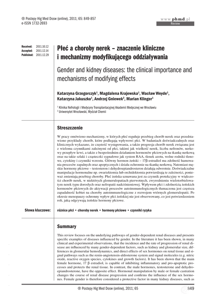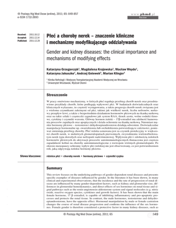 ® Postepy Hig Med Dosw (online), 2011; 65: 849-857 e-ISSN 1732-2693 Received: 2011.10.12 Accepted: 2011.12.14 Published: 2011.12.29 www.phmd.pl Review Płeć a choroby nerek – znaczenie kliniczne i mechanizmy modyfikującego oddziaływania Gender and kidney diseases: the clinical importance and mechanisms of modifying effects Katarzyna Grzegorczyk1, Magdalena Krajewska1, Wacław Weyde1, Katarzyna Jakuszko1, Andrzej Gniewek2, Marian Klinger1 1 2 Klinika Nefrologii i Medycyny Transplantacyjnej Akademii Medycznej we Wrocławiu Uniwersytet Wrocławski, Wydział Chemii Streszczenie W pracy omówiono mechanizmy, w których płeć reguluje przebieg chorób nerek oraz przedstawiono przykłady chorób, które podlegają wpływowi płci. W badaniach doświadczalnych oraz klinicznych wykazano, że częstość występowania, a także progresja chorób nerek związana jest z wieloma czynnikami zależnymi od płci, takimi jak wielkość nerek, liczba nefronów, nerkowy przepływ krwi, a także z bezpośrednim działaniem hormonów płciowych na tkankę nerkową oraz na takie szlaki i cząsteczki sygnałowe jak system RAA, tlenek azotu, wolne rodniki tlenowe, cytokiny i czynniki wzrostu. Główny hormon żeński – 17b-estradiol ma zdolność hamowania procesów zapalnych oraz apoptycznych i działa ochronnie na tkankę nerkową. Natomiast męskie hormony płciowe – testosteron i dehydroepiandrosteron działają odwrotnie. Doświadczalne manipulacje hormonalne np. owariektomia lub orchidektomia potwierdzają te zależności, ponieważ zmieniają przebieg choroby. Płeć żeńska uznawana jest za czynnik protekcyjny w większości chorób nerek, w niektórych glomerulopatiach pierwotnych, zwyrodnieniu wielotorbielowatym nerek typu dorosłych oraz nefropatii nadciśnieniowej. Wpływem płci i zdolnością żeńskich hormonów płciowych do aktywacji procesów autoimmunologicznych tłumaczona jest częstsza zapadalność kobiet na choroby autoimmunologiczne z rozwojem wtórnych glomerulopatii. Po okresie menopauzy ochronny wpływ płci żeńskiej nie jest obserwowany, co jest potwierdzeniem roli, jaką odgrywają żeńskie hormony płciowe. Słowa kluczowe: różnice płci • choroby nerek • hormony płciowe • czynniki ryzyka Summary This review focuses on the underlying pathways of gender-dependent renal diseases and presents specific examples of diseases influenced by gender. In the literature it has been shown, in many clinical and experimental observations, that the incidence and the rate of progression of renal disease are influenced by many gender-dependent factors, such as kidney and glomerular size, differences in glomerular hemodynamics, and direct effects of sex hormones on renal tissue and signal pathways such as the renin-angiotensin-aldosterone system and signal molecules (e.g. nitric oxide, reactive oxygen species, cytokines and growth factors). It has been shown that the main female hormone, 17 b estradiol, is capable of inhibiting inflammatory and pro‑apoptotic processes and protects the renal tissue. In contrast, the male hormones, testosterone and dehydroepiandrosterone, have the opposite effect. Hormonal manipulation by male or female castration changes the course of renal disease progression and confirms the influence of the sex hormones. Female gender is therefore considered a protective factor in many kidney diseases, such as - - - - - ® Postepy Hig Med Dosw (online), 2011; 65 849 Postepy Hig Med Dosw (online), 2011; tom 65: 849-857 primary glomerulonephritis, autosomal dominant polycystic kidney disease (ADPKD) and hypertensive nephropathy. Similarly, women are more predisposed to autoimmune diseases with secondary glomerulonephritis, e.g. systemic lupus erythematosus, as the female sex hormones have the ability of autoimmune process activation. After menopause the protective effect of female gender is not observed, which confirms the role of the female sex hormones. Key words: Full-text PDF:http://www.phmd.pl/fulltxt.php?ICID=972446 Word count:3778 Tables:— Figures:— References:79 Adres autorki: Katarzyna Grzegorczyk, Katedra i Klinika Nefrologii i Medycyny Transplantacyjnej AM, ul. Borowska 213, 50-556 Wrocław; e-mail: [email protected] Wykaz skrótów:ADPKD – zwyrodnienie wielotorbielowate nerek dorosłych dziedziczone autosomalnie dominująco - (autosomal dominant polycystic kidney disease); anty-dsDNA – przeciwciała przeciw dwuniciowemu DNA (anty double-stranded DNA antibodies); BMI – współczynnik masy ciała (body mass index); DHEA – dehydroepiandrosteron (dehydroepiandrosterone); DHT – dihydrotestosteron (dihydrotestosterone); eGFR – szacunkowy wskaźnik filtracji kłębuszkowej (estimated glomerular filtration rate); eNOS – śródbłonkowa syntaza tlenku azotu (endothelial nitric oxide synthase); ERK – kinazy aktywowane przez sygnały zewnątrzkomórkowe (extracellular signal-regulated kinases); aERKO – myszy z usuniętym genem dla receptora alfa estrogenu (mice transgenic for an estrogen alfa gene deletion); ERPF – efektywny przepływ osocza (effective renal plasma flow); FF – frakcja filtracyjna osocza (filtration fraction); FSGS – ogniskowe stwardnienie kłębuszków nerkowych (focal segmental glomerulosclerosis); HMG-box – grupa białek odpowiedzialnych za interakcję z DNA (high mobility group box); HTZ – hormonalna terapia zastępcza; IL-12 – interleukina 12; IL-1b – interleukina 1 beta; JNK – kinazy aktywowane czynnikiem stresowym (c-Jun N-terminal kinases); KZN – kłębuszkowe zapalenie nerek; LH – hormon luteinizujący (luteinizing hormone); MAP – średnie ciśnienie tętnicze krwi (mean arterial pressure); MAPK – kinazy białkowe zależne od mitogenów (mitogen-activated protein kinases); MAPK p38 – kinazy białkowe p38 aktywowane przez mitogeny (P38 mitogen-activated protein kinase); MGN – błoniaste kłębuszkowe zapalenie nerek (membranous glomerulonephritis); MMPs – metaloproteinazy macierzy 