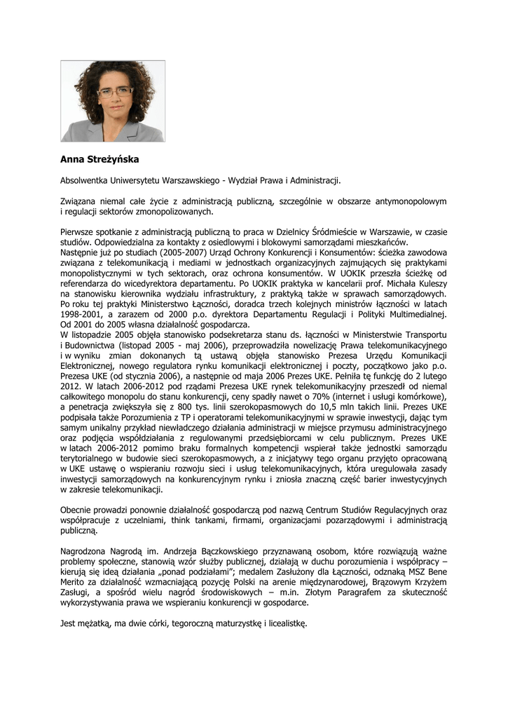 Anna Streżyńska Absolwentka Uniwersytetu Warszawskiego - Wydział Prawa i Administracji. Związana niemal całe życie z administracją publiczną, szczególnie w obszarze antymonopolowym i regulacji sektorów zmonopolizowanych. Pierwsze spotkanie z administracją publiczną to praca w Dzielnicy Śródmieście w Warszawie, w czasie studiów. Odpowiedzialna za kontakty z osiedlowymi i blokowymi samorządami mieszkańców. Następnie już po studiach (2005-2007) Urząd Ochrony Konkurencji i Konsumentów: ścieżka zawodowa związana z telekomunikacją i mediami w jednostkach organizacyjnych zajmujących się praktykami monopolistycznymi w tych sektorach, oraz ochrona konsumentów. W UOKIK przeszła ścieżkę od referendarza do wicedyrektora departamentu. Po UOKIK praktyka w kancelarii prof. Michała Kuleszy na stanowisku kierownika wydziału infrastruktury, z praktyką także w sprawach samorządowych. Po roku tej praktyki Ministerstwo Łączności, doradca trzech kolejnych ministrów łączności w latach 1998-2001, a zarazem od 2000 p.o. dyrektora Departamentu Regulacji i Polityki Multimedialnej. Od 2001 do 2005 własna działalność gospodarcza. W listopadzie 2005 objęła stanowisko podsekretarza stanu ds. łączności w Ministerstwie Transportu i Budownictwa (listopad 2005 - maj 2006), przeprowadziła nowelizację Prawa telekomunikacyjnego i w wyniku zmian dokonanych tą ustawą objęła stanowisko Prezesa Urzędu Komunikacji Elektronicznej, nowego regulatora rynku komunikacji elektronicznej i poczty, początkowo jako p.o. Prezesa UKE (od stycznia 2006), a następnie od maja 2006 Prezes UKE. Pełniła tę funkcję do 2 lutego 2012. W latach 2006-2012 pod rządami Prezesa UKE rynek telekomunikacyjny przeszedł od niemal całkowitego monopolu do stanu konkurencji, ceny spadły nawet o 70% (internet i usługi komórkowe), a penetracja zwiększyła się z 800 tys. linii szerokopasmowych do 10,5 mln takich linii. Prezes UKE podpisała także Porozumienia z TP i operatorami telekomunikacyjnymi w sprawie inwestycji, dając tym samym unikalny przykład niewładczego działania administracji w miejsce przymusu administracyjnego oraz podjęcia współdziałania z regulowanymi przedsiębiorcami w celu publicznym. Prezes UKE w latach 2006-2012 pomimo braku formalnych kompetencji wspierał także jednostki samorządu terytorialnego w budowie sieci szerokopasmowych, a z inicjatywy tego organu przyjęto opracowaną w UKE ustawę o wspieraniu rozwoju sieci i usług telekomunikacyjnych, która uregulowała zasady inwestycji samorządowych na konkurencyjnym rynku i zniosła znaczną część barier inwestycyjnych w zakresie telekomunikacji. Obecnie prowadzi ponownie działalność gospodarczą pod nazwą Centrum Studiów Regulacyjnych oraz współpracuje z uczelniami, think tankami, firmami, organizacjami pozarządowymi i administracją publiczną. Nagrodzona Nagrodą im. Andrzeja Bączkowskiego przyznawaną osobom, które rozwiązują ważne problemy społeczne, stanowią wzór służby publicznej, działają w duchu porozumienia i współpracy – kierują się ideą działania „ponad podziałami”; medalem Zasłużony dla Łączności, odznaką MSZ Bene Merito za działalność wzmacniającą pozycję Polski na arenie międzynarodowej, Brązowym Krzyżem Zasługi, a spośród wielu nagród środowiskowych – m.in. Złotym Paragrafem za skuteczność wykorzystywania prawa we wspieraniu konkurencji w gospodarce. Jest mężatką, ma dwie córki, tegoroczną maturzystkę i licealistkę.