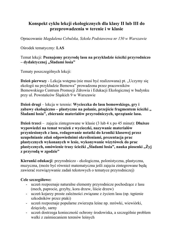 Konspekt cyklu lekcji ekologicznych dla klasy II lub III do przeprowadzenia w terenie i w klasie Opracowanie Magdalena Cebulska, Szkoła Podstawowa nr 150 w Warszawie Ośrodek tematyczny: LAS Temat lekcji: Poznajemy przyrodę lasu na przykładzie ścieżki przyrodniczo – dydaktycznej „Śladami łosia” Tematy poszczególnych lekcji: Dzień pierwszy - Lekcja wstępna (nie musi być realizowana) pt. „Uczymy się ekologii na przykładzie Bemowa” prowadzona przez pracowników Bemowskiego Centrum Promocji Zdrowia i Edukacji Ekologicznej w budynku przy ul. Powstańców Śląskich 9 w Warszawie Dzień drugi – lekcja w terenie: Wycieczka do lasu bemowskiego, gry i zabawy ekologiczno – plastyczne na polanie, przejście fragmentem ścieżki „ Śladami łosia”, zbieranie materiałów przyrodniczych, sprzątanie lasu. Dzień trzeci – zajęcia zintegrowane w klasie (3 lub 4 x po 45 minut): Dłuższe wypowiedzi na temat wrażeń z wycieczki, nazywanie materiałów przyniesionych z lasu, redagowanie notatki do kroniki klasowej przez uzupełnianie zdań odpowiednimi określeniami, prezentacja prac plastycznych wykonanych w lesie, wykonywanie wizytówek do prac plastycznych, omówienie trasy ścieżki „Śladami łosia”, nauka piosenki „Żyj z przyrodą w zgodzie” Kierunki edukacji: przyrodniczo - ekologiczna, polonistyczna, plastyczna, muzyczna, (może być również matematyczna jeśli zajęcia zintegrowane będą zawierać rozwiązywanie zadań tekstowych o tematyce przyrodniczej) Cele szczegółowe: - uczeń rozpoznaje naturalne elementy przyrodnicze pochodzące z lasu (mech, paprocie, grzyby, kora drzew, liście drzew) - uczeń kojarzy proste zależności związane z życiem lasu (np. tępienie szkodników przez ptaki) - uczeń rozpoznaje popularne zwierzęta leśne np. mrówki, wiewiórki, dzięcioły, sarny - uczeń dostrzega konieczność ochrony środowiska, a szczególnie problem walki z zaśmiecaniem terenów leśnych - uczeń nazywa i poprawnie zapisuje wyrazy oznaczające elementy naturalnego środowiska - uczeń redaguje zdania w związku z wycieczką - uczeń bogaci swoje słownictwo przez dobieranie odpowiednich określeń podczas prezentacji prac plastycznych - uczeń poznaje piosenkę o tematyce przyrodniczo - ekologicznej Metody: aktywne działanie, rozmowa kierowana, pokaz Formy pracy: praca zbiorowa, grupowa i indywidualna Środki dydaktyczne: kartony, pisaki, taśma dwustronna, samoprzylepna, przezroczysta folia samoprzylepna (samoprzylepne okładki na książki do kupienia w sklepach papierniczych), nożyczki, chusteczki do zawiązania oczu (10 sztuk), waga sprężynowa, elementy naturalnego środowiska zgromadzone przez dzieci, foldery ścieżki „Śladami łosia” z mapką ścieżki (folder wydany na zlecenie Zarządu Oczyszczania Miasta Dział Lasów), albumy, książki przyrodnicze, zeszyty, kartki do pisania nazw, przybory szkolne (w zestawie tym pominięte są materiały wykorzystywane na lekcji w C.P.Z. i E.E.) Uwaga! Wycieczka musi być prowadzona przez nauczyciela, który dobrze zna trasę oraz drogę dojścia do ścieżki „Śladami łosia”. Jeśli nauczyciel nie jest pewien jak dojść do ścieżki, w wycieczce powinna brać udział osoba dobrze zorientowana, mogąca poprowadzić grupę. Przebieg lekcji Lekcja wstępna Na tej lekcji uczniowie w oparciu o foldery, mapy, zdjęcia poznają tereny leśne i wypoczynkowe dzielnicy Bemowo oraz wartościowe pod względem przyrodniczym miejsca, analizują mapy min. takie, która pokazują trasę ścieżki „Śladami łosia”. Lekcja w terenie - wycieczka 1. Zbiórka przed szkołą, przejście na polanę leśną przy ul. Kutrzeby. 2. Krótka rozmowa na temat miejsca, w którym się znajdujemy oraz zasad bezpiecznego i prawidłowego zachowania zakończona spisaniem na dużym kartonie kontraktu. Treść kontraktu: Jesteśmy w lesie gośćmi, to nie jest nasz dom tylko dom roślin i zwierząt, zachowujemy się tak, aby mieszkańcy tego domu czuli się dobrze: - nie niszczymy roślin - nie hałasujemy - nie śmiecimy Cały czas kontrolujemy, czy znajdujemy się blisko innych, nie oddalamy się od grupy, aby się nie zgubić. 3. Uczniowie podpisują się na kartonie z napisanym kontraktem, a następnie rozbiegają się po polance w celu znalezienia dużych gałęzi leżących na ziemi. Gałęzie mają posłużyć do stworzenia stojaka, na którym ma być powieszony kontrakt. 4. Zabawa „Zaprzyjaźniamy się z drzewami” Uczniowie dobierają się w pary, jedno dziecko przewiązuje oczy drugiemu, obraca go 2 razy i doprowadza do dowolnie wybranego drzewa. Uczeń z zasłoniętymi oczami dotyka kory drzewa, liści (jeśli są w zasięgu ręki), obejmuje pień ramionami, aby sprawdzić jego grubość. Następnie jest doprowadzone do miejsca skąd rozpoczęło zabawę. Po zdjęciu chustki próbuje rozpoznać drzewo, z którym się zaprzyjaźniło. potem następuje zmiana ról. 5. Nazywanie drzew rosnących wokół np. sosna, świerk, dąb, brzoza, buk i inne (rozpoznawanie po liściach i owocach) oraz odrysowywanie kory tych drzew. Uwagi Lekcja w CPZ i EE nie musi być realizowana. Opiekunowie – wychowawca oraz dwoje lub więcej rodziców. Można poprosić kogoś z opiekunów, aby pomógł w napisaniu kontraktu. Dobrze byłoby, gdyby każde dziecko wzięło udział w zabawie. Parom powinni towarzyszyć opiekunowie lub zabawę można przeprowadzać kolejno: jedna para wykonuje zadanie, inni przyglądają się. Omówienie tych prac nastąpi w klasie Dzieci dostają czyste, cienkie kartki formatu A5 i kredki świecowe bez papierowej osłony, podchodzą do rozpoznanych drzew, odrysowują korę. Na drugiej stronie podpisują kartki, piszą nazwę drzewa, od którego odrysowały oraz kolor kory (brązowy jasny, ciemny, szary, biały, czarny) i oddają kartki wychowawczyni. 6. Prace plastyczne Uczniowie dobierają się w grupy czteroosobowe. Otrzymują karton z bloku technicznego A4, oraz kawałki taśmy dwustro