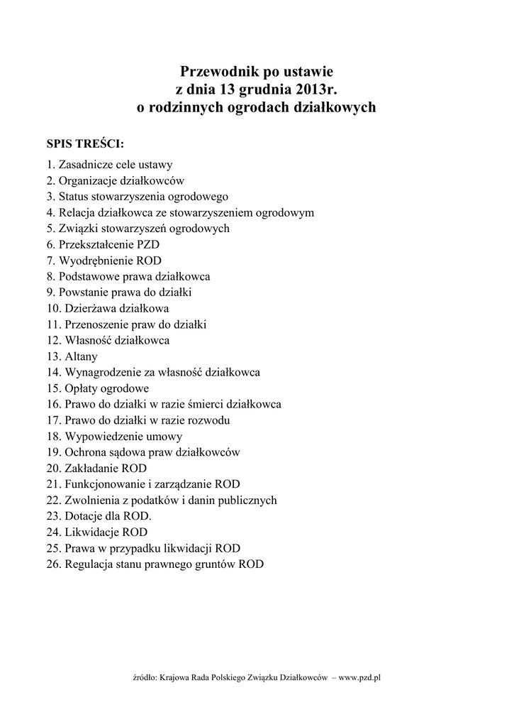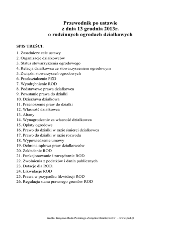 Przewodnik po ustawie z dnia 13 grudnia 2013r. o rodzinnych ogrodach działkowych SPIS TREŚCI: 1. Zasadnicze cele ustawy 2. Organizacje działkowców 3. Status stowarzyszenia ogrodowego 4. Relacja działkowca ze stowarzyszeniem ogrodowym 5. Związki stowarzyszeń ogrodowych 6. Przekształcenie PZD 7. Wyodrębnienie ROD 8. Podstawowe prawa działkowca 9. Powstanie prawa do działki 10. Dzierżawa działkowa 11. Przenoszenie praw do działki 12. Własność działkowca 13. Altany 14. Wynagrodzenie za własność działkowca 15. Opłaty ogrodowe 16. Prawo do działki w razie śmierci działkowca 17. Prawo do działki w razie rozwodu 18. Wypowiedzenie umowy 19. Ochrona sądowa praw działkowców 20. Zakładanie ROD 21. Funkcjonowanie i zarządzanie ROD 22. Zwolnienia z podatków i danin publicznych 23. Dotacje dla ROD. 24. Likwidacje ROD 25. Prawa w przypadku likwidacji ROD 26. Regulacja stanu prawnego gruntów ROD źródło: Krajowa Rada Polskiego Związku Działkowców – www.pzd.pl 1. Zasadnicze cele ustawy Po orzeczeniu Trybunału Konstytucyjnego z 11 lipca 2012r. w sprawie ustawy z dnia 8 lipca 2005r. o rodzinnych ogrodach działkowych Parlament miał 18 miesięcy na uchwalenie nowego prawa dla działkowców. Brak nowej ustawy oznaczałby bowiem utratę mocy przepisów, z których wynikają prawa działkowców do terenów, określających zasady funkcjonowania ROD, czy wreszcie chroniących ogrody przed niekontrolowaną likwidacją. Wystarczy wskazać, wg TK bez nowej ustawy cały majątek w ROD przypadłby właścicielom terenów (głównie gminom), zaś działkowcy staliby się „dzikimi lokatorami”. Aby uniknąć niebezpieczeństwa konieczna była nowa ustawa, która musiała zrealizować wytyczne TK w zakresie swobody zrzeszania, pluralizmu w prowadzeniu ROD oraz poszanowanie praw właścicieli nieruchomości. Ustawa z 13 grudnia 2013r. o rodzinnych ogrodach działowych, która weszła w życie 19 stycznia 2014r., a więc na dwa dni przed terminem wyznaczonym przez TK, spełniła te wymogi. Dzięki rozwiązaniom zawartym w przepisach przejściowych prawa działkowców do terenów ogrodów zostały zachowane, a przejście do nowej sytuacji prawnej będzie płynne i nie zakłóci funkcjonowania ROD. Mechanizmy „demonopolizujące” pozycję PZD pozostawiają decyzję co do formy organizacyjnej ogrodów samym działkowcom. Gwarantują, że w przypadku odłączenia się od ogólnopolskiej organizacji i zawiązania nowego stowarzyszenia, przejmie ono nie tylko prawo do zarządzania ogrodem, ale również tytuł prawny do nieruchomości oraz cały majątek wypracowany w nim przez działkowców. Nowa ustawa równoważy także relacje pomiędzy działkowcami a właścicielami terenów. Znacząco zwiększa uprawnienia właścicieli do przeprowadzania likwidacji ROD, gwarantując jednocześnie respektowanie praw działkowców do odszkodowań i odtworzenia ogrodu, poddając ten proces (w przypadku sporu) kontroli sądowej. Ponadto rozwiązuje niezmiernie istotne problemy, jakim są regulacja stanu prawnego ogrodów i ochrona praw majątkowych działkowców w przypadku roszczeń osób trzecich do terenów ROD. źródło: Krajowa Rada Polskiego Związku Działkowców – www.pzd.pl Ustawa wzmocniła również pozycję prawną indywidualnego działkowca w relacjach ze stowarzyszeniem prowadzącym ROD, poddała je szerokiej kontroli sądowej, zwłaszcza w zakresie ochrony praw do działki. Ponadto rozłączono kwestię członkostwa w stowarzyszeniu z prawem do działki, zachowując oczywiście konieczność partycypowania wszystkich działkowców w kosztach utrzymania ogrodu. Niezmienne pozostaje też ograniczenie w sposobie wykorzystywania działki – zakaz zamieszkiwania i prowadzenia działalności gospodarczej – oraz obowiązek przestrzegania przepisów porządkowych obowiązujących w ROD. Nowa ustawa o ROD wypełnia wytyczne Trybunału Konstytucyjnego realizując jednocześnie zasadniczy cel aktu, tj. zabezpiecza istnienie i rozwój ogrodów działkowych w Polsce. Funkcja ROD nie ulega zmianie. Pozostają urządzeniami użyteczności publicznej służącymi społecznościom lokalnym jako tereny zielone w miastach oraz miejsca wypoczynku i prowadzenia upraw ogrodniczych przez polskie rodziny. Co ważne, dzięki przyjaznym rozwiązaniom fiskalnym oraz oparciu funkcjonowania ROD o pracę społeczną działkowców, tak jak dotychczas działki będą dostępne dla osób mniej zamożnych. Warto podkreślić, że nowa ustawa o ROD jest pierwszym aktem kompleksowo regulującym ważną dziedzinę życia społecznego, który uchwalono w trybie inicjatywy obywatelskiej. Wniesiona do Sejmu z blisko milionem podpisów obywateli, uzyskała również olbrzymie poparcie w Parlamencie - głosowało za nią 441 posłów. Ta szeroka akceptacja jest najlepszym dowodem, że przyjęto w niej rozwiązania wyważone i kompromisowe. Daje to nadzieję, że przyszłość ogrodów nie będzie już przedmiotem sporów i targów politycznych, a milionowa rzesza polskich rodzin będzie mogła w spokoju korzystać ze swych działek w ROD. BP 2. Organizacje działkowców Jedną z fundamentalnych kwestii uregulowanych w nowej ustawie jest system organizacyjny funkcjonowania ogrodnictwa działkowego. Kwestia ta ma kluczowe znaczenie, gdyż sprowadza się do określenia organizacji, które nie tylko przejmą źródło: Krajowa Rada Polskiego Związku Działkowców – www.pzd.pl odpowiedzialność za prowadzenia ROD, ale również będą stanowiły prawną formę zrzeszania się działkowców i ogrodów. Wynika stąd, że takie organizacje powinny realizować dwojakie funkcje – zarządczą oraz zrzeszeniową. Z tego względu ustawodawca uznał, że punktem wyjścia dla skonstruowania właściwych form prawnych dla organizacji działkowców jest ustawa – Prawo o stowarzyszeniach. Normuje ona bowiem ustrój takich jednostek, które pod względem swojego charakteru prawnego, zasadniczo odpowiadają wymogom stawianym