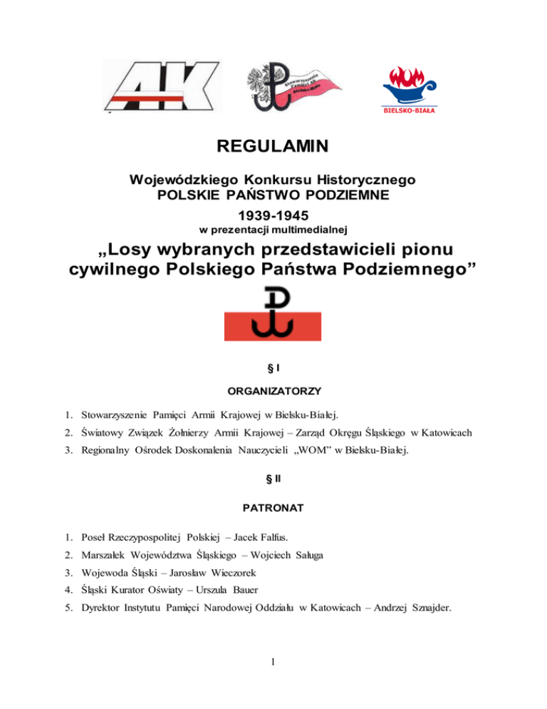REGULAMIN Wojewódzkiego Konkursu Historycznego POLSKIE PAŃSTWO PODZIEMNE 1939-1945 w prezentacji multimedialnej „Losy wybranych przedstawicieli pionu cywilnego Polskiego Państwa Podziemnego” §I ORGANIZATORZY 1. Stowarzyszenie Pamięci Armii Krajowej w Bielsku-Białej. 2. Światowy Związek Żołnierzy Armii Krajowej – Zarząd Okręgu Śląskiego w Katowicach 3. Regionalny Ośrodek Doskonalenia Nauczycieli „WOM” w Bielsku-Białej. § II PATRONAT 1. Poseł Rzeczypospolitej Polskiej – Jacek Falfus. 2. Marszałek Województwa Śląskiego – Wojciech Saługa 3. Wojewoda Śląski – Jarosław Wieczorek 4. Śląski Kurator Oświaty – Urszula Bauer 5. Dyrektor Instytutu Pamięci Narodowej Oddziału w Katowicach – Andrzej Sznajder. 1 § III UCZESTNICY 1. Konkurs jest adresowany do uczniów gimnazjów i szkół ponadgimnazjalnych województwa śląskiego. 2. Udział uczniów w konkursie jest bezpłatny i dobrowolny. § IV CELE KONKURSU 1. Upowszechnienie wiedzy o Polskim Państwie Podziemnym i Armii Krajowej. 2. Rozbudzenie i rozwijanie zainteresowania młodzieży historią najnowszą. 3. Kształtowanie postaw patriotycznych i obywatelskich. 4. Zachęcanie uczniów do większej aktywności oraz rozwijania zainteresowań i uzdolnień. 5. Rozwijanie umiejętności korzystania z różnych źródeł informacji. 6. Zdobycie umiejętności wykorzystywania technologii informacyjnej jako środka przekazu. 7. Tworzenie możliwości do współzawodnictwa uczniów szkół gimnazjalnych i ponadgimnazjalnych §V FORMA KONKURSU 1. Wykonanie prezentacji multimedialnej. § VI ZASADY TWORZENIA PREZENTACJI MULTIMEDIALNYCH 1. Uczeń wykonuje prezentację samodzielnie. 2. Praca konkursowa może być przygotowana w dowolnym programie do tworzenia prezentacji multimedialnych, przy czym wymagane jest zapisanie jej na płycie CD/DVD w formacie zgodnym z programem PowerPoint (Microsoft Office), Impress (OpenOffice) lub innym możliwym do uruchomienia za pomocą przeglądarki internetowej. 2 3. Prezentacja może zawierać do 20 slajdów, a w przypadku automatycznego odtwarzania czas projekcji nie może przekroczyć 15 minut. 4. Dopuszcza się wykorzystanie gotowych zdjęć, filmów, grafik, dźwięków, tekstów itp., jednak należy w prezentacji podać wykorzystane źródła. 5. Do konkursu można zgłosić prezentację, która nie brała udziału w żadnym innym konkursie. 6. Uczeń może samodzielnie dokonać wyboru przedstawiciela (przedstawicieli) pionu cywilnego Polskiego Państwa Podziemnego i przedstawić jego (ich) losy. Może dokonać wyboru spośród władz Rzeczpospolitej Polskiej na Uchodźstwie, Delegatury Rządu na Kraj, jak również jednostek organizacyjnych Biura Delegata Rządu na Kraj: wydziałów, departamentów referatów a także jednostek terenowych. § VII TERMIN I SPOSÓB NADSYŁANIA PRAC Termin dostarczenia prac upływa 21 grudnia 2016 r. (środa). Najpóźniej w tym dniu prace konkursowe muszą znaleźć się w siedzibie RODN „WOM” w Bielsku-Białej (Uwaga: nie decyduje data stempla pocztowego). Prezentację zapisaną na płycie CD/DVD, opatrzoną imieniem i nazwiskiem autora, należy przesłać pocztą (listem poleconym) lub dostarczyć osobiście w zaklejonej kopercie na adres: Regionalny Ośrodek Doskonalenia Nauczycieli „WOM” w Bielsku-Białej ul. Legionów 25 43-300 Bielsko-Biała z dopiskiem „POLSKIE PAŃSTWO PODZIEMNE” Do prezentacji należy dołączyć kwestionariusz zgłoszeniowy (wg załączonego wzoru). Do konkursu przyjmuje się maksymalnie 3 prezentacje uczniów danej szkoły. Osobą odpowiedzialną za organizację konkursu w RODN „WOM” w Bielsku-Białej jest Urszula Rukasz – tel. (33) 812 37 15 , wew. 120, e-mail: [email protected] 3 § VIII OCENA PRAC 1. Prezentacje będą oceniane w dwóch kategoriach wiekowych: a) gimnazja, b) szkoły ponadgimnazjalne. 2. Prezentacje oceni jury powołane przez organizatorów konkursu. 3. W ocenie będą brane pod uwagę następujące kryteria: a) zgodność z tematem, b) trafność i oryginalność przedstawienia tematu, c) zawartość merytoryczna, d) walory artystyczne prezentacji, e) dobór i wykorzystanie narzędzi informatycznych (możliwości programu). 4. Decyzje jury są ostateczne. 5. Ogłoszenie wyników nastąpi na stronie internetowej RODN „WOM” w Bielsku-Białej www.wombb.edu.pl w dniu 20.01.2017 r. wraz z informacją o terminie i miejscu uroczystego wręczenia nagród. § IX NAGRODY 1. Nagrody rzeczowe i książkowe zostały ufundowane przez organizatorów i sponsorów: a) indywidualne : sprzęt elektroniczny i multimedialny, b) dla szkół: pakiety książek, gry dydaktyczne, plansze historyczne. §X UWAGI KOŃCOWE 1. Nadesłane prace konkursowe nie będą zwracane i przechodzą na własność organizatora konkursu. 2. Organizator zastrzega sobie prawo do publikowania i prezentacji prac konkursowych (w całości lub we fragmentach) bez wypłacania honorariów autorskich. 4 3. Uczestnicy wyrażają zgodę na przetwarzanie i publikowanie dostarczonych danych osobowych. 4. Nadesłanie prac konkursowych jest równoważne z przyjęciem warunków regulaminu i oświadczeniem, że prace zgłoszone na konkurs z zachowaniem wszelkich praw autorskich osób trzecich. 5 zostały wykonane osobiście KWESTIONARIUSZ ZGŁOSZENIOWY 1. Imię i nazwisko ucznia 2. Tytuł pracy 3. Nazwa i adres szkoły Telefon szkoły 4. E-mail szkoły 5. Imię i nazwisko nauczyciela (tytuł/stopień naukowy) Wyrażam zgodę na przetwarzanie i publikowanie podanych danych osobowych oraz wizerunku dla celów związanych z realizacją konkursu zgodnie z przepisami ustawy o ochronie danych osobowych z dnia 29 sierpnia 1997 r. (Dz. U z 2002 r. Nr 101, poz. 926 z późn. zm.). …………………………………… …………………………………… podpis nauczyciela podpis ucznia …………………………………… podpis rodzica/opiekuna (w przypadku uczniów niepełnoletnich) 6