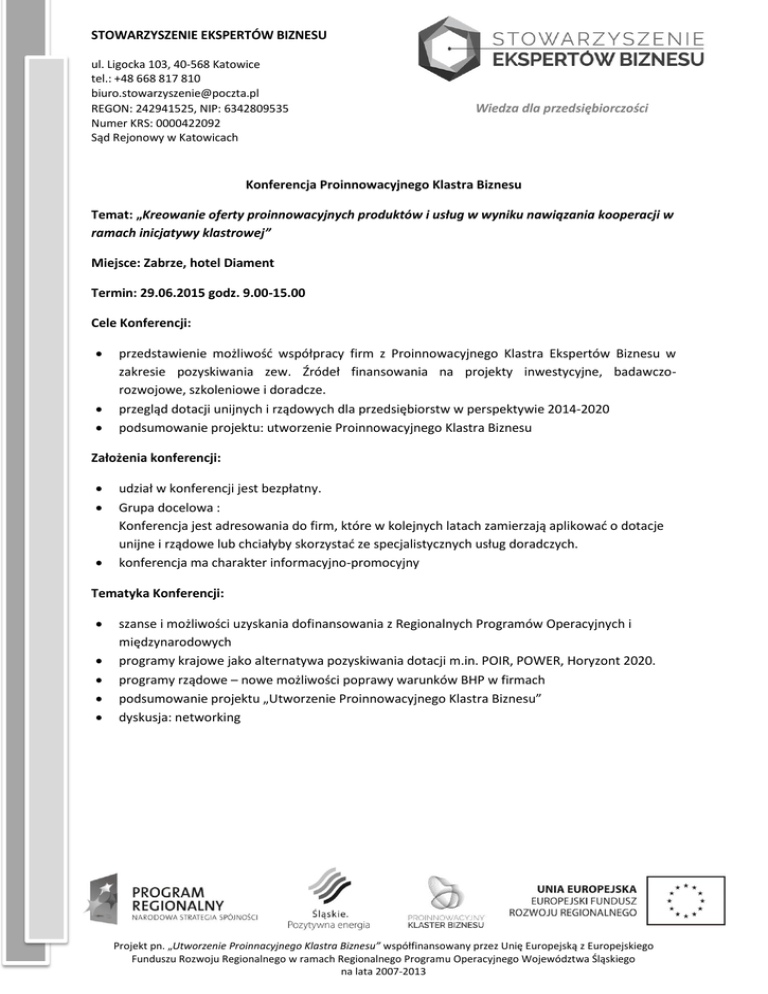 STOWARZYSZENIE EKSPERTÓW BIZNESU ul. Ligocka 103, 40-568 Katowice tel.: +48 668 817 810 [email protected] REGON: 242941525, NIP: 6342809535 Numer KRS: 0000422092 Sąd Rejonowy w Katowicach Wiedza dla przedsiębiorczości Konferencja Proinnowacyjnego Klastra Biznesu Temat: „Kreowanie oferty proinnowacyjnych produktów i usług w wyniku nawiązania kooperacji w ramach inicjatywy klastrowej” Miejsce: Zabrze, hotel Diament Termin: 29.06.2015 godz. 9.00-15.00 Cele Konferencji: przedstawienie możliwośd współpracy firm z Proinnowacyjnego Klastra Ekspertów Biznesu w zakresie pozyskiwania zew. Źródeł finansowania na projekty inwestycyjne, badawczorozwojowe, szkoleniowe i doradcze. przegląd dotacji unijnych i rządowych dla przedsiębiorstw w perspektywie 2014-2020 podsumowanie projektu: utworzenie Proinnowacyjnego Klastra Biznesu Założenia konferencji: udział w konferencji jest bezpłatny. Grupa docelowa : Konferencja jest adresowania do firm, które w kolejnych latach zamierzają aplikowad o dotacje unijne i rządowe lub chciałyby skorzystad ze specjalistycznych usług doradczych. konferencja ma charakter informacyjno-promocyjny Tematyka Konferencji: szanse i możliwości uzyskania dofinansowania z Regionalnych Programów Operacyjnych i międzynarodowych programy krajowe jako alternatywa pozyskiwania dotacji m.in. POIR, POWER, Horyzont 2020. programy rządowe – nowe możliwości poprawy warunków BHP w firmach podsumowanie projektu „Utworzenie Proinnowacyjnego Klastra Biznesu” dyskusja: networking Projekt pn. „Utworzenie Proinnacyjnego Klastra Biznesu” współfinansowany przez Unię Europejską z Europejskiego Funduszu Rozwoju Regionalnego w ramach Regionalnego Programu Operacyjnego Województwa Śląskiego na lata 2007-2013