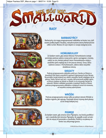 Helper Fearless DEF_Mise en page 1 08/07/14 10:56 Page13 RASY BARBARZYŃCY Barbarzyńcy nie mogą przegrupowywać oddziałów na koniec tury. Jeśli ostatni podbój będzie nieudany, niewykorzystane żetony Barbarzyńców odłóż na bok. Możesz ich użyć dopiero w swojej następnej turze. HOMUNKULUSY Za każdym razem, gdy zestaw bitewny Homunkulusów zostaje pominięty podczas wyboru nowej armii, oprócz wymaganej 1 monety, należy na nim również położyć żeton Homunkulusów wzięty z zasobnika (jeśli znajdują się w nim jeszcze żetony). Gracz, który wybierze zestaw z Homunkulusami, zabiera także wszystkie dodatkowe żetony. SKRZATY Podczas przegrupowania oddziałów połóż po 1 Garnku ze Złotem w dowolnych (lub nawet wszystkich) regionach zajmowanych przez Skrzaty. Na początku swojej kolejnej tury zabierz wszystkie Garnki znajdujące się na planszy. Każdy Garnek wart jest 1 monetę. Jeśli przeciwnik podbije region, w którym znajduje się Garnek ze Złotem, to on otrzymuje Garnek na własność. Możesz rozkładać pozostałe w zasobach Garnki ze Złotem podczas przegrupowywania oddziałów w kolejnych turach do momentu, aż wszystkie zostaną wykorzystane. WRÓŻKI Podczas przegrupowania zostaw tylko po jednym żetonie Wróżek w każdym regionie, jaki zajmują. Pozostałe żetony trzymaj obok planszy aż do swojej kolejnej tury. PIGMEJE Za każdym razem, gdy utracisz żeton Pigmejów, rzuć kością posiłków i weź z zasobnika tyle żetonów Pigmejów, ile wypadło oczek na kości (ale nie więcej niż pozostało w zasobniku). Rozłóż je na planszy na koniec tury aktywnego gracza. © 2010-2014 Days of Wonder, Inc. All Rights Reserved. Helper Fearless DEF_Mise en page 1 08/07/14 10:56 Page14 ZDOLNOŚCI SPECJALNE ZABARYKADOWANE Weź 3 monety za każdym razem, gdy na koniec Twojej tury należące do Ciebie Zabarykadowane oddziały zajmują 4 lub mniej regionów. KATAPULTA Raz na turę możesz umieścić Katapultę w zajmowanym przez tę rasę regionie, aby podbić region oddalony o 1 region (ale nie sąsiedni) kosztem 1 żetonu mniej niż zazwyczaj. Katapulta może zostać wykorzystana do ataku na region znajdujący się za Jeziorem, ale nie za Morzem. Region, w którym znajduje się Katapulta, jest odporny na podboje wrogich oddziałów jak i na ich zdolności specjalne oraz cechy ras. Gdy Twoja rasa ogłasza schyłek cywilizacji, zdejmij Katapultę z planszy. SKORUMPOWANE Gdy któryś z przeciwników podbije region zajęty przez Twoją aktywną Skorumpowaną rasę, otrzymujesz od niego 1 monetę. IMPERIALNE Jeśli na koniec Twojej tury Twoje Imperialne oddziały zajmują więcej niż 3 regiony, otrzymujesz 1 dodatkową monetę za każdy region powyżej tej liczby. Na przykład: jeśli Imperialne oddziały zajmują na koniec tury 5 regionów, otrzymujesz 2 monety. NAJEMNE Za każdym razem, gdy podbijasz region, możesz wydać 1 monetę, aby obniżyć koszt podboju o 2 żetony. Nadal potrzebujesz co najmniej 1 żetonu. Podczas ostatniego podboju możesz skorzystać z tej zdolności po rzucie kością posiłków. © 2010-2014 Days of Wonder, Inc. All Rights Reserved.