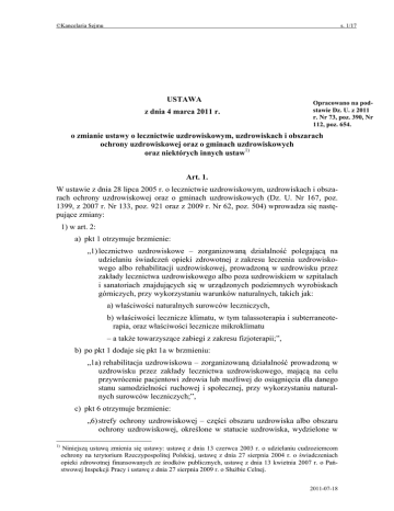 ©Kancelaria Sejmu s. 1/17 USTAWA z dnia 4 marca 2011 r. Opracowano na podstawie Dz. U. z 2011 r. Nr 73, poz. 390, Nr 112, poz. 654. o zmianie ustawy o lecznictwie uzdrowiskowym, uzdrowiskach i obszarach ochrony uzdrowiskowej oraz o gminach uzdrowiskowych oraz niektórych innych ustaw1) Art. 1. W ustawie z dnia 28 lipca 2005 r. o lecznictwie uzdrowiskowym, uzdrowiskach i obszarach ochrony uzdrowiskowej oraz o gminach uzdrowiskowych (Dz. U. Nr 167, poz. 1399, z 2007 r. Nr 133, poz. 921 oraz z 2009 r. Nr 62, poz. 504) wprowadza się następujące zmiany: 1) w art. 2: a) pkt 1 otrzymuje brzmienie: „1) lecznictwo uzdrowiskowe – zorganizowaną działalność polegającą na udzielaniu świadczeń opieki zdrowotnej z zakresu leczenia uzdrowiskowego albo rehabilitacji uzdrowiskowej, prowadzoną w uzdrowisku przez zakłady lecznictwa uzdrowiskowego albo poza uzdrowiskiem w szpitalach i sanatoriach znajdujących się w urządzonych podziemnych wyrobiskach górniczych, przy wykorzystaniu warunków naturalnych, takich jak: a) właściwości naturalnych surowców leczniczych, b) właściwości lecznicze klimatu, w tym talassoterapia i subterraneoterapia, oraz właściwości lecznicze mikroklimatu – a także towarzyszące zabiegi z zakresu fizjoterapii;”, b) po pkt 1 dodaje się pkt 1a w brzmieniu: „1a) rehabilitacja uzdrowiskowa – zorganizowaną działalność prowadzoną w uzdrowisku przez zakłady lecznictwa uzdrowiskowego, mającą na celu przywrócenie pacjentowi zdrowia lub możliwej do osiągnięcia dla danego stanu samodzielności ruchowej i społecznej, przy wykorzystaniu naturalnych surowców leczniczych;”, c) pkt 6 otrzymuje brzmienie: „6) strefy ochrony uzdrowiskowej – części obszaru uzdrowiska albo obszaru ochrony uzdrowiskowej, określone w statucie uzdrowiska, wydzielone w 1) Niniejszą ustawą zmienia się ustawy: ustawę z dnia 13 czerwca 2003 r. o udzielaniu cudzoziemcom ochrony na terytorium Rzeczypospolitej Polskiej, ustawę z dnia 27 sierpnia 2004 r. o świadczeniach opieki zdrowotnej finansowanych ze środków publicznych, ustawę z dnia 13 kwietnia 2007 r. o Państwowej Inspekcji Pracy i ustawę z dnia 27 sierpnia 2009 r. o Służbie Celnej. 2011-07-18 ©Kancelaria Sejmu s. 2/17 celu ochrony czynników leczniczych i naturalnych surowców leczniczych, walorów środowiska i urządzeń uzdrowiskowych;”, d) pkt 8 otrzymuje brzmienie: „8) naturalne surowce lecznicze – gazy lecznicze oraz kopaliny lecznicze, w tym wody lecznicze i peloidy, których właściwości lecznicze zostały potwierdzone na zasadach określonych w ustawie;”, e) w pkt 10 kropkę zastępuje się średnikiem i dodaje pkt 11–14 w brzmieniu: „11) tereny zieleni – powierzchnie gruntu pokryte roślinnością trwałą lub sezonową; 12) tereny biologicznie czynne – tereny z nawierzchnią ziemną urządzoną w sposób zapewniający naturalną wegetację, w szczególności jako trawniki lub kwietniki, a także stanowiące 50 % sumy powierzchni tarasów i stropodachów z taką nawierzchnią, nie mniejszej jednak niż 10 m2, oraz wodę powierzchniową na tych terenach; 13) zakład przemysłowy – zespół budynków i urządzeń wraz z terenem, na którym prowadzi się działalność wytwórczą polegającą na przekształcaniu mechanicznym, fizycznym lub chemicznym materiału, substancji lub ich części składowych w nowy produkt; 14) powierzchnia użytkowania – powierzchnię budynku lub jego części, mierzoną po wewnętrznej długości ścian na wszystkich kondygnacjach, oraz powierzchnię pomieszczeń pomocniczych, takich jak: magazyny, biura, ekspozycje wystawowe.”; 2) w art. 4 ust. 2 otrzymuje brzmienie: „2. W uzdrowiskach lecznictwo uzdrowiskowe jest prowadzone w zakładach lecznictwa uzdrowiskowego zlokalizowanych w strefie „A” ochrony uzdrowiskowej.”; 3) w art. 5 w ust. 1 wprowadzenie do wyliczenia otrzymuje brzmienie: „Lecznictwo uzdrowiskowe jest prowadzone przy wykorzystaniu urządzeń lecznictwa uzdrowiskowego, takich jak:”; 4) w art. 6: a) pkt 3 otrzymuje brzmienie: „3) szpitale uzdrowiskowe dla dzieci i sanatoria uzdrowiskowe dla dzieci;”, b) w pkt 4 kropkę zastępuje się średnikiem i dodaje pkt 5 i 6 w brzmieniu: „5) zakłady przyrodolecznicze; 6) szpitale i sanatoria w urządzonych podziemnych wyrobiskach górniczych.”; 5) uchyla się art. 7; 6) art. 8–10 otrzymują brzmienie: „Art. 8. Do zadań szpitala uzdrowiskowego należy zapewnienie pacjentowi, którego skierowano na leczenie uzdrowiskowe albo rehabilitację uzdrowiskową: 1) całodobowych świadczeń opieki zdrowotnej w warunkach stacjonarnych; 2011-07-18 ©Kancelaria Sejmu s. 3/17 2) całodobowej opieki lekarskiej i pielęgniarskiej; 3) przewidzianych programem leczenia zabiegów; 4) korzystania z naturalnych surowców leczniczych oraz urządzeń lecznictwa uzdrowiskowego; 5) edukacji zdrowotnej. Art. 9. 1. Do zadań sanatorium uzdrowiskowego należy zapewnienie pacjentowi, którego skierowano na leczenie uzdrowiskowe albo rehabilitację uzdrowiskową: 1) całodobowych świadczeń opieki zdrowotnej w warunkach stacjonarnych; 2) opieki lekarskiej i całodobowej opieki pielęgniarskiej; 3) przewidzianych programem leczenia zabiegów; 4) świadczeń profilaktycznych; 5) edukacji zdrowotnej. 2. Świadczenia, o których mowa w ust. 1 pkt 1, obejmują związane z leczeniem uzdrowiskowym albo rehabilitacją uzdrowiskową świadczenia zdrowotne rzeczowe, o których mowa w art. 5 pkt 37 ustawy z dnia 27 sierpnia 2004 r. o świadczeniach opieki zdrowotnej finansowanych ze środków publicznych (Dz. U. z 2008 r. Nr 164, poz. 1027, z późn. zm.2)). Art. 10. 1. Do zadań szpitala uzdrowiskowego dla dzieci i sanatorium uzdrowiskowego dla dzieci należy zapewnienie dziecku, które skierowano na leczenie uzdrowiskowe albo rehabilitację uzdrowiskową: 1) całodobowych świadczeń opieki zdrowotnej w warunkach stacjonarnych; 2) całodobowej opieki lekarskiej i pielęgniarskiej; 3) przewidzianyc