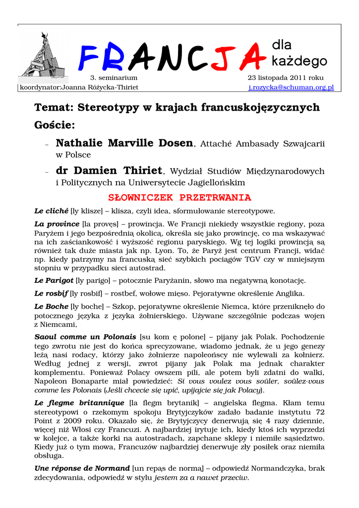 FRANCJA dla każdego 3. seminarium 23 listopada 2011 roku koordynator:Joanna RóżyckaThiriet [email protected] Temat: Stereotypy w krajach francuskojęzycznych Goście: − Nathalie Marville Dosen, Attaché Ambasady Szwajcarii w Polsce − dr Damien Thiriet, Wydział Studiów Międzynarodowych i Politycznych na Uniwersytecie Jagiellońskim SŁOWNICZEK PRZETRWANIA Le cliché [ly klisze] – klisza, czyli idea, sformułowanie stereotypowe. La province [la provęs] – prowincja. We Francji niekiedy wszystkie regiony, poza Paryżem i jego bezpośrednią okolicą, określa się jako prowincję, co ma wskazywać na ich zaściankowość i wyższość regionu paryskiego. Wg tej logiki prowincją są również tak duże miasta jak np. Lyon. To, że Paryż jest centrum Francji, widać np. kiedy patrzymy na francuską sieć szybkich pociągów TGV czy w mniejszym stopniu w przypadku sieci autostrad. Le Parigot [ly parigo] – potocznie Paryżanin, słowo ma negatywną konotację. Le rosbif [ly rosbif] – rostbef, wołowe mięso. Pejoratywne określenie Anglika. Le Boche [ly boche] – Szkop, pejoratywne określenie Niemca, które przeniknęło do potocznego języka z języka żołnierskiego. Używane szczególnie podczas wojen z Niemcami, Saoul comme un Polonais [su kom ę polone] – pijany jak Polak. Pochodzenie tego zwrotu nie jest do końca sprecyzowane, wiadomo jednak, że u jego genezy leżą nasi rodacy, którzy jako żołnierze napoleońscy nie wylewali za kołnierz. Według jednej z wersji, zwrot pijany jak Polak ma jednak charakter komplementu. Ponieważ Polacy owszem pili, ale potem byli zdatni do walki, Napoleon Bonaparte miał powiedzieć: Si vous voulez vous soûler, soûlezvous comme les Polonais (Jeśli chcecie się upić, upijajcie się jak Polacy). Le flegme britannique [la flegm brytanik] – angielska flegma. Kłam temu stereotypowi o rzekomym spokoju Brytyjczyków zadało badanie instytutu 72 Point z 2009 roku. Okazało się, że Brytyjczycy denerwują się 4 razy dziennie, więcej niż Włosi czy Francuzi. A najbardziej irytuje ich, kiedy ktoś ich wyprzedzi w kolejce, a także korki na autostradach, zapchane sklepy i niemiłe sąsiedztwo. Kiedy już o tym mowa, Francuzów najbardziej denerwuje zły posiłek oraz niemiła obsługa. Une réponse de Normand [un repąs de normą] – odpowiedź Normandczyka, brak zdecydowania, odpowiedź w stylu jestem za a nawet przeciw. DOBRZE POWIEDZIANE – FRAZA DNIA On ne peut pas faire confiance à des gens dont la cuisine est si mauvaise (Nie można ufać ludziom, których kuchnia jest tak zła). La seule chose qu'ils ont jamais faite pour l'agriculture européenne est la maladie de la vache folle (Jedyną rzeczą, jaką kiedykolwiek zrobili dla europejskiego rolnictwa jest choroba wściekłych krów) Après la Finlande, c'est le pays avec la pire nourriture (Po Finlandii to kraj z najgorszym jedzeniem). tak francuski prezydent Jacques Chirac miał żartować z Brytyjczyków i ich kuchni, a przy okazji też i z kuchni fińskiej, podczas spotkania z niemieckim kanclerzem Gerhardem Schroederem i rosyjskim prezydentem Władimirem Putinem w 2005 roku. Świętowali 750lecie Kaliningradu. PORTRETY MNIEJ ZNANYCH MĘŻCZYZN I KOBIET Dany Boon (ur. 1966 r.) jest satyrykiem (spektakle w stylu oneman show), aktorem i reżyserem. Jego prawdziwe nazwisko brzmi Daniel Hamidou (ojciec był pochodzenia algierskiego). Pochodzi z północy Francji, stąd zrobiony przez niego film Jeszcze dalej niż Północ (Bienvenue chez les Ch’ti, 2008 rok) był niejako powrotem do korzeni. Film o pracowniku poczty z południowej Francji, który za karę został przeniesiony na stanowisko w odległym regionie NordPas de Calais, dosyć niespodziewanie okazał się wielkim hitem – największym francuskim przebojem po wojnie. Mieszkańcy północnej Francji chodzili na niego do kin nawet w Belgii, a ser maroille, który pojawił się w filmie (ścisła czołówka najbardziej śmierdzących serów Francji) zwiększył sprzedaż o kilkadziesiąt procent. Była to też świetna reklama dla miasteczka Bergue, gdzie toczy się większość akcji. Polscy widzowie znają Boona m.in. z filmu Mój najlepszy przyjaciel (Mon meilleur ami), gdzie gra taksówkarza, którzy chce wystąpić w programie Milionerzy. Jego ostatni film o celnikach pt. Nic do oclenia (Rien à Déclarer) również powraca do tematyki stereotypów, tym razem francusko-belgijskich. JAK TO SIĘ JE, CZYLI O FRANCUSKICH ZWYCZAJACH Asterix chez les Belges, Asterix chez les Bretons, Asterix chez le Helvets... komiksy Gocinnego i Uderzo to kopalnia stereotypów na temat innych narodów widzianych oczami Francuzów (np. Szwajcarzy – naród powolny, zajadający się potrawą fondue ze stopionego sera). Ale też samych Francuzów. Organizatorem seminariów jest Polska Fundacja im. Roberta Schumana Partnerem seminariów jest Fundacja Roberta Schumana w Paryżu Działania Polskiej Fundacji im. Roberta Schumana są współfinansowane przez Unię Europejską, ze środków programu Europa dla Obywateli