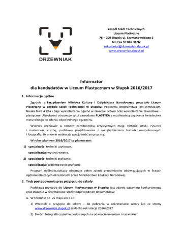 Zespół Szkół Technicznych Liceum Plastyczne 76 – 200 Słupsk; ul. Szymanowskiego 5 tel. Fax 59 842 34 92 [email protected] www.drzewniak.slupsk.pl Informator dla kandydatów w Liceum Plastycznym w Słupsk 2016/2017 1. Informacje ogólne Zgodnie z Zarządzeniem Ministra Kultury i Dziedzictwa Narodowego powstało Liceum Plastyczne w Zespole Szkół Technicznej w Słupsku. Podstawą programowa jest gimnazjum. Nauka trwa 4 lata i daje wykształcenie ogólne w zakresie liceum oraz wykształcenie zawodowe – plastyczne. Absolwent otrzymuje tytuł zawodowy PLASTYKA z możliwością uzyskania świadectwa maturalnego po zdaniu odpwiedniego egzaminu. Wszyscy uczniowie w ramach przedmiotów artystycznych mają: historię sztuki, rysunek i malarstwo, rzeźbę, podstawy projektowania z uwzględnieniem technik komputerowych i fotografię. Uczniowie wybieraja specjalność artystyczną. W roku szkolnym 2016/2017 są planowane: 1) specjalność: techniki użytkowe, specjalizacja: wystrój wnętrz, 2) specjalność: techniki graficzne: specjalizacja: projektowanie graficzne. Program ogólnokształcący obejmuje pełen zakres przedmiotów obowiązujących w liceach ogólnokształcących określonych przez Ministerstwo Edukacji Narodowej. 2. Tryb postępowania przy przyjęciu do szkoły Podstawą przyjęcia do Liceum Plastycznego w Słupsku jest zdanie egzaminu konkursowego oraz złożenie w sekretariacie szkoły odpowiednich dokumentów: A. W terminie do 25 maja 2016 r.: 1) Wniosek o przyjęcie do szkoły – do pobrania w sekretariacie szkoły lub ze strony www.drzewniak.slupsk.pl zakładka rekrutacja 2016/2017 2) Dwóch fotografii czytelnie podpisanych na odwrocie imieniem i nazwiskiem 3) Potwierdzonego przez gimnazjum wykazu ocen za I okres klasy III gimnazjum 4) Innych dokumentów posiadanych przez kandydata (np. dyplomy, zaświadczenia) B. Egzamin zostanie przeprowadzony w dnia 30 maja 2016 r. o godz. 1400. Egzamin obejmuje badanie wrażliwości plastycznej i ćwiczenia praktyczne z zakresu rysunku, malarstwa i form przestrzennych (np. rzeźby w materiałach plastycznych) oraz ogólnych wiadomości o sztuce. O przyjęciu do pierwszej klasy będzie decydowała suma punktów z egzaminu, suma punktów z siedmiu przedmiotów ze świadectwa kl. III gimnazjum: języka polskiego, języka obcego, geografii, biologii, matematyki, historii i zajęć plastycznych oraz egzaminu gimnazjalnego. C. W terminie do 07 lipca 2016 r. (osoby, które zdały egzamin) 5) Zaświdczenia z OKE o wynikach egzaminu gimnazjalnego (oryginał) 6) Świadectwa ukończenia gimnazjum (oryginał) 7) Karty zdrowia w terminie siedmiu dni od ogłoszenia listy przyjętych. Decyzje o przyjęciu podejmuje dyrektor zespołu na podstawie sumy punktów. Pierwszeństwo maja kandydaci, którzy uzyskali najlepsze wyniki. Lista przyjętych zostanie ogłoszona 30 maja 2016 r. 3. Konsultacje Dla chętnych w szkole organizowane są bezpłatne konsultacje (przegląd prac plastycznych i informacje) oraz wrsztaty plastyczne (z rysunku, malarstwa, rzeźby i wiadomości o sztuce). Konsultacje jak i warsztaty plastyczne organizowane będą w dniach: środa – 31 III, 06 IV, 20 IV, 27 IV i czwartk – 12 V od 1330 do 1530 w Pracowni rysunku i malarstw nr 17 Szczegółowych informacji udziela sekretariat szkoły.