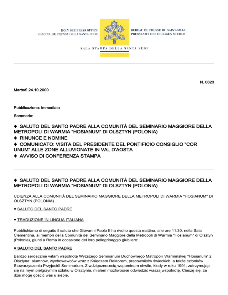 N. 0623 Martedì 24.10.2000 Pubblicazione: Immediata Sommario: ♦ SALUTO DEL SANTO PADRE ALLA COMUNITÀ DEL SEMINARIO MAGGIORE DELLA METROPOLI DI WARMIA "HOSIANUM" DI OLSZTYN (POLONIA) ♦ RINUNCE E NOMINE ♦ COMUNICATO: VISITA DEL PRESIDENTE DEL PONTIFICIO CONSIGLIO "COR UNUM" ALLE ZONE ALLUVIONATE IN VAL D’AOSTA ♦ AVVISO DI CONFERENZA STAMPA ♦ SALUTO DEL SANTO PADRE ALLA COMUNITÀ DEL SEMINARIO MAGGIORE DELLA METROPOLI DI WARMIA "HOSIANUM" DI OLSZTYN (POLONIA) UDIENZA ALLA COMUNITÀ DEL SEMINARIO MAGGIORE DELLA METROPOLI DI WARMIA "HOSIANUM" DI OLSZTYN (POLONIA) ● SALUTO DEL SANTO PADRE ● TRADUZIONE IN LINGUA ITALIANA Pubblichiamo di seguito il saluto che Giovanni Paolo II ha rivolto questa mattina, alle ore 11.30, nella Sala Clementina, ai membri della Comunità del Seminario Maggiore della Metropoli di Warmia "Hosianum" di Olsztyn (Polonia), giunti a Roma in occasione del loro pellegrinaggio giubilare: ● SALUTO DEL SANTO PADRE Bardzo serdecznie witam wspólnotę Wyższego Seminarium Duchownego Matropolii Warmiñskiej "Hosianum" z Olsztyna: alumnów, wychowawców wraz z Księdzem Rektorem, pracowników świeckich, a także członków Stowarzyszenia Przyjaciół Seminarium. Z wdzięcznoœcią wspominam chwile, kiedy w roku 1991, zatrzymując się na mym pielgrzymim szlaku w Olsztynie, miałem możliwoœæ odwiedzić waszą wspólnotę. Cieszę się, że dziś mogę gościć was u siebie. Bollettino N. 0623 - 24.10.2000 2 Przybyliœcie do Rzymu w Roku Jubileuszowym, aby u grobów apostołów Piotra i Pawła prosić o łaski i błogosławieństwo na czas obecny i na przyszłość. W perspektywie nowego tysiąclecia ta jubileuszowa modlitwa jest szczególnie aktualna i potrzebna. Wiek dwudziesty przyniósł ze sobą wiele przemian w różnych dziedzinach życia. Szybki rozwój nauki, techniki, medycyny, kultury, myśli społecznej i politycznej czy wreszcie środków przekazu nie pozostaje bez wpływu na życie duchowe poszczególnych osób, rodzin i całych narodów. Można się spodziewać, że i w nadchodzącym tysiącleciu podobne przemiany w rzeczywistości tego świata będą stanowić ródło nowych wyzwań dla człowieka, szczególnie dla człowieka wierzącego. Aby stawić im czoło, wierni muszą znaleć solidne oparcie w kapłanach dobrze przygotowanych do swej posługi. Dlatego rola seminarium, jako wspólnoty, która wychowuje przyszłych duszpasterzy, jest dziś szczególnie ważna. Seminarium musi być środowiskiem ludzi głębokiej wiary, niezachwianej nadziei i ofiarnej miłości; ludzi otwartych na działanie Ducha Świętego, który budzi w uczniach Chrystusa pragnienie czynnego włączenia się w dzieło przybliżania Królestwa Ojca. Seminarium musi być również miejscem kształtowania kapłanów po ludzku dojrzałych, umiejących korzystać ze zdobyczy współczesnej kultury i chcących ją tworzyć. Dzisiejszy człowiek potrzebuje kapłanów o szerokich horyzontach w myśleniu i działaniu, chętnych do wychodzenia naprzeciw wszelkim potrzebom braci. Seminarium Warmińskie cieszy się długą tradycją. W tym roku mija 435 lat od powołania przez Sługê Bożego Kardynała Stanisława Hozjusza, tego pierwszego na polskiej ziemi Seminarium Duchownego z siedzibą w Braniewie. Trudno objąć w kilku zdaniach całą historię instytucji, dzieje ludzi, którzy ją tworzyli i dzieło kapłanów, którzy z niej wyszli. Niech zatem wystarczy wspomnienie ks. Władysława Demskiego, którego dane mi było wynieść do chwały ołtarzy pośród 108 męczenników. Ten bohaterski kapłan, który wyszedł z waszego Seminarium, oddał swoje życie za Prawdę, broniąc krzyża Chrystusa i wiary chrześcijańskiej. Niech jego świadectwo będzie dla was wszystkich wzorem i umocnieniem na drodze powołania. Modlę się, aby ten posiew krwi nieustannie wydawał owoce w postaci nowych powołań do kapłaństwa w Archidiecezji Warmińskiej. Proszę Boga, aby w czasie tej jubileuszowej pielgrzymki obdarzył was wielorakimi łaskami. Chrystus, Najwyższy i Wieczny Kapłan, niech was prowadzi w nowe tysiąclecie i niech wam błogosławi! [02127-09.02] [Testo originale: Polacco] ● TRADUZIONE IN LINGUA ITALIANA Saluto cordialmente la comunità del Seminario Maggiore della Metropoli di Warmia, "Hosianum", di Olsztyn: gli alunni, gli educatori con il Rettore, i dipendenti laici, ed anche i membri dell’Associazione degli Amici del Seminario. Ricordo con gratitudine il momento quando, nel 1991, fermandomi a Olsztyn sul percorso del mio pellegrinaggio, ebbi l’occasione di visitare la vostra comunità. Sono lieto di potervi ospitare oggi qui da me. Siete venuti a Roma nell’Anno Giubilare, per chiedere, presso le tombe degli apostoli Pietro e Paolo, le grazie e la benedizione per il presente e per il futuro. Una tale preghiera giubilare è particolarmente attuale e importante nella prospettiva del nuovo millennio. Il XX secolo ha portato con sé molte trasformazioni in vari settori della vita. Il rapido sviluppo della scienza, della tecnica, della medicina, della cultura, del pensiero sociale e politico ed infine dei mezzi di comunicazione non ha mancato di esercitare un’influenza sulla vita spirituale delle singole persone, delle famiglie e delle nazioni intere. Si può prevedere che anche nel millennio in cui stiamo entrando simili trasformazioni della realtà di questo mondo costituiranno una fonte di nuove sfide nei riguardi dell’uomo, specialmente dell’uomo credente. Al fine di far fronte ad esse, i credenti devono trovare un solido sostegno nei sacerdoti ben preparati al loro ministero. Perciò oggi è particolarmente importante il ruolo del seminario come comunità che forma i futuri pastori. Il seminario deve essere un ambiente di uomini di profonda fede, di incrollabile speranza e di carità piena di abnegazione; di uomini aperti all’azione dello Spirito Santo, che desta nei discepoli di Cristo il desiderio di un attivo impegno nella promozione dell'avvento