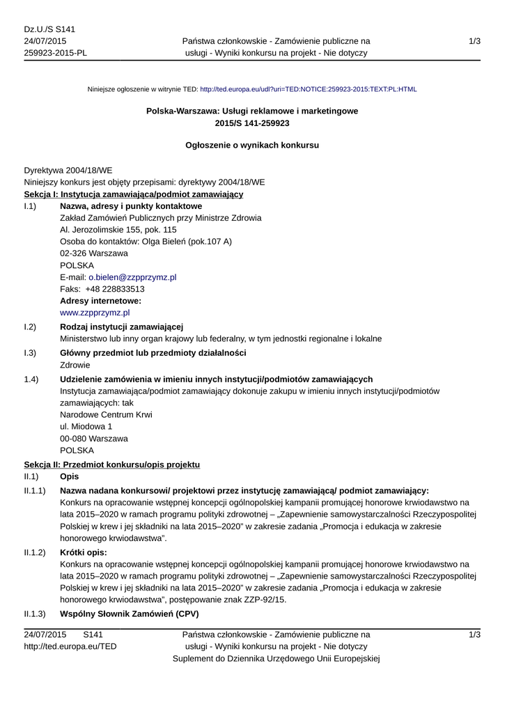 Dz.U./S S141 24/07/2015 259923-2015-PL Państwa członkowskie - Zamówienie publiczne na usługi - Wyniki konkursu na projekt - Nie dotyczy 1/3 Niniejsze ogłoszenie w witrynie TED: http://ted.europa.eu/udl?uri=TED:NOTICE:259923-2015:TEXT:PL:HTML Polska-Warszawa: Usługi reklamowe i marketingowe 2015/S 141-259923 Ogłoszenie o wynikach konkursu Dyrektywa 2004/18/WE Niniejszy konkurs jest objęty przepisami: dyrektywy 2004/18/WE Sekcja I: Instytucja zamawiająca/podmiot zamawiający I.1) Nazwa, adresy i punkty kontaktowe Zakład Zamówień Publicznych przy Ministrze Zdrowia Al. Jerozolimskie 155, pok. 115 Osoba do kontaktów: Olga Bieleń (pok.107 A) 02-326 Warszawa POLSKA E-mail: [email protected] Faks: +48 228833513 Adresy internetowe: www.zzpprzymz.pl I.2) Rodzaj instytucji zamawiającej Ministerstwo lub inny organ krajowy lub federalny, w tym jednostki regionalne i lokalne I.3) Główny przedmiot lub przedmioty działalności Zdrowie 1.4) Udzielenie zamówienia w imieniu innych instytucji/podmiotów zamawiających Instytucja zamawiająca/podmiot zamawiający dokonuje zakupu w imieniu innych instytucji/podmiotów zamawiających: tak Narodowe Centrum Krwi ul. Miodowa 1 00-080 Warszawa POLSKA Sekcja II: Przedmiot konkursu/opis projektu II.1) Opis II.1.1) Nazwa nadana konkursowi/ projektowi przez instytucję zamawiającą/ podmiot zamawiający: Konkurs na opracowanie wstępnej koncepcji ogólnopolskiej kampanii promującej honorowe krwiodawstwo na lata 2015–2020 w ramach programu polityki zdrowotnej – „Zapewnienie samowystarczalności Rzeczypospolitej Polskiej w krew i jej składniki na lata 2015–2020” w zakresie zadania „Promocja i edukacja w zakresie honorowego krwiodawstwa”. II.1.2) Krótki opis: Konkurs na opracowanie wstępnej koncepcji ogólnopolskiej kampanii promującej honorowe krwiodawstwo na lata 2015–2020 w ramach programu polityki zdrowotnej – „Zapewnienie samowystarczalności Rzeczypospolitej Polskiej w krew i jej składniki na lata 2015–2020” w zakresie zadania „Promocja i edukacja w zakresie honorowego krwiodawstwa”, postępowanie znak ZZP-92/15. II.1.3) Wspólny Słownik Zamówień (CPV) 24/07/2015 S141 http://ted.europa.eu/TED Państwa członkowskie - Zamówienie publiczne na usługi - Wyniki konkursu na projekt - Nie dotyczy Suplement do Dziennika Urzędowego Unii Europejskiej 1/3 Dz.U./S S141 24/07/2015 259923-2015-PL Państwa członkowskie - Zamówienie publiczne na usługi - Wyniki konkursu na projekt - Nie dotyczy 2/3 79340000 Sekcja IV: Procedura IV.1) Informacje administracyjne IV.1.1) Numer referencyjny nadany sprawie przez instytucję zamawiającą: ZZP-92/15 IV.1.2) Informacje dotyczące poprzednich publikacji Poprzednie publikacje dotyczące tego samego konkursu: tak Numer ogłoszenia w Dz.U.: 2015/S 81-144548 z dnia 25.4.2015 Sekcja V: Wyniki konkursu Nr: 1 Nazwa: Nagroda – zaproszenie do negocjacji w trybie z wolnej ręki V.1) Przyznanie i nagrody V.1.1) Liczba uczestników: 9 V.1.2) Liczba uczestników z zagranicy: V.1.3) Nazwy i adresy zwycięzców konkursu Agencja Reklamowa DSK Sp. z o.o. ul. Bielawska 6, lok. 3 02-511 Warszawa POLSKA E-mail: [email protected] Tel.: +48 225257146 Faks: +48 222036195 V.1.4) Wartość nagród Sekcja VI: Informacje uzupełniające VI.1) Informacje o funduszach Unii Europejskiej Konkurs związany z projektem i/lub programem finansowanym ze środków Unii Europejskiej: nie VI.2) Informacje dodatkowe: VI.3) Procedury odwoławcze VI.3.1) Organ odpowiedzialny za procedury odwoławcze Urząd Zamówień Publicznych ul. Postępu 17a 02-676 Warszawa POLSKA E-mail: [email protected] Tel.: +48 224587801 Adres internetowy: http://www.uzp.gov.pl Faks: +48 224587800 VI.3.2) Składanie odwołań Dokładne informacje na temat terminów składania odwołań: Zgodnie z art. 182 ustawy z 29.1.2004 Prawo zamówień publicznych (Dz.U. z 2013 r., poz.907 z późn. zm.). VI.3.3) Źródło, gdzie można uzyskać informacje na temat składania odwołań 24/07/2015 S141 http://ted.europa.eu/TED Państwa członkowskie - Zamówienie publiczne na usługi - Wyniki konkursu na projekt - Nie dotyczy Suplement do Dziennika Urzędowego Unii Europejskiej 2/3 Dz.U./S S141 24/07/2015 259923-2015-PL VI.4) Państwa członkowskie - Zamówienie publiczne na usługi - Wyniki konkursu na projekt - Nie dotyczy 3/3 Data wysłania niniejszego ogłoszenia: 21.7.2015 24/07/2015 S141 http://ted.europa.eu/TED Państwa członkowskie - Zamówienie publiczne na usługi - Wyniki konkursu na projekt - Nie dotyczy Suplement do Dziennika Urzędowego Unii Europejskiej 3/3