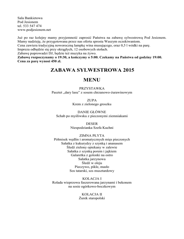 zabawa sylwestrowa 2015 menu - SALA BANKIETOWA