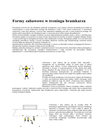 Formy zabawowe w treningu bramkarza Prezentacja ćwiczeń nie ma charakteru jednostki treningowej a jest jedynie zbiorem przykładowych zadań do wykorzystania w czasie budowania treningu dla bramkarza. Część z nich można wykorzystać w elementach rozgrzewki, część fazie głównej, a jeszcze inne znakomicie spełniają swą rolę w części końcowej treningu. Do trenera należy prawidłowe ich wkomponowanie w stworzone przez siebie zajęcia dla golkiperów. Wybór tych przykładów nastąpił świadomie na bazie kilkunastoletniej praktyki autora w pracy z bramkarzami. Zawodnicy grający na tej pozycji są często równie specyficzni jak pozycja, na której występują. Dlatego chętnie i często przelewają na treningach pot byleby tylko udoskonalić swą grę. Pamiętajmy jednak, że to nie ilość potu warunkuje prawidłowy trening i rozwój zawodnika. Budować warsztat jego bramkarskiego rzemiosła można również dając mu okazję do rywalizacji, uśmiechu czy spontanicznych zachowań. Dla człowieka narażonego w meczu na dziesiątki sytuacji wymagających brawury i odwagi takie elementy treningu wydają się być nieodzowne. Budując jednostkę treningową, również z przedstawionymi w tym opracowaniu elementami zabaw pamiętajmy o zabezpieczeniu dla ćwiczących warunków bezpieczeństwa a nade wszystko nie powielajmy błędów popełnianych w wielu klubach gdzie bramkarze pozostawieni są sami sobie. Ustawienie i plac zabawy jak na rysunku obok. Znaczniki i chorągiewki nie są potrzebne, chyba, że trener uzna, iż należy ograniczyć pole zabawy. Ćwiczy jednocześnie dwóch bramkarzy. Zawodnik A trzyma w wyprostowanych na bok rękach dwie piłki. Drugi, bramkarz B staje twarzą do niego w odległości 1,5 m. W dowolnej kolejności (niekoniecznie na przemian) bramkarz A upuszcza jedną z piłek, którą B musi złapać bez upadku zanim zetknie się z podłożem. Po kilku chwytach utrudniamy ćwiczenie przez zadanie dla bramkarza A, który ma markować upuszczenie jednej z piłek wykonując ruchy podobne do szalkowej wagi. Po chwili zwiększamy nieco odległość między bramkarzami tak aby ćwiczący wykonywał chwyty upuszczanych piłek z upadkiem. Bramkarze ćwiczą na przemian. Zabawa kształtuje refleks, zdolność postrzegania i reakcji, znakomicie spełnia swą rolę w końcowej fazie treningu, gdy zależy nam na poprawieniu koncentracji ćwiczących. Jednocześnie daje bramkarzom sporo zadowolenia i uśmiechu gdy mogą narzucić koledze kolejność działań. Ustawienie i plac zabawy jak na rysunku obok. W prostokącie ograniczonym znacznikami ćwiczący bramkarze ustawieni w rozsypce. Jeden z nich z piłka w rękach. W zależności od polecenia trenera podrzuca bądź uderza piłkę mocno w górę prostym podbiciem. Wywołuje przy tym imię kolegi, który ma chwycić piłkę i powtórzyć czynność. Uderzający bądź podrzucający może również nie wywoływać następnego zawodnika, pozostawiając całej trójce walkę o piłkę. Ustawienie i plac zabawy jak na rysunku obok. Każdy zespół złożony z dwóch bramkarzy. Boisko ograniczone jest z jednej strony chorągiewkami z drugiej znacznikami. Podzielone jest linią stworzoną z 10-12 piłek na dwie połowy. Na połowie boiska należącej do drużyny „złodziei” wyznaczamy z znaczników linię startu odległą od linii piłek o 3 m. Na sygnał trenera oba zespoły: „złodziei” i „goniących” startują w kierunku piłek. Ekipa „złodziei” ma za zadanie zabrać dowolne dwie piłki i uciec z nimi w kierunku chorągiewek. Rywale – drużyna „goniących” w tym czasie stara się chwycić uciekających. Jeśli uda im się to przed linią wyznaczoną z chorągiewek otrzymują punkt za każdego schwytanego „złodzieja”. Zabawę powtarzamy 3-4 razy po czym zespoły zamieniają się rolami. Ustawienie i plac ćwiczenia jak na rysunku. Bramkarz A w bramce w postawie bramkarskiej przygotowany do obrony strzału. Bramkarz B przed nim w odległości 2-3 m. Trener w odległości 11-12 m od bramki oddaje strzały w kierunku bramki tak, by golkiperowi A umożliwić skuteczny chwyt bez upadku. Bramkarz B stara się w tym czasie absorbować uwagę bramkarza A przez zastawianie pola widzenia. Po serii 8-10 strzałów trener uderza kolejne 6-8 razy w światło bramki jednak tak by umożliwić skuteczną obronę. Po przerwie odpoczynkowej trener uderza piłkę kolejne 8-10 razy wprost w broniącego zawodnika A mocno po ziemi tak by umożliwić mu skuteczną obronę piłki nogami. Zadanie bramkarza B w dalszym ciągu się nie zmienia. Po tych trzech seriach bramkarze zamieniają się rolami. Rozpoczęcie kolejnej fazy zabawy polega na zmianie zadań dla bramkarza, który absorbuje uwagę broniącego kolegi. Bramkarze ustawieni jak na rysunku. Trener zagrywa tym razem piłkę ręką na wysokości bioder bramkarza B, który otwartą dłonią przepycha piłkę za siebie zmieniając tor jej lotu. Bramkarz A ćwicząc w ten sposób refleks stara się zagrodzić piłce drogę do bramki. Po 10-12 powtórzeniach bramkarze zamieniają się rolami. Ustawienie i plac zabawy jak na rysunku obok. Przed bramkarzem rozsypane w dowolnej konfiguracji 12-16 piłek. Ważne jednak by znajdowały się one w miarę blisko siebie. Trener uderza piłkę nogą bądź rzuca ręką tak by trafiła ona w grupę leżących piłek. Zadaniem bramkarza jest zagrodzić dostęp do bramki możliwie wielu toczącym się do niej piłkom. Ćwiczenie należy powtórzyć w różnych sektorach bramki, zwiększając i zmniejszając odległość od bramki uderzającego w jej kierunku trenera. Ćwiczenie w znakomity sposób kształtuje refleks i zachowania w obronie sytuacyjnej. Ustawienie i plac zabawy jak na rysunku obok. W zależności od dyspozycji trenera bramkarze posiadają piłki lub ćwiczą bez nich. Bramkarze A i D według własnej inwencji wymyślają dowolną czynność – ćwiczenie, ruch lub gest. Zadaniem bramkarzy B i C jest wy