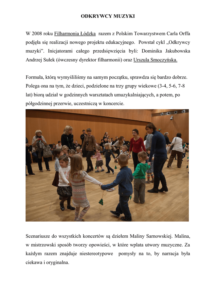 ODKRYWCY MUZYKI W 2008 roku Filharmonia Łódzka razem z Polskim Towarzystwem Carla Orffa podjęła się realizacji nowego projektu edukacyjnego. Powstał cykl „Odkrywcy muzyki”. Inicjatorami całego przedsięwzięcia byli: Dominika Jakubowska Andrzej Sułek (ówczesny dyrektor filharmonii) oraz Urszula Smoczyńska. Formuła, którą wymyśliliśmy na samym początku, sprawdza się bardzo dobrze. Polega ona na tym, że dzieci, podzielone na trzy grupy wiekowe (3-4, 5-6, 7-8 lat) biorą udział w godzinnych warsztatach umuzykalniających, a potem, po półgodzinnej przerwie, uczestniczą w koncercie. Scenariusze do wszystkich koncertów są dziełem Maliny Sarnowskiej. Malina, w mistrzowski sposób tworzy opowieści, w które wplata utwory muzyczne. Za każdym razem znajduje niestereotypowe ciekawa i oryginalna. pomysły na to, by narracja była Potem scenariusz trafia na nasze poczty mailowe i burza mózgów jak potężny front atmosferyczny przechodzi na nas. Teraz my w twórczym rozedrganiu myślimy: co by tu zrobić?, czego jeszcze nie było?, jaką wybrać muzykę do zabawy z dziećmi, a jaką na finał?, jakie będą rekwizyty? Przypominamy sobie, że: były już bibułki, wstążki, chusteczki, tubki po ręcznikach papierowych pudła, kartony, pompony, balony, patyki, butelki, trąbki, bombki, organki, kastaniety, bębenki, kołatki, dzwoneczki…. Co zrobić, żeby się nie narobić, ale żeby to coś efektownie wyglądało na scenie? Każdemu z 55 dzieci trzeba dać rekwizyt do ręki. Wreszcie jest !!! Po jakimś czasie (różnie to bywa czasem zajmuje to kilka dni) pojawia się oryginalny pomysł na zajęcia i analizy merytoryczno- dydaktycznej, i metodycznie go przeprowadzić. czyli prezentację. Potem jeszcze trzeba dokonać przemyśleć jak ślicznie Wtedy pracujemy nad konspektem warsztatów, zgrywamy muzykę, wykonujemy rekwizyty (maluchy najczęściej dostają do ręki gotową rzecz, starsi odkrywcy w trakcie zajęć przygotowują pomoce sami). Jak już wszystko mamy, to pojawia się pytanie: w co się ubierzemy? Czasem przebieramy się w piratów, grające szafy, postaci z bajek, pajacyki… Sami zobaczcie. Tematyka warsztatów związana jest zawsze z koncertem. Dzieci podczas zajęć bawią się, tańczą, śpiewają, grają na instrumentach perkusyjnych, poznają „z bliska” instrumenty koncertowe i przygotowują krótki występ. Chcemy przekonać najmłodszych, że muzyka nie musi być trudna i nudna, i że może okazać się wspaniałą przygodą. Koncert kończy się prezentacją każdej z trzech grup. Mali artyści mają okazję zaprezentować się przed rówieśnikami, rodzicami, czy dziadkami i robią to naprawdę z wielkim przejęciem i zaangażowaniem. Nasi odkrywcy bardzo chętnie biorą też udział w konkursach. W zeszłym sezonie otrzymaliśmy kilkadziesiąt pięknych prac pt. „Muzykalna mama”. Wszystkie portrety i prace przestrzenne, które zostały wykonane w domu były zaprezentowane podczas koncertu na ekranie multimedialnym a młodzi twórcy otrzymali nagrody. Ekran wykorzystujemy na każdym spotkaniu odkrywców. Puszczamy slajdy, które są ilustracjami zagadek i pojęć muzycznych, a ponadto uatrakcyjniają i ułatwiają małym słuchaczom odbiór muzyki. Od początku projektu autorem wszystkich rysunków (ponad 1500 sztuk!) jest Alek Wałaszewski. Nasz wewnętrzny plebiscyt na najśmieszniejszą ilustrację zdecydowanie wygrało łaciate cielę, o którym śpiewał zespół „Gęsty Kożuch Kurzu”. Oj ino ino, moja Halino, coś mi obiecała to mi zginęło. Obiecałaś mi łaciate cielę, ukradli mi je w tamtom niedzielę. Każdy koncert rozpoczynamy i kończymy piosenką „Odkrywców”, do której słowa napisała Malina Sarnowska, a muzykę skomponował Włodek Struzik. „Gdy zaszczeka pies u bramy, gdy pod butem stuknie kamyk, to muzyczny świat nas woła, wszystko śpiewa dookoła, magię dźwięku odkrywamy. „Odkrywcy Muzyki” to nasz wielki sukces. Już od ośmiu sezonów podczas realizacji kolejnych odcinków pracujemy zawsze zgodnie, wytrwale, cały czas z niestygnącym zapałem, radością i zaangażowaniem. Do tej pory nie powtórzyliśmy ani razu tego samego występu, tego samego koncertu. Przepis na tak udaną współpracę jest możliwy dzięki wspaniałym osobom, które tworzą ekipę ODKRYWCÓW. A należą do niej: Dominika Jakubowska – koordynator projektu z ramienia Filharmonii Łódzkiej (na zdjęciu z wesołym bałwankiem, który mimo gorącej atmosfery nie rozpuścił się podczas koncertu, tylko grał i tańczył razem z dziećmi) oraz grupa bardzo kompetentnych pracowników Filharmonii Łódzkiej a także członkowie Polskiego Towarzystwa Carla Orffa (na zdjęciu od prawej strony) Magda Białek, Mariola Karczewska, Anna Sokołowska- Szumowska, Witek Jarosiński, Marzena Chmielarz-Borowiec, Klaudia Wiśniewska, Malina Sarnowska, Robert i Iza Wałaszewscy Jacek Tarczyński, Iwona Tałałaj Anna Komorowska-Manijak. Wszystkich chętnych zapraszamy na kolejne koncerty. Zajrzyjcie do Filharmonii Łódzkiej, by razem z nami tańczyć, śpiewać, „zbierać różne dźwięki” i razem ze wszystkimi ODKRYWCAMI poznawać tajemnice muzyki.