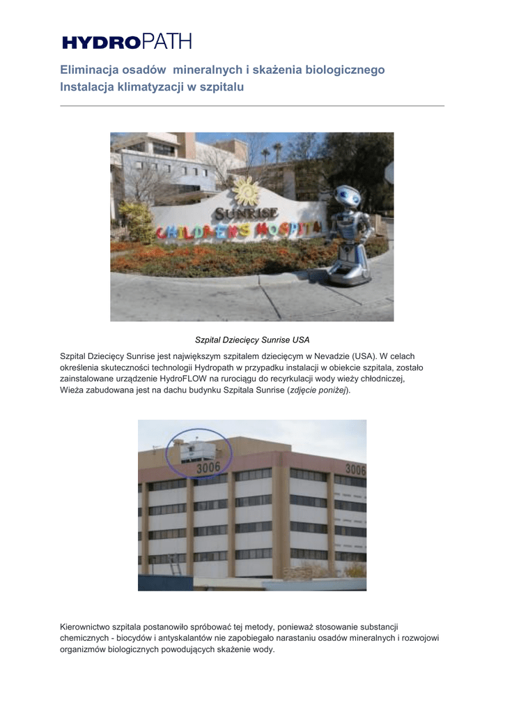 Eliminacja osadów mineralnych i skażenia biologicznego Instalacja klimatyzacji w szpitalu Szpital Dziecięcy Sunrise USA Szpital Dziecięcy Sunrise jest największym szpitalem dziecięcym w Nevadzie (USA). W celach określenia skuteczności technologii Hydropath w przypadku instalacji w obiekcie szpitala, zostało zainstalowane urządzenie HydroFLOW na rurociągu do recyrkulacji wody wieży chłodniczej, Wieża zabudowana jest na dachu budynku Szpitala Sunrise (zdjęcie poniżej). Kierownictwo szpitala postanowiło spróbować tej metody, ponieważ stosowanie substancji chemicznych - biocydów i antyskalantów nie zapobiegało narastaniu osadów mineralnych i rozwojowi organizmów biologicznych powodujących skażenie wody. Twarde osady mineralne na lamelach wkładu wieży chłodniczej Efekty już w pierwszych tygodniach od zainstalowania urządzenia HydroFLOW były obiecujące. Twardy osad wapienny występujący na powierzchniach wymiany ciepła wieży zaczął stopniowo oddzielać się. Spowodowało to widoczny wzrost mętności wody w niecce ociekowej wieży. Zaobserwowano również, na bieżąco kontrolowany spadek poziomu całkowitej liczby bakterii w wodzie. Mętna woda i muł powstały w wyniku usunięcia twardych osadów Elementy wieży chłodniczej pozbawione osadów mineralnych Po trzech miesiącach pracy urządzenia HydroFLOW, zdecydowano się całkowicie zaprzestać dawkowania środków chemicznych do instalacji wody chłodniczej. Wydłużono również czas pomiędzy wymianami wody w instalacji. Dowód, że osady są w postaci miękkiego łatwo usuwalnego pyłu Po pięciu miesiącach pracy bez środków chemicznych, ściany wieży nie miały już twardych osadów a całkowita liczba bakterii w wodzie nie przekraczała 1000 jtk / ml. Kierownictwo szpitala potwierdziło skuteczność pracy urządzenia HydroFLOW. Mike Panos (CBRE - Penosa, Project Management), "Stacja uzdatniania wody HydroFLOW pomogła nam znacznie obniżyć koszty eksploatacji. Nastąpiło zmniejszenie zużycia środków chemicznych, kosztów utrzymania, energii elektrycznej i wody" Na podstawie materiałów: Hydroflow Holdings USA Ltd.