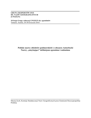 GRUPA EKSPERTÓW ONZ DS. NAZW GEOGRAFICZNYCH (UNGEGN) 10 Sesja Grupy roboczej UNGEGN ds. egzonimów Tainach, Austria, 28-30 kwiecień 2010 Polskie nazwy obiektów podmorskich i z obszaru Antarktyki Nazwy „umykające” definicjom egzonimu i endonimu Maciej Zych, Komisja Standaryzacji Nazw Geograficznych poza Granicami Rzeczypospolitej Polskiej Polskie nazwy obiektów podmorskich i z obszaru Antarktyki Nazwy „umykające” definicjom egzonimu i endonimu Zgodnie z definicją egzonimu, przyjętą przez UNGEGN w 2007 r. na IX Konferencji ONZ w sprawie Standaryzacji Nazw Geograficznych, jest nim nazwa stosowana w danym języku dla obiektu geograficznego znajdującego się poza obszarem, gdzie ten język jest szeroko używany i różniąca się swoją formą od odpowiedniego endonimu (endonimów) obszaru gdzie znajduje się ten obiekt geograficzny. Jednocześnie przyjęto definicję endonimu, zgodnie z którą jest nim nazwa obiektu geograficznego w języku oficjalnym lub dobrze ugruntowanym występującym na obszarze, gdzie znajduje się ten obiekt1. Tak sformułowane definicje egzonimu i endonimu nie obejmują całego szeregu nazw geograficznych, jednocześnie w wielu przypadkach wprowadzają niejednoznaczność w zaliczeniu danej nazwy do egzonimu lub endonimu. Niejednoznaczność w zaliczeniu niektórych nazw do egzonimu lub endonimu wynika z wprowadzenia do definicji języka dobrze ugruntowanego, który różnie może być rozumiany. Czy język dobrze ugruntowany to język, którym posługuje się ludność zamieszkująca dany obszar od pokoleń, czy jest nim także język współczesnych emigrantów, np. turecki w Niemczech, czy polski w Irlandii? Czy językiem dobrze ugruntowanym będzie język, którym posługuje się duża część społeczeństwa, pomimo, że nie jest to tradycyjny język danego obszaru, np. angielski w Holandii, rosyjski w Izraelu? Czy językiem dobrze ugruntowanym musi na danym terenie mówić znaczny odsetek osób, czy też wystarczy aby mówiła nim ograniczona liczba osób? Np. Słowacy są uznaną w Polsce mniejszością narodową, jednak w graniczącym ze Słowacją powiecie nowotarskim, zamieszkanym przez zdecydowaną większość polskich Słowaków (69,9% Słowaków mieszkających w Polsce), językiem słowackim mówi 409 osób (na 794 osoby mieszkające w Polsce deklarujące posługiwanie się językiem słowackim), czyli 0,23% mieszkańców powiatu2. W zależności na odpowiedzi twierdzące lub przeczące na powyższe pytania polskie nazwy obiektów geograficznych znajdujących się w Irlandii, angielskie dla obiektów w Holandii, czy słowackie dla obiektów w południowej Polsce mogą być uznane za egzonimy lub endonimy. Mamy też przypadki, że jeden język jest stosowany w dwóch państwach, jednak nazwy geograficzne w nich stosowane mogą się różnić. Przykładowo język rosyjski jest językiem stosowanym zarówno w Rosji, jak i Kazachstanie – największe miasto Kazachstanu ma w Kazachstanie rosyjską nazwę w postaci Алматы [Almaty]3, natomiast w Rosji stosowana jest dlań nazwa rosyjska w postaci Алма-Ата [Alma-Ata]4. Podobnie język polski jest stosowany przez ludność zamieszkującą okolice Wilna na Litwie (w poszczególnych gminach Polacy stanowią od 40 do 98% mieszkańców), jednak dla niektórych miejscowości litewscy Polacy stosują nazwy inne niż te stosowane w Polsce, np. Mikniszki – nazwa 1 Addendum for Glossary of Terms for the Standardization of Geographical Names, United Nations Secretariat, 2007: http://unstats.un.org/unsd/geoinfo/glossary_add/glossary_add_e.pdf 2 Dane Głównego Urzędu Statystycznego pochodzące ze spisu powszechnego z 2001 r.: http://www.stat.gov.pl/cps/rde/xbcr/gus/PUBL_nsp2002_tabl3_mn.xls 3 Oficjalna strona miasta w wersji rosyjskiej: http://www.almaty.kz/page.php 4 Распоряжение администрации Президента Российской Федерации № 1495 «О написании названий государств – бывших республик СССР и их столиц»: http://law7.ru/base29/part8/d29ru8160.htm 1 stosowana przez Polaków na Litwie i Michnowo – nazwa stosowana w Polsce5. Czy nazwy takie jak Alma-Ata i Michnowo to egzonimy, czy endonimy? Problemy z określeniem jaka nazwa jest endonimem, powodują, że nie zawsze można stwierdzić jaka nazwa jest egzonimem. Obecnie obowiązującym definicjom egzonimu i endonimu „umykają” także nazwy obiektów geograficznych nie posiadających atrybucji, czyli znajdujących się poza suwerennością któregokolwiek z państw. Do takich obiektów zaliczamy obiekty morskie (w szczególności obiekty podmorskie, leżące poza wodami terytorialnymi państw) oraz obiekty znajdujące się na Antarktydzie i obszarach przyległych leżących na południe od 60° (zgodnie z traktatami międzynarodowymi obszary Antarktyki nie należą do żadnego z państw, a wszelkie roszczenia terytorialne pozostają „zamrożone”). Czy można uznać, że skoro jakiś obszar nie posiada żadnego języka oficjalnego, to wszystkie nazwy stosowane dla tego obszaru są egzonimami? Czy może wręcz przeciwnie, skoro nie ma języków oficjalnych, to nie można mówić o istnieniu egzonimów? Na obszarach mórz oraz Antarktyki znajduje się wiele obiektów posiadających nazwy. Nazwy te ponadawane są w różnych językach. Przykładowo na stronie internetowej geonames.de podano nazwę dla Antarktydy w 163 językach6. Czy nazwy te (np. Antáltia, Etelämanner, ʻAneʻālika, Qalasersuaq Kujalleq, Châu Nam Cực) należy zaliczyć do egzonimów, czy też może są one endonimami? A może, jak zwrócił uwagę Naftali Kadmon7, jest to jeszcze jakiś inny rodzaj nazw nie będących ani egzonimami, ani endonimami... Obiekty podmorskie Dla obiektów podmorskich istnieje gazeter GEBCO (General Bathymetric Chart of the Oceans – grupy ekspertów działającej pod auspicjami Międzyrządowej Komisji Oceanograficznej U