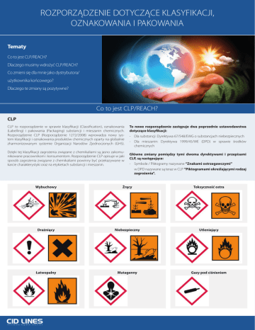 ROZPORZĄDZENIE DOTYCZĄCE KLASYFIKACJI, OZNAKOWANIA I PAKOWANIA Tematy Co to jest CLP/REACH? Dlaczego musimy wdrożyć CLP/REACH? Co zmieni się dla mnie jako dystrybutora/ użytkownika końcowego? Dlaczego te zmiany są pozytywne? Co to jest CLP/REACH? CLP CLP to rozporządzenie w sprawie klasyfikacji (Classification), oznakowania (Labelling) i pakowania (Packaging) substancji i mieszanin chemicznych. Rozporządzenie CLP (Rozporządzenie 1272/2008) wprowadza nowy system klasyfikacji i oznakowania produktów chemicznych oparty na globalnie zharmonizowanym systemie Organizacji Narodów Zjednoczonych (GHS). Dzięki tej klasyfikacji zagrożenia związane z chemikaliami są jasno zakomunikowane pracownikom i konsumentom. Rozporządzenie CLP opisuje w jaki sposób zagrożenia związane z chemikaliami powinny być przekazywane w karcie charakterystyki oraz na etykietach substancji i mieszanin. To nowe rozporządzenie zastępuje dwa poprzednie ustawodawstwa dotyczące klasyfikacji: - Dla substancji: Dyrektywa 67/548/EWG o substancjach niebezpiecznych - Dla mieszanin: Dyrektywa 1999/45/WE (DPD) w sprawie środków chemicznych Główne zmiany pomiędzy tymi dwoma dyrektywami i przepisami CLP, są następujące: - Symbole / Piktogramy nazywane “Znakami ostrzegawczymi” w DPD nazywane są teraz w CLP “Piktogramami określającymi rodzaj zagrożenia”.. Wybuchowy Żrący Toksyczność ostra Drażniący Niebezpieczny Utleniający Łatwopalny Mutagenny Gazy pod ciśnieniem Opis zagrożenia, zgodnie z DPD, wyjaśniony jest za pomocą “Zwrotów wskazujących rodzaj zagrożenia” oraz „Zwrotów bezpiecznego stosowania”. Natomiast, zgodnie z CLP, opis zagrożenia objaśniony jest za pomocą „Haseł ostrzegawczych”, „Zwrotów wskazujących rodzaj zagrożenia” oraz „Zwrotów wskazujących środki ostrożności”. Te elementy są opisane w sekcji 2 Karty Charakterystyki oraz zamieszczone są w treści oznakowania produktu. Etykieta zgodna z DPD Etykieta zgodna z CLP Pomiędzy 01/06/2015 a 01/06/2017: Do dnia 01/06/2017 cały zapas mieszanin wprowadzonych do obrotu przed dniem 01/06/2015 musi zostać zużyty. Od dnia 01/06/2017: wszystkie produkty myjące i biobójcze dostępne na rynku muszą spełniać wymagania rozporządzenia CLP. Bez wyjątków! REACH REACH jest to Rozporządzenie Parlamentu Europejskiego, które zostało opublikowane w czerwcu 2007 roku, całkowicie zmieniające istniejący system zarządzania chemikaliami w Europie. W związku z tym każda nowa oraz już istniejąca substancja musi zostać zarejestrowana (R. –Registred) , oceniona (E. – Evaluated) oraz posiadać pozwolenie na obrót (A. – authorized). Jest to skrót od REACH (Registred-Evaluated-Authorized-Chemical). Dlaczego musimy wdrożyć CLP/REACH? CLP Celem rozporządzenia CLP jest ujednolicenie kryteriów klasyfikacji mieszanin oraz przepisów dotyczących oznakowania i pakowania mieszanin niebezpiecznych (Rozporządzenie 1272/2008). REACH Głównym celem REACH jest zapewnienie: - Wysokiego poziomu ochrony zdrowia ludzkiego i środowiska przed zagrożeniami, które mogą być powodowane przez substancje chemiczne; - Promocja alternatywnych metod badawczych; - Swobodny obrót substancjami na rynku wewnętrznym i poprawie konkurencyjności i innowacyjności Kiedy i w jaki sposób zmiany te zostaną wdrożone? CLP Kosmetyki, dodatki do pasz i produkty lecznicze weterynaryjne są wyłączone z zakresu rozporządzenia CLP. Dla CID LINES rozporządzenie CLP odnosi się do detergentów (produkty myjące) i biocydów. Od teraz do 01/06/2015: Wszystkie nowe produkty będą wprowadzane na rynek z nową klasyfikacją CLP. Dla wszystkich detergentów, zmiana klasyfikacji na CLP będzie wprowadzona przed 01/06/2015. Dla wszystkich biocydów, nowa klasyfikacja zostanie przesłana do Urzędu Rejestracji Produktów Leczniczych, Wyrobów Medycznych i Produktów Biobójczych w Warszawie. W momencie jej akceptacji zostanie wdrożona co nastąpi nie później niż do 01/06/2015. Pomiędzy 01/06/2015 a 01/06/2017: Do dnia 01/06/2017 cały zapas mieszanin wprowadzonych do obrotu przed dniem 01/06/2015 musi zostać zużyty. REACH CID LINES jako formulator nie jest objęty żadnym terminem zgodnie z REACH. Naszym obowiązkiem jest sprawdzenie zgodności każdego surowca z przepisami REACH. W przypadku, gdy surowiec nie jest zgodny, musimy znaleźć rozwiązanie, np. poszukać innego dostawcę lub alternatywnego surowca. Co zmieni się dla mnie jako dystrybutora/użytkownika końcowego? CLP Zmiany w klasyfikacji produktu: W niektórych przypadkach możliwe jest, że klasyfikacja produktu będzie wyższa. Oznacza to, że mieszanina może być bardziej żrącą i wymaga zastosowania większej ilości środków ochronnych względem ludzi, środowiska, miejsca składowania itp. Nowe etykiety: Zgodnie z rozporządzeniem CLP jesteśmy zobligowani do zmiany etykiet biocydów i detergentów z naszej standardowej oferty. Musimy umieścić nowe symbole co oznacza, że rozmiar i kolory symboli ulegną zmianie. Aktualne rejestracje produktów biobójczych w poszczególnych krajach zostaną zaktualizowane: W każdym kraju, w którym CID LINIES wprowadza do obrotu zarejestrowany produkt biobójczy (biocyd), zostanie wysłane dossier z zaktualizowaną klasyfikacją do stosownego organu wydającego decyzje. REACH Stężenie produktów może ulec zmianie: Dla każdego stężenia/aplikacji przeprowadzony będzie test w celu weryfikacji zastosowania oraz uzyskanego wyniku. Dlatego bardzo ważne jest to, aby przestrzegać standardowych stężeń, które są sprawdzone przez analizy przeprowadzone w naszym laboratorium. MSDS zmienia się E-SDS: E-SDS to nowa wersja karty charakterystyki, która będzie miała więcej treści i więcej stron. Prowadzi to do zapewnienia większego bezpieczeństwa. Doradca CID LINES chętnie pomoże Państwu w odpowiedzi na wszelkie pytania lub wątpliwości! Dlaczego te zmiany są pozytywne? Kwestie bezpieczeńs